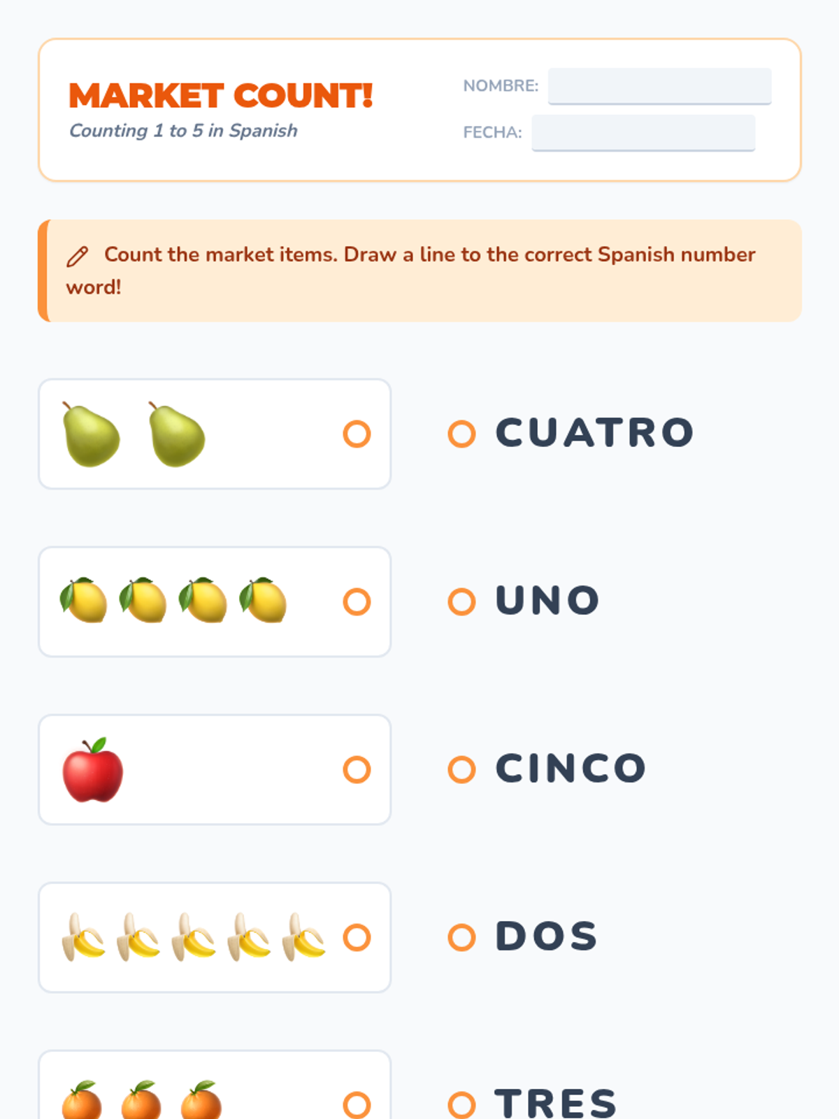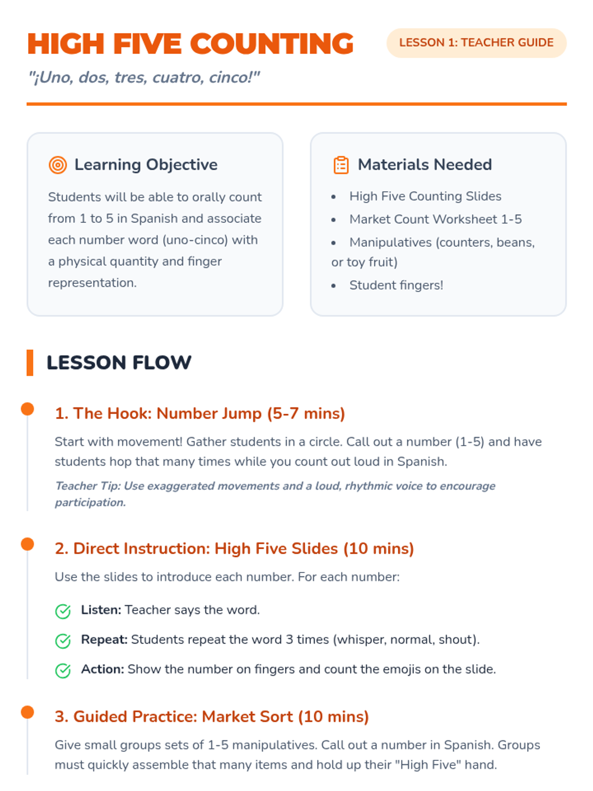 A beginner Spanish sequence for 1st graders focused on numbers 1-10 and basic transactional language. Students use a market-themed project to practice counting, asking 'how many', and requesting items politely.