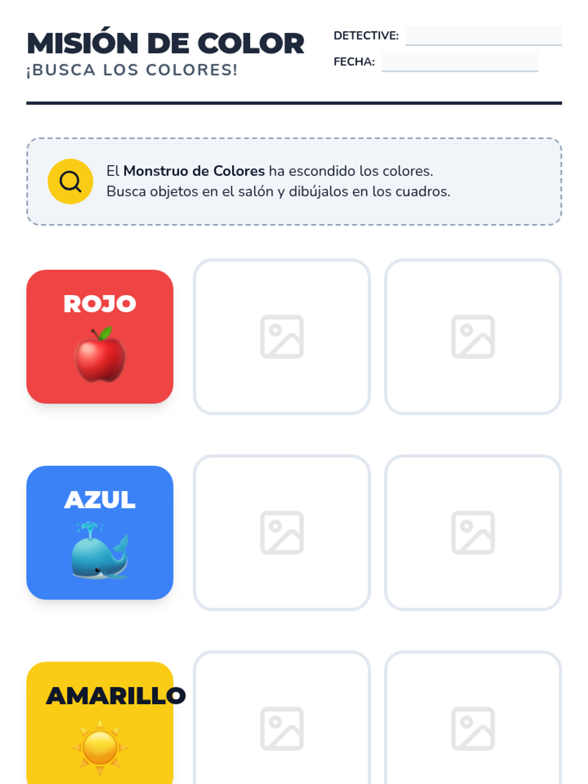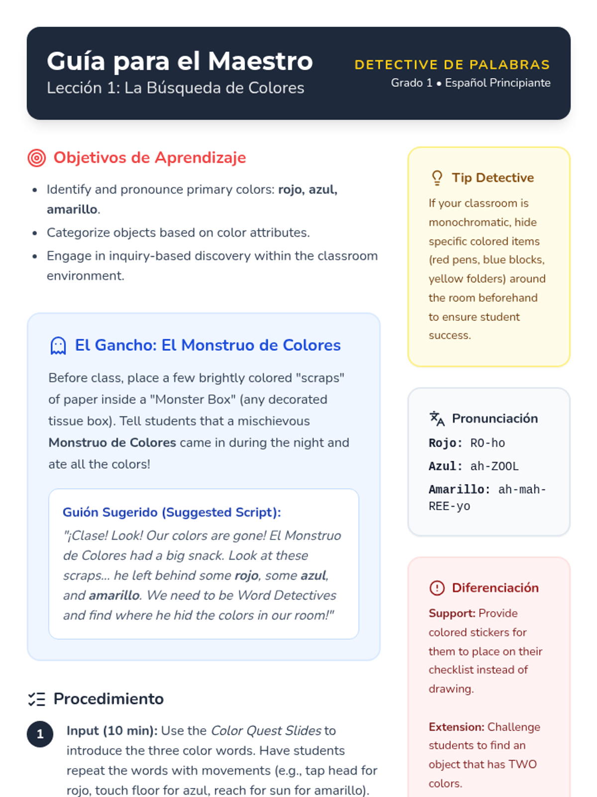 An inquiry-based Spanish sequence for 1st graders focusing on colors and classroom objects. Students become 'Word Detectives' to identify and describe their world using basic nouns and adjectives.
