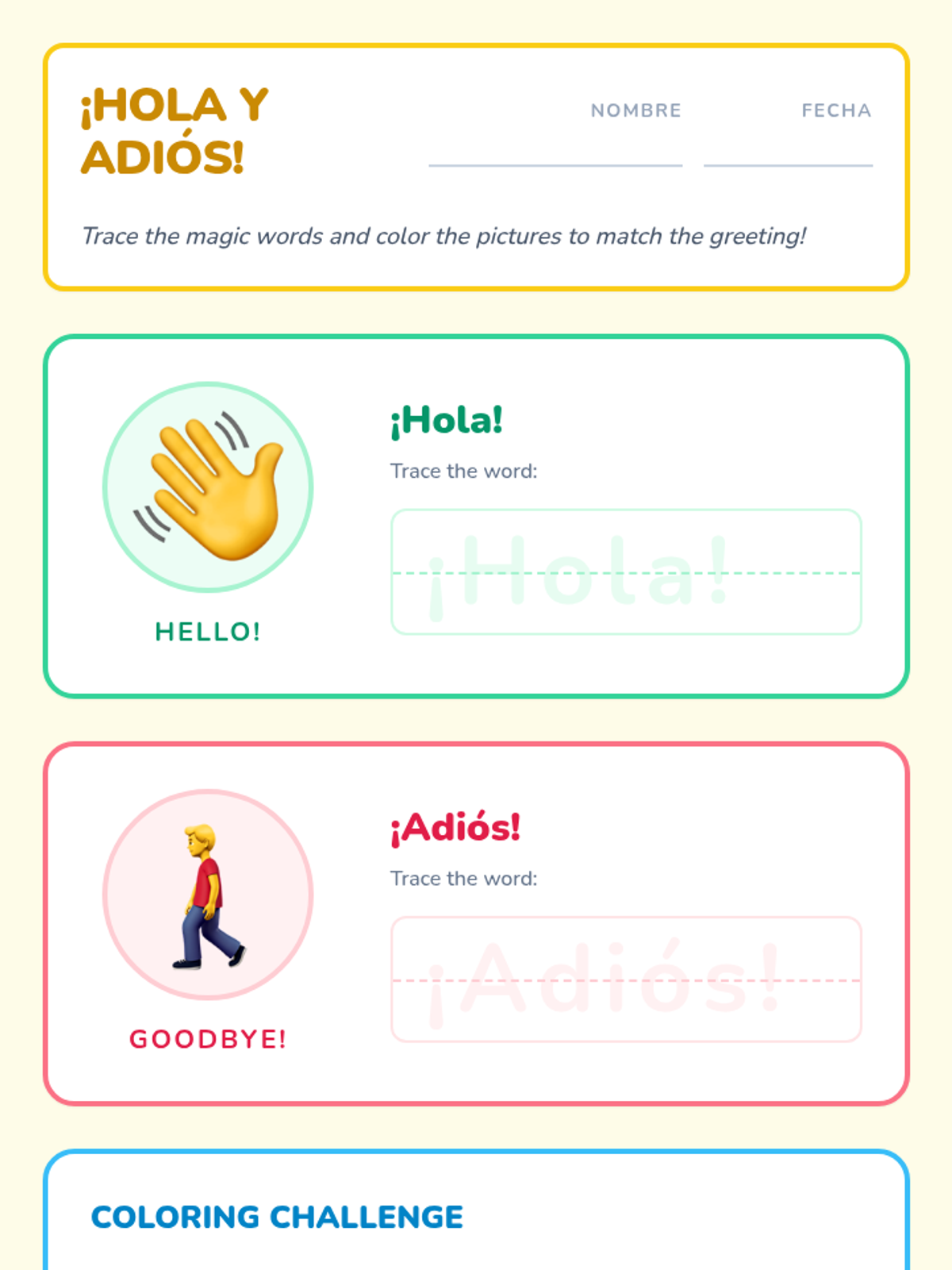 This foundational sequence introduces 1st Grade students to basic Spanish greetings, introductions, and politeness markers through interactive games, songs, and role-play. Students move from simple recognition of 'Hola' and 'Adiós' to performing a complete introductory dialogue.