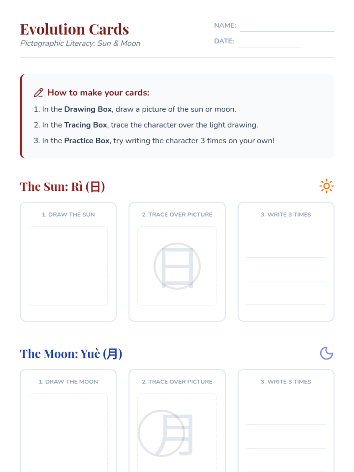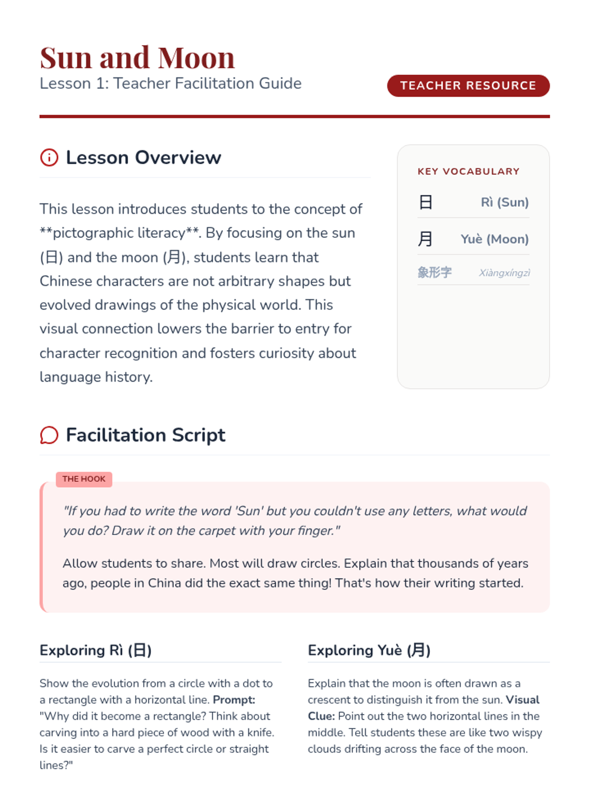 Students explore the origins of Chinese characters by connecting them to illustrations of the natural world. This inquiry-based sequence helps students visualize the evolution from ancient pictographs to modern Hanzi, focusing on high-frequency nature words like sun, moon, water, fire, tree, and mountain.