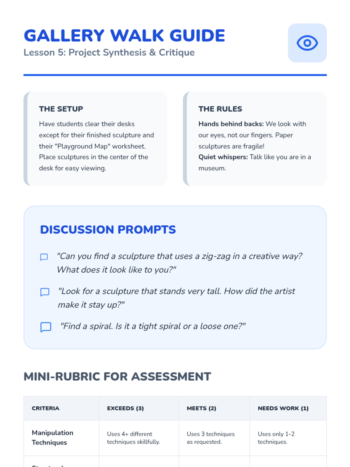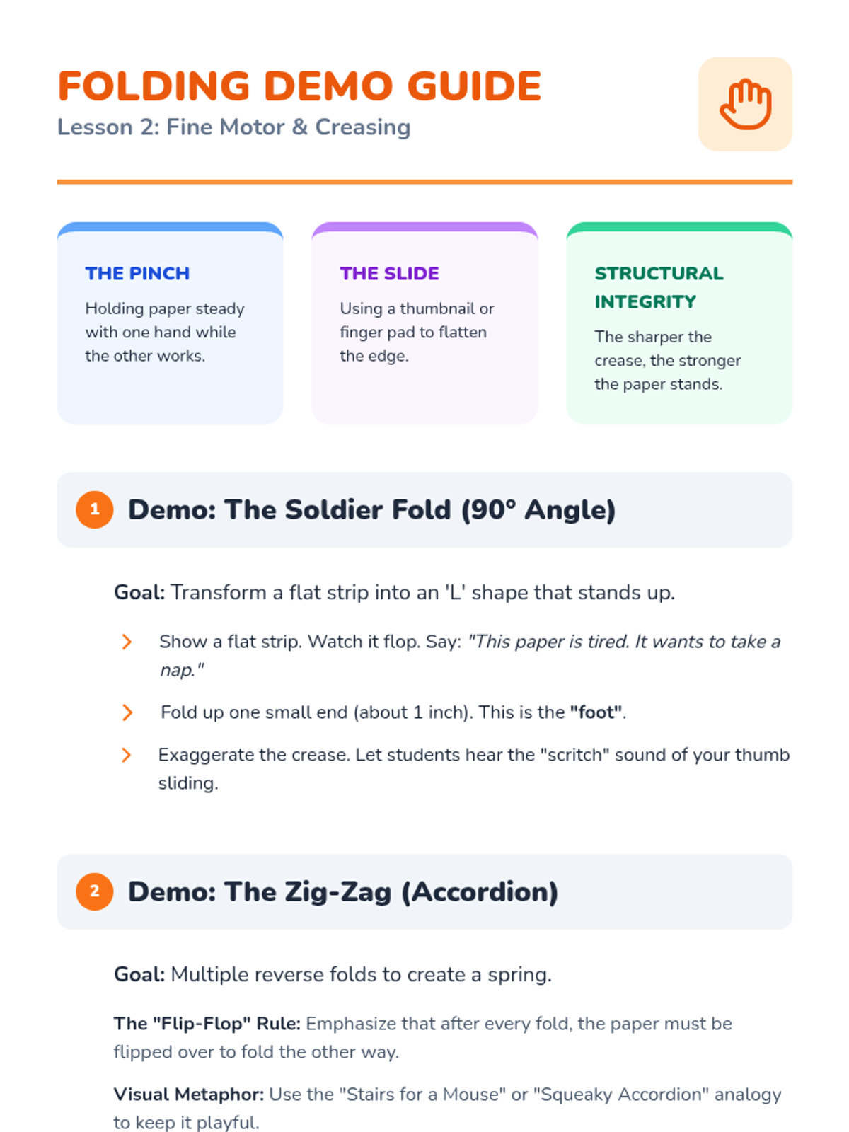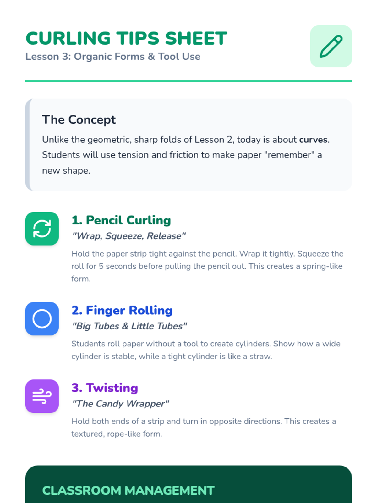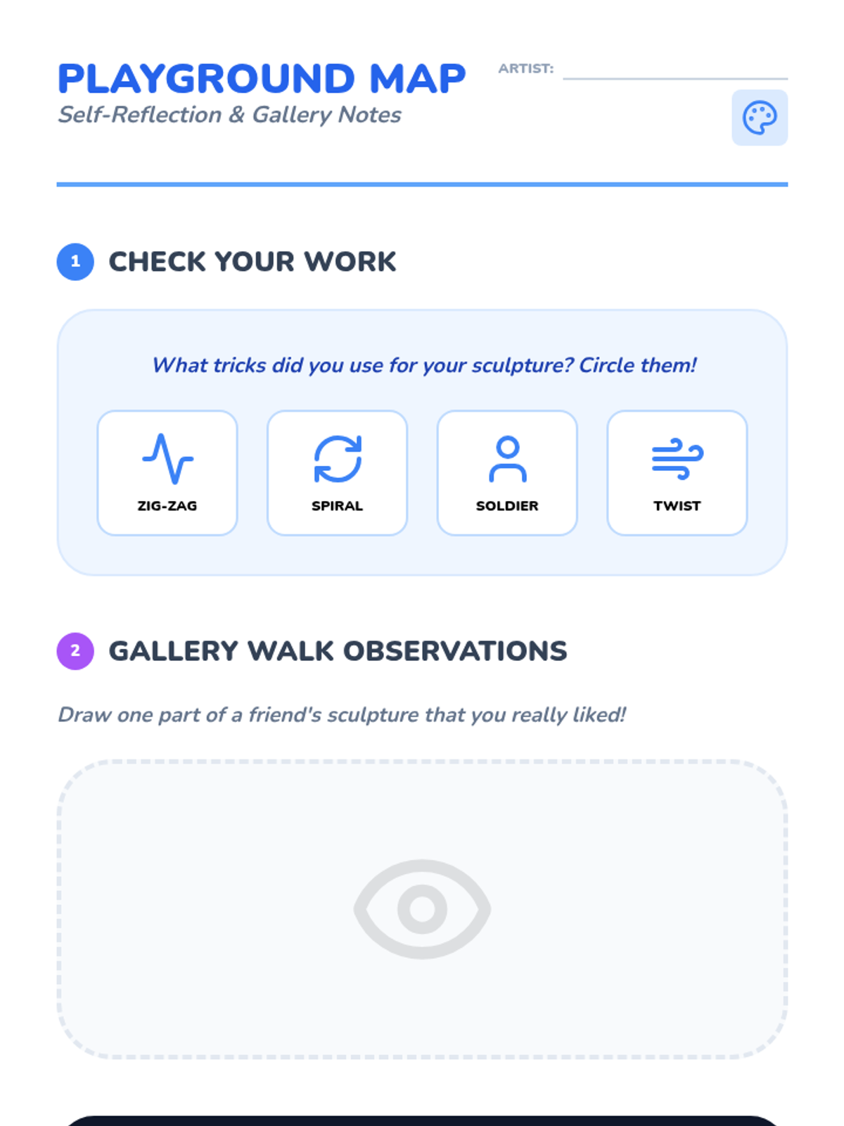 A foundational art sequence for 1st graders exploring the transition from 2D paper to 3D sculpture. Students learn folding, curling, and attachment techniques to build their own paper playgrounds.