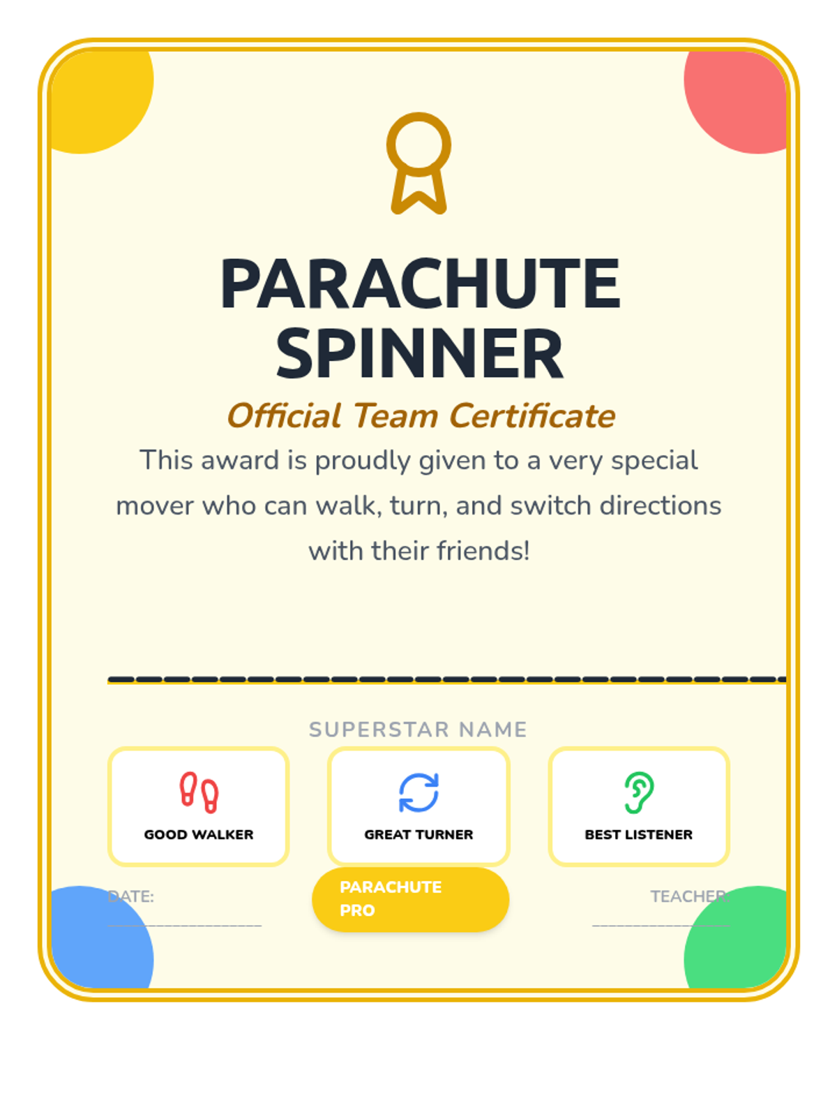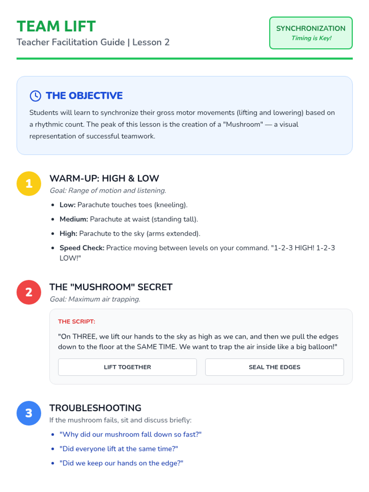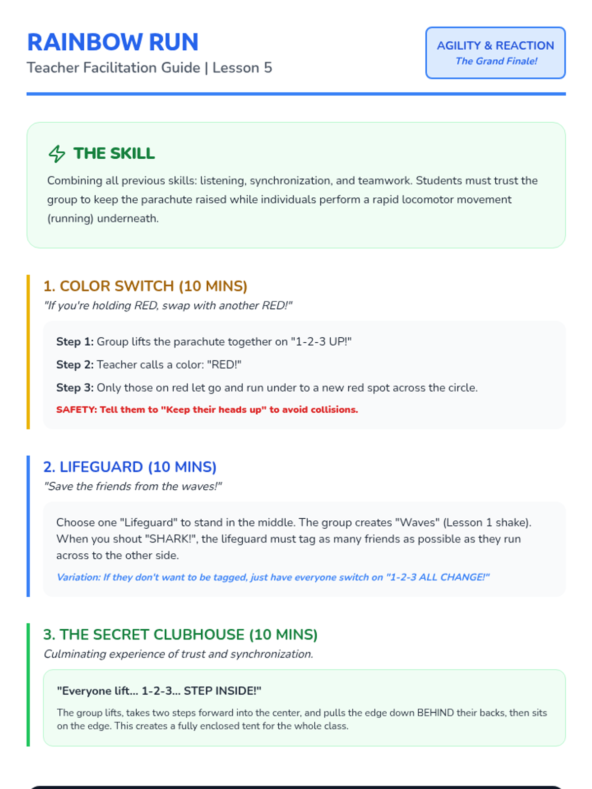 A 5-lesson sequence for Pre-K students focusing on gross motor skills, listening, and cooperation through parachute play. Students move from basic safety and handling to complex synchronized movements and team games.