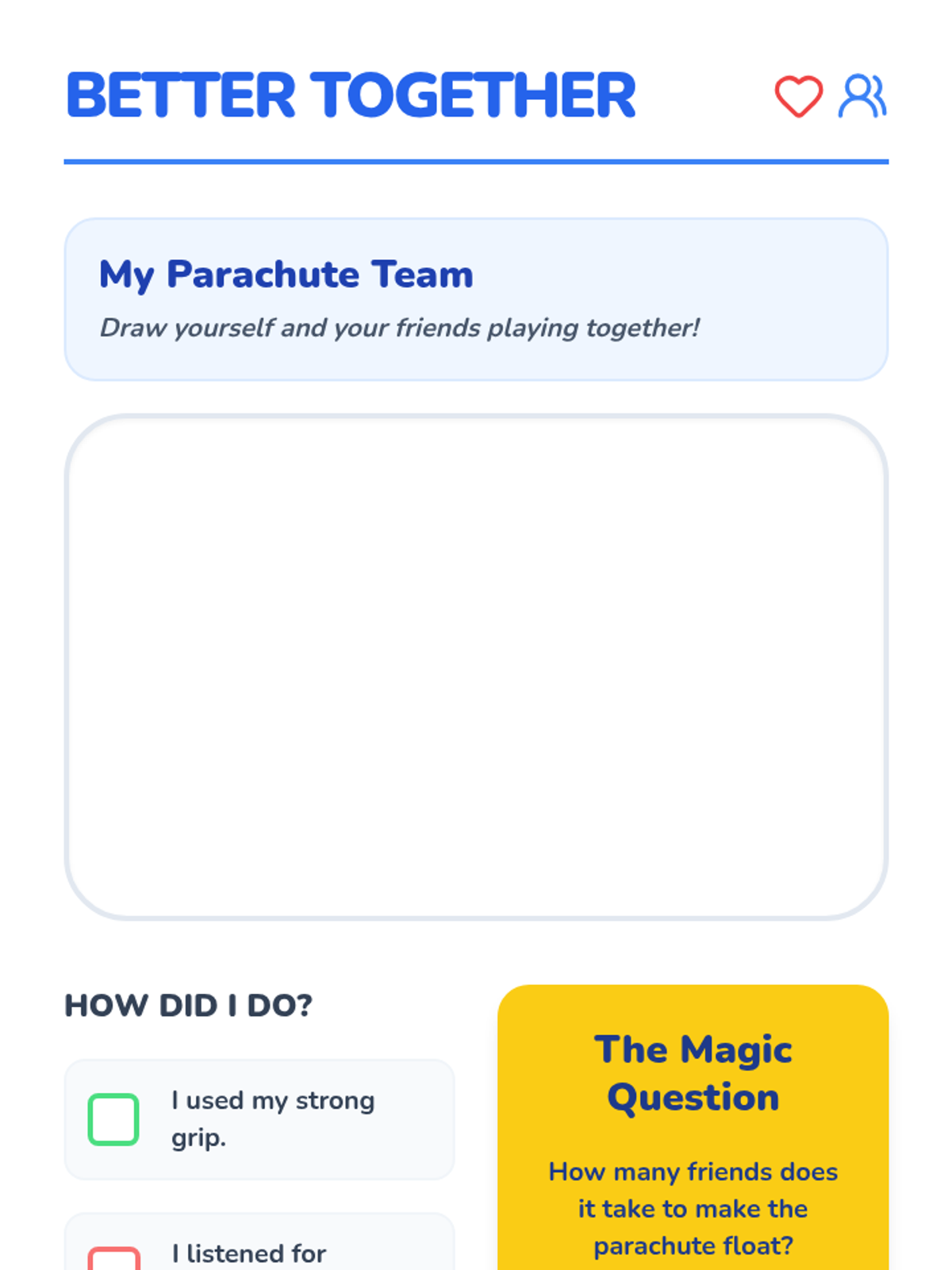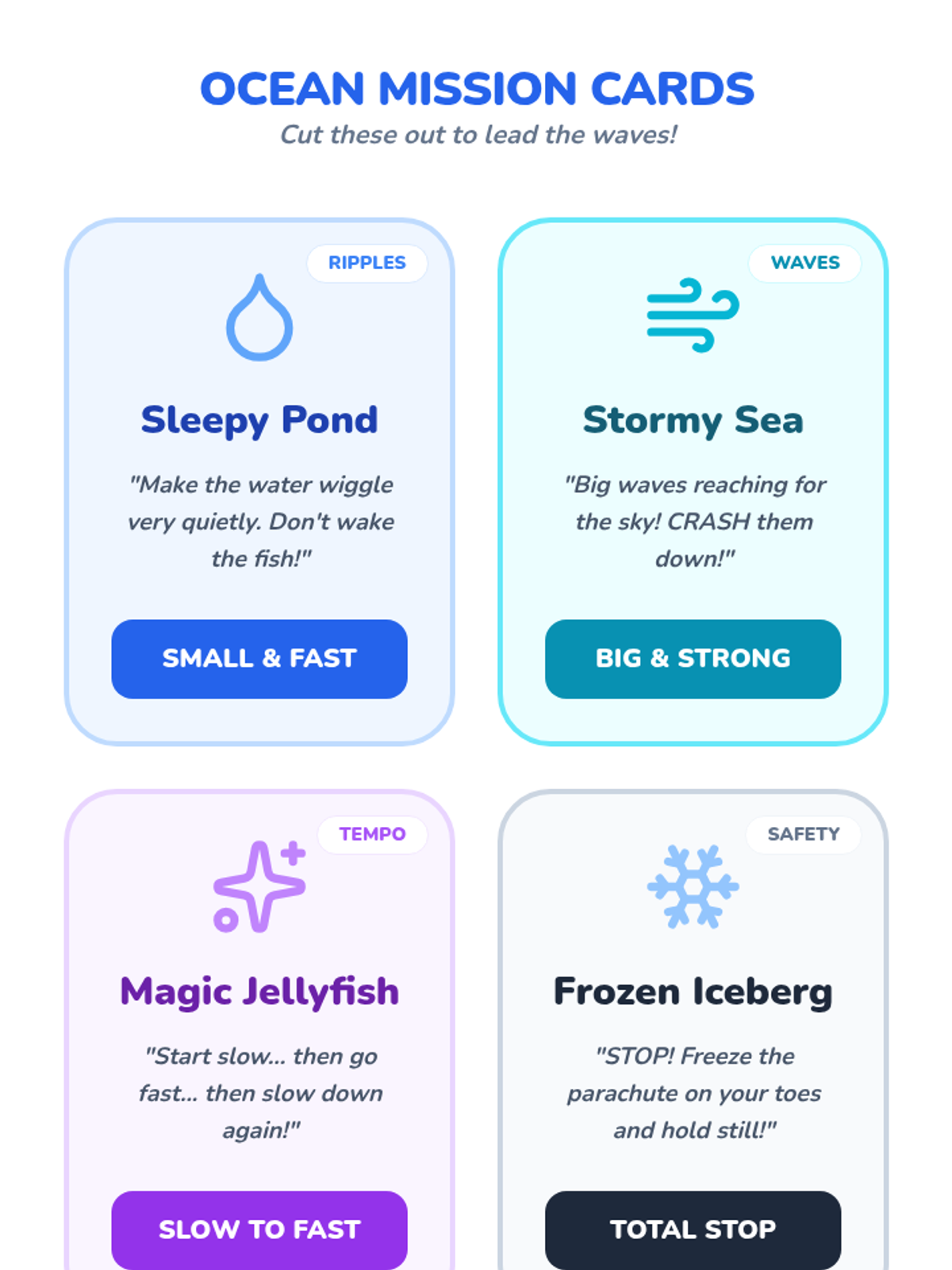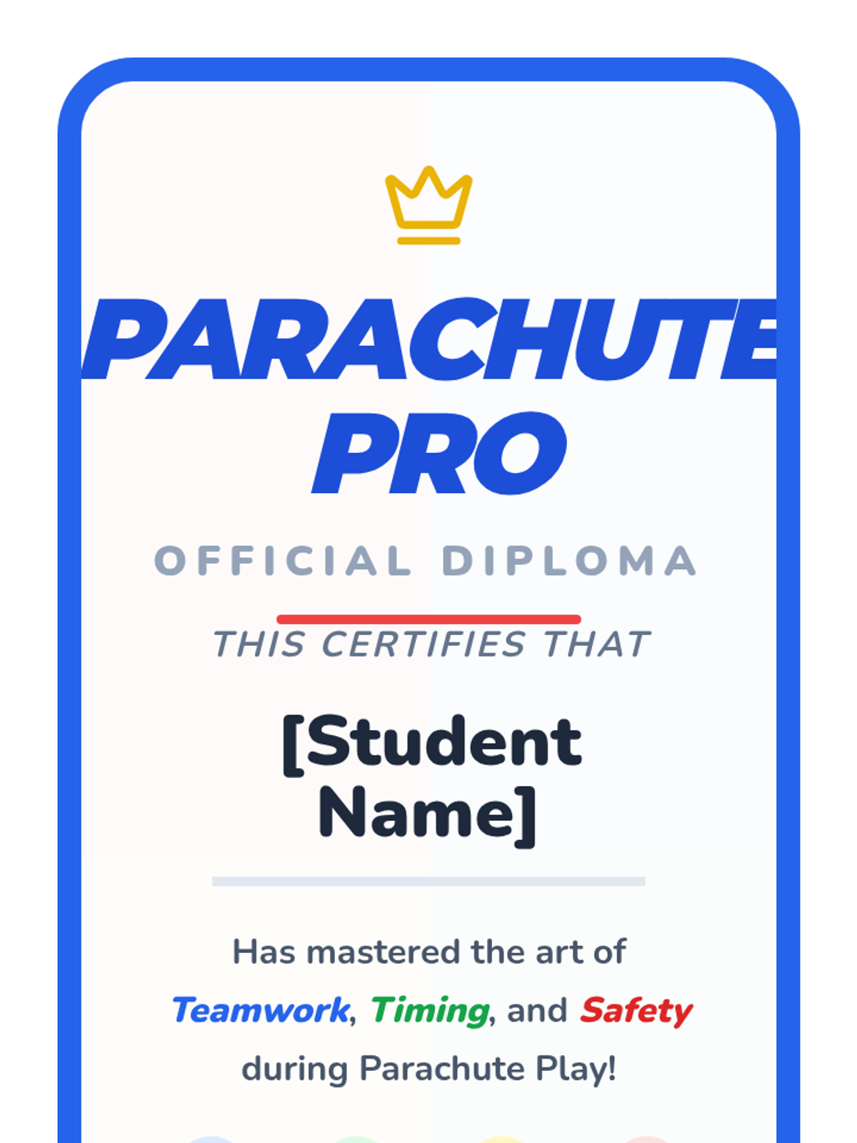 A Kindergarten physical education sequence focused on parachute play to develop group synchronization, listening skills, and cooperative movement. Students progress from basic safety and grips to complex group maneuvers like waves, domes, and object tracking.