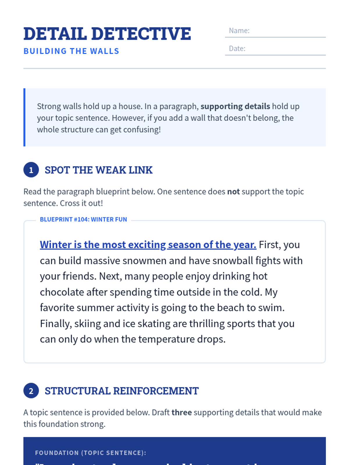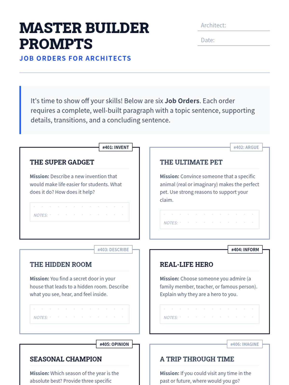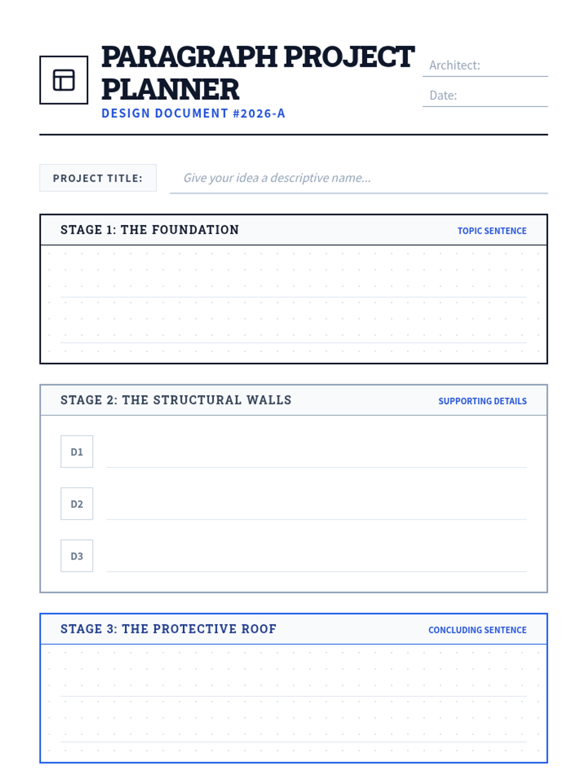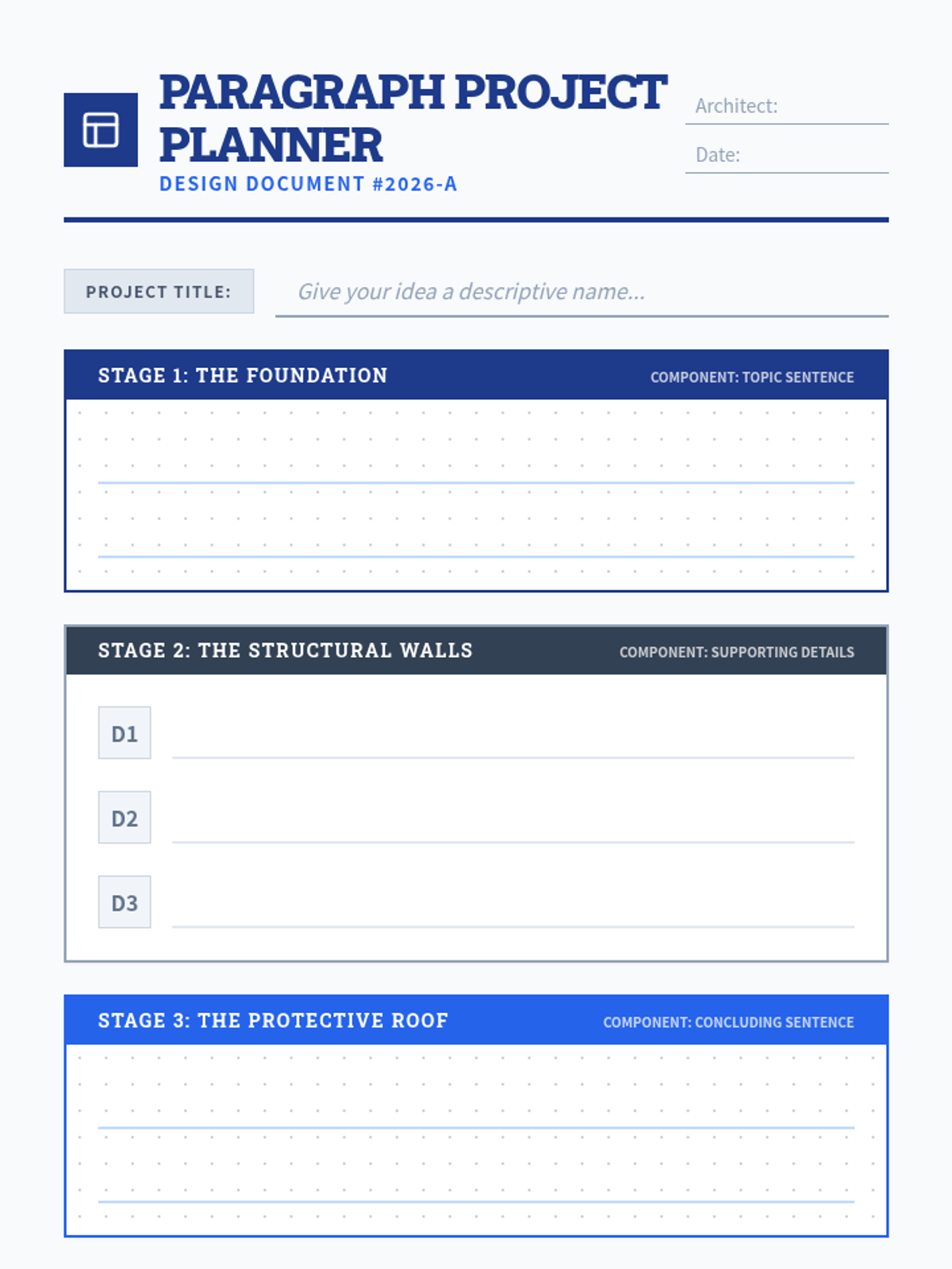 A comprehensive 2-week unit introducing students to the core components of paragraph writing, from topic sentences to concluding statements and transitions. The unit uses an architectural 'blueprint' theme to help students visualize the structure of their writing.