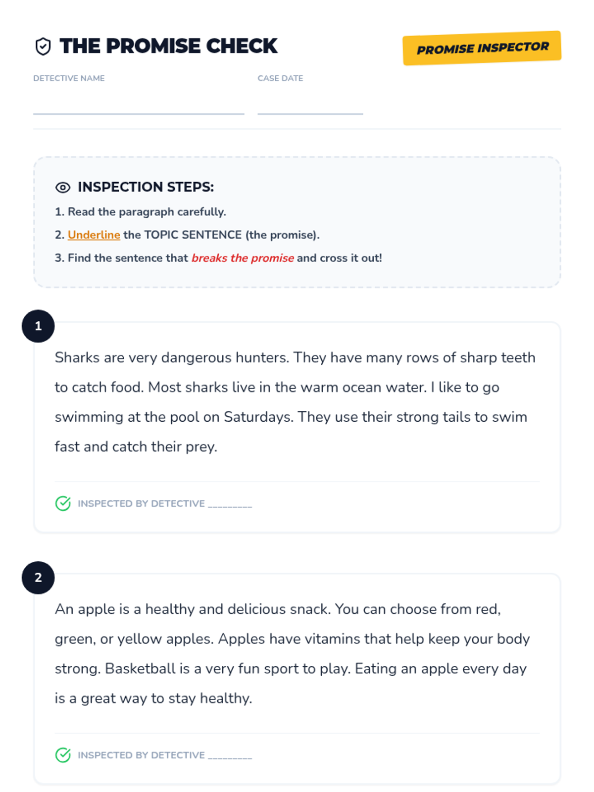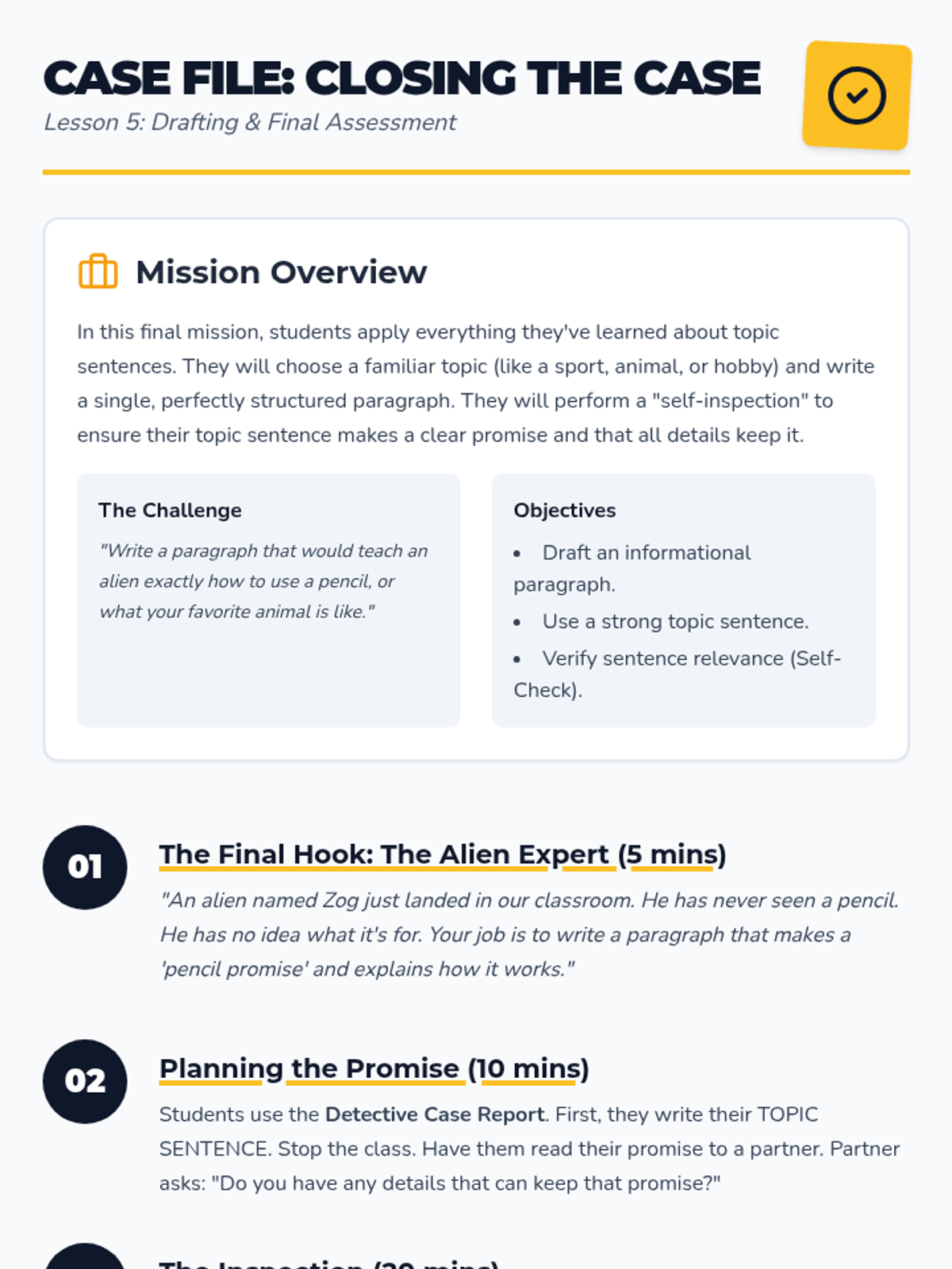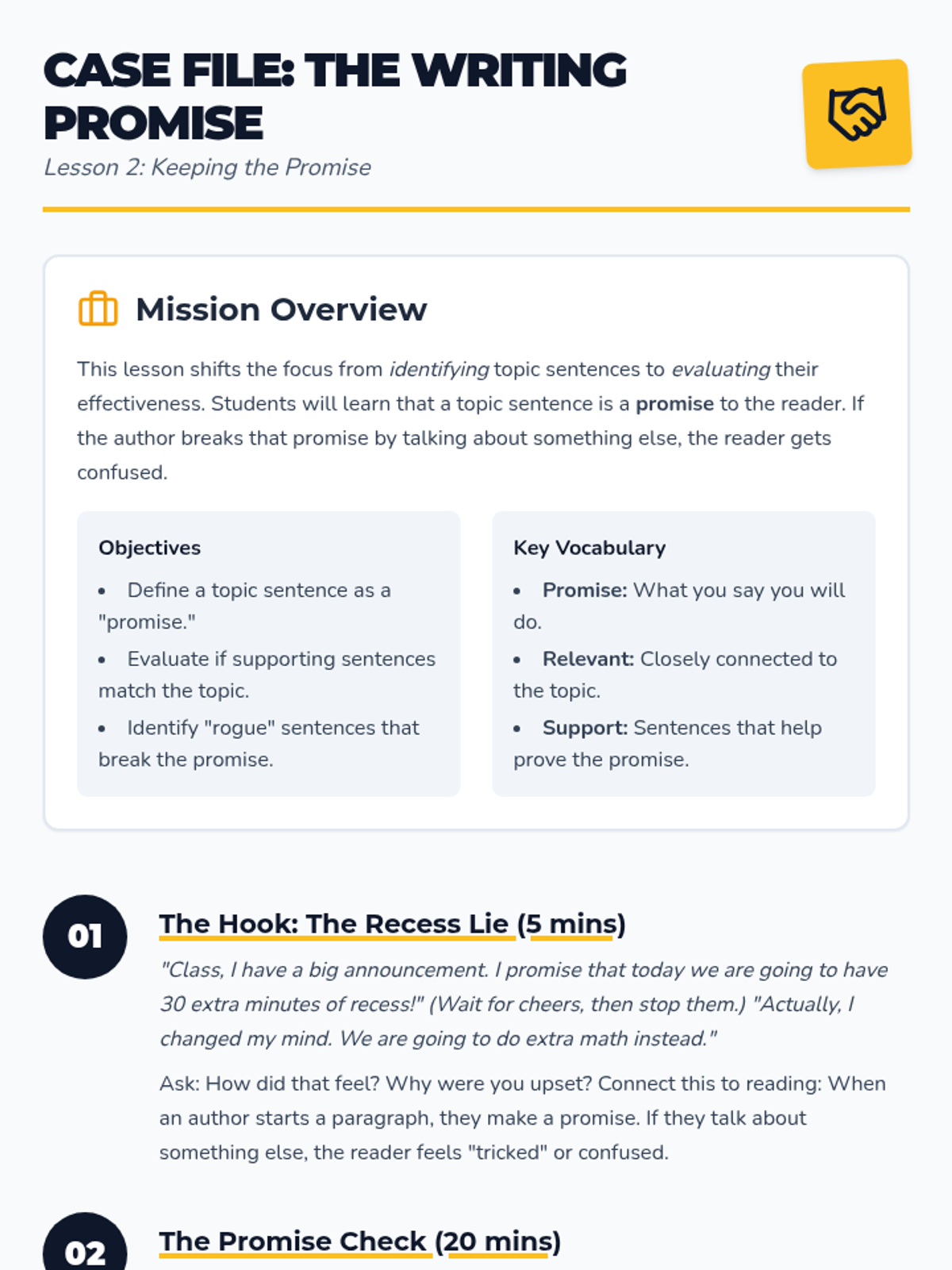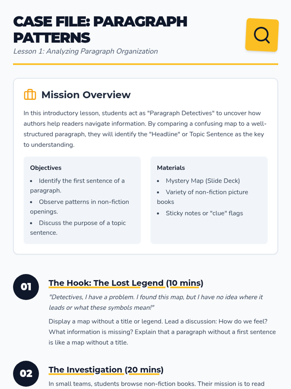 A 5-lesson sequence for 2nd Grade students exploring the structural role of topic sentences in informational writing. Students investigate paragraphs as 'promises' to the reader, practice logical sequencing, and learn to transform questions into strong declarative openings.