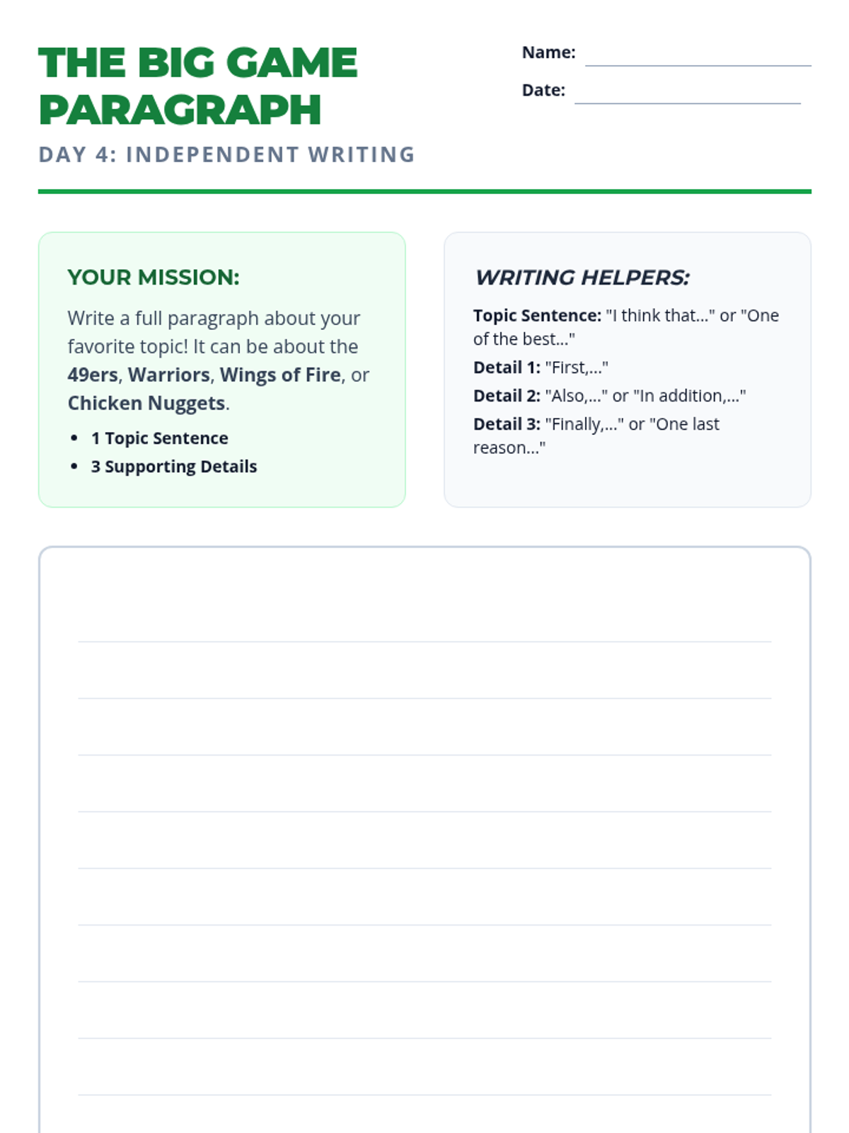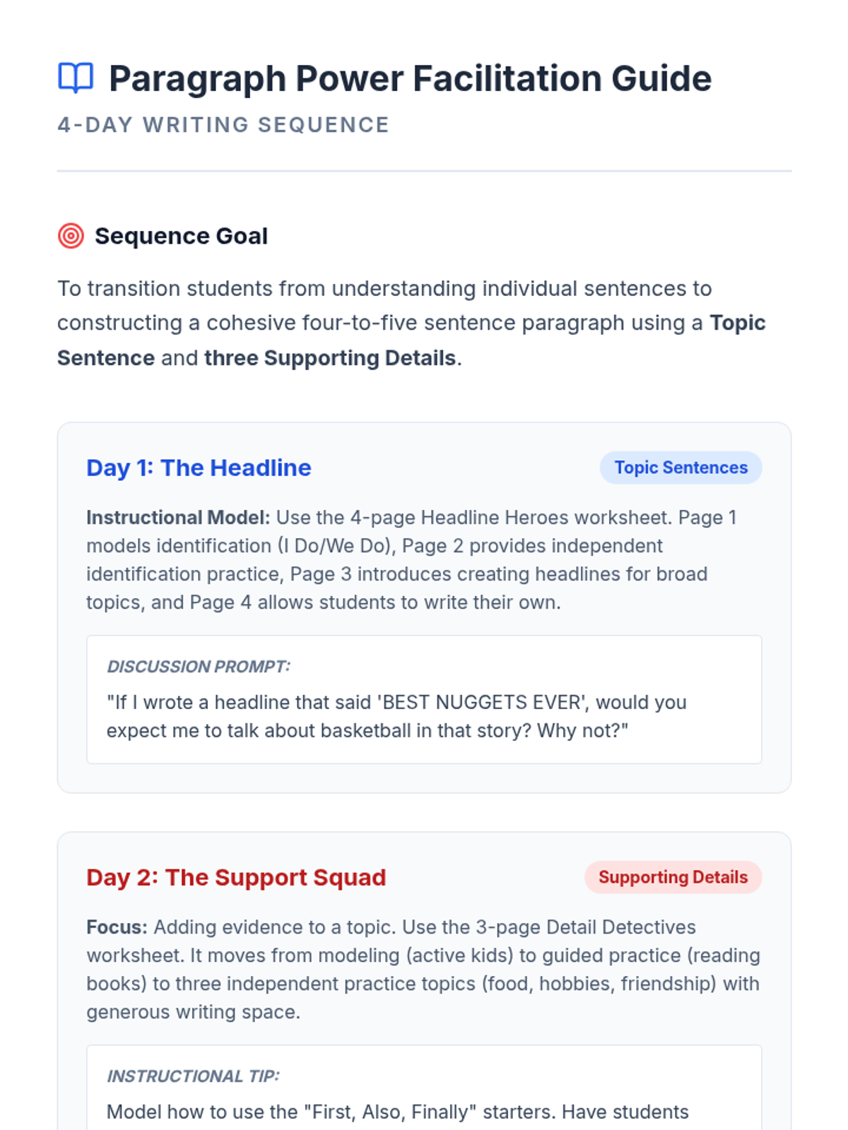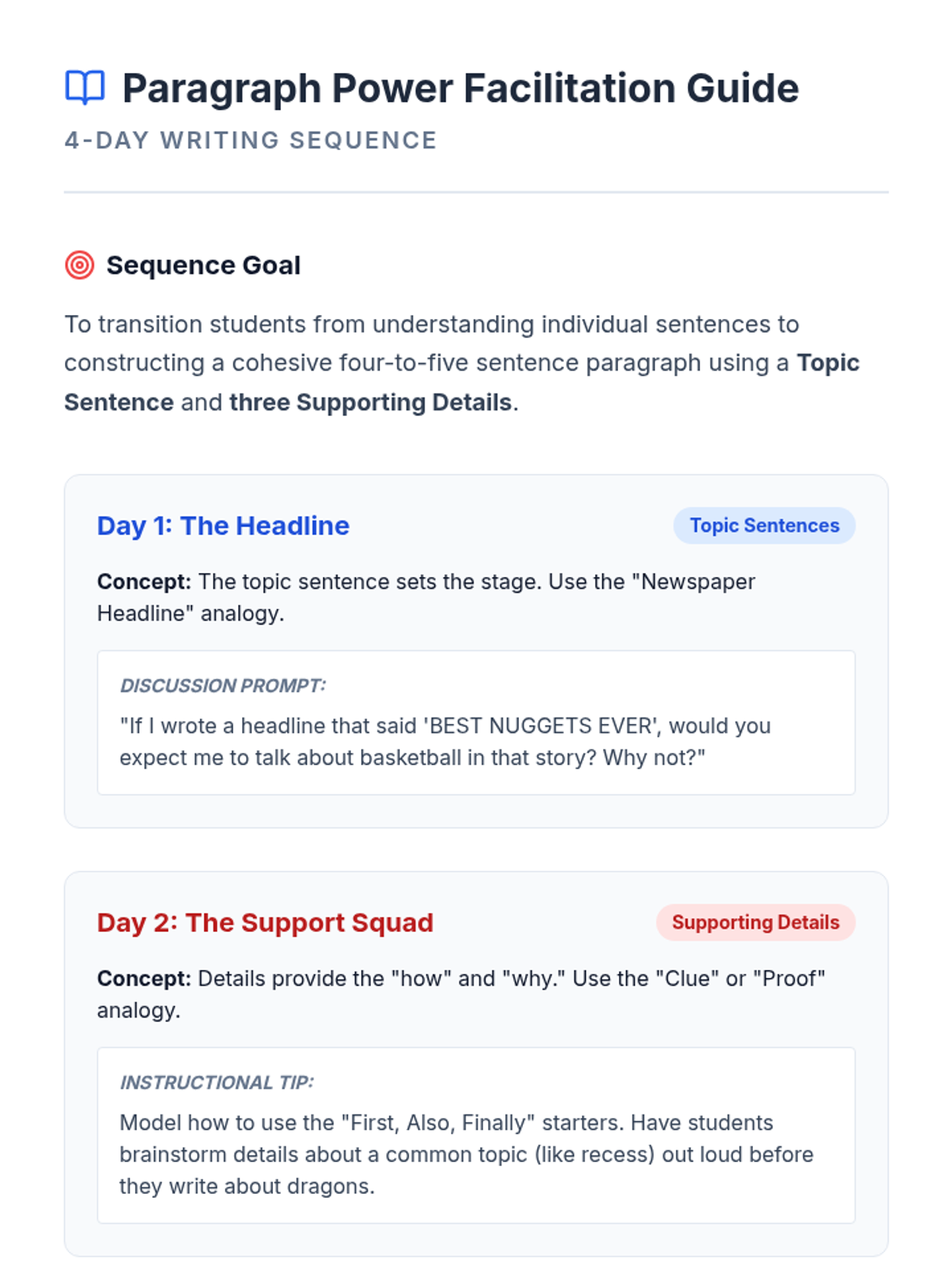 A 4-day instructional sequence focused on paragraph structure, specifically mastering topic sentences and supporting details using student-interest topics like sports, dragons, and favorite foods.