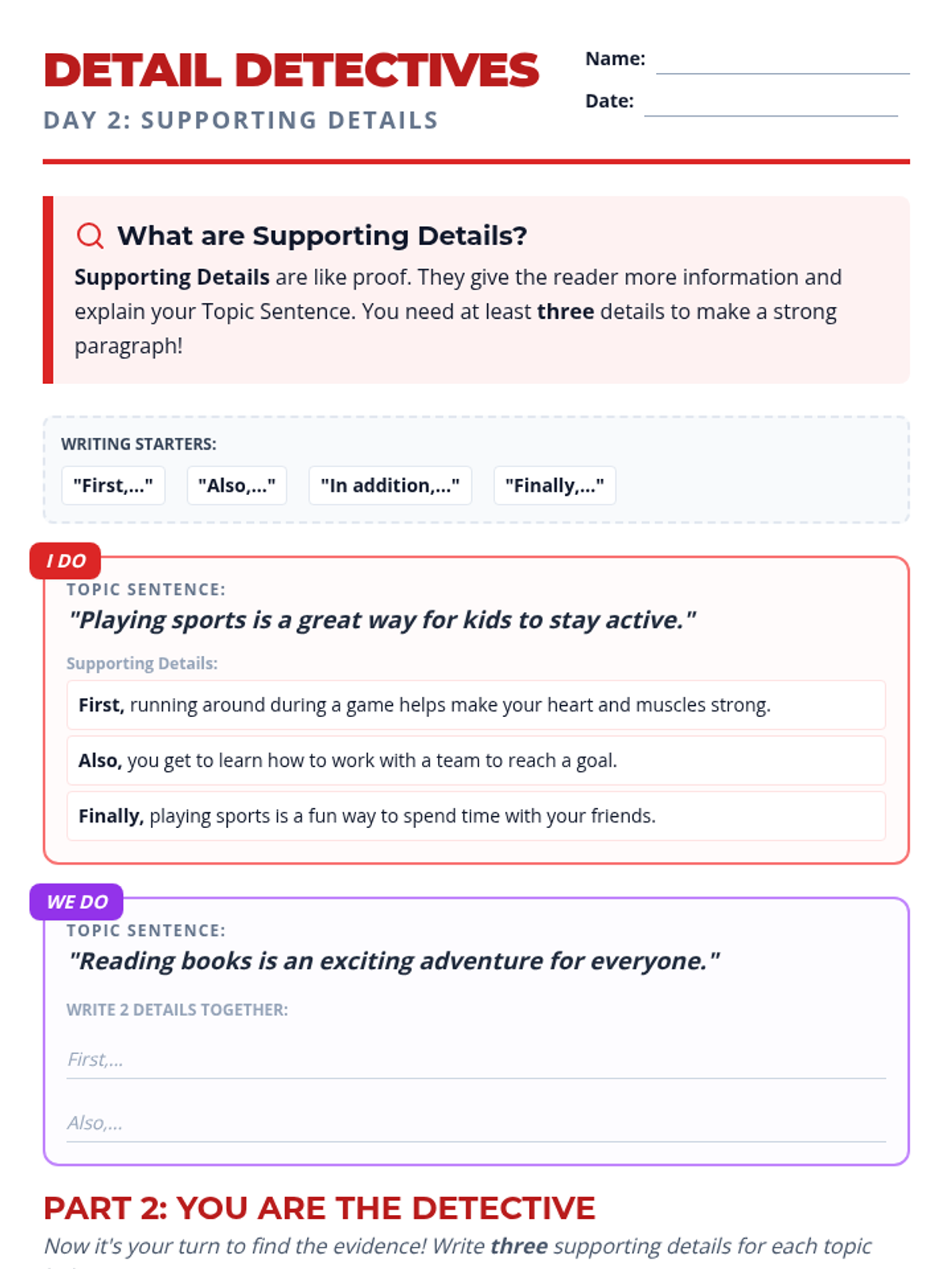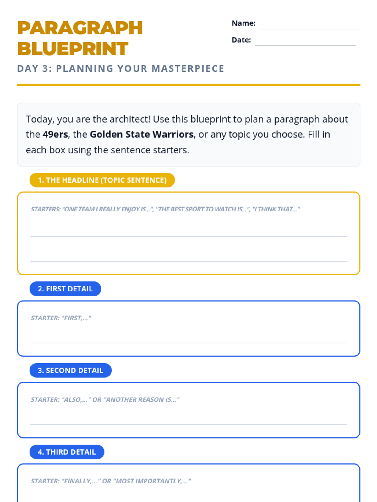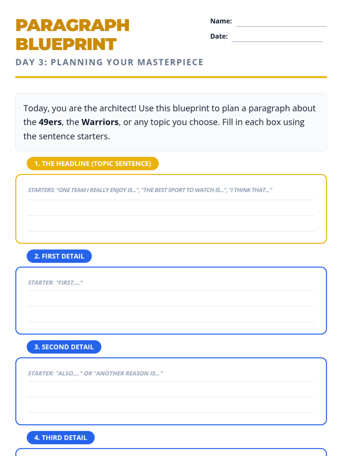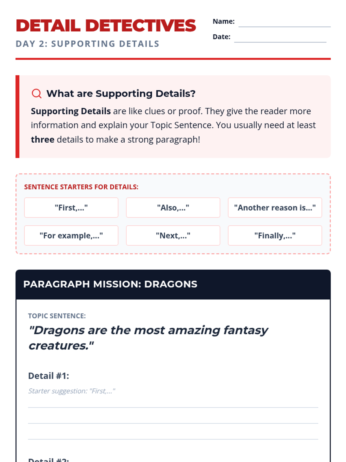 A 4-day instructional sequence focused on paragraph structure, specifically mastering topic sentences and supporting details using student-interest topics like sports, dragons, and favorite foods.