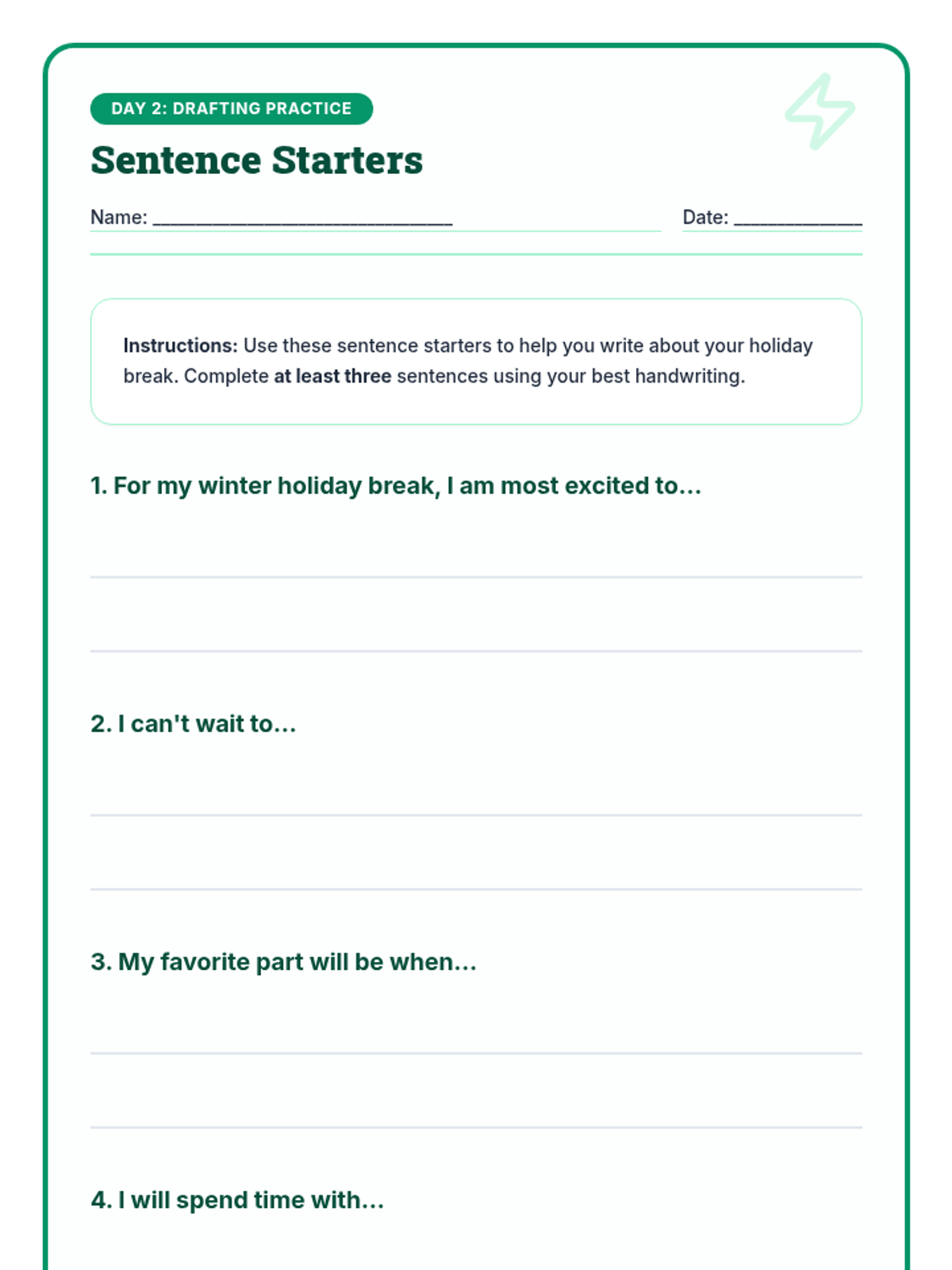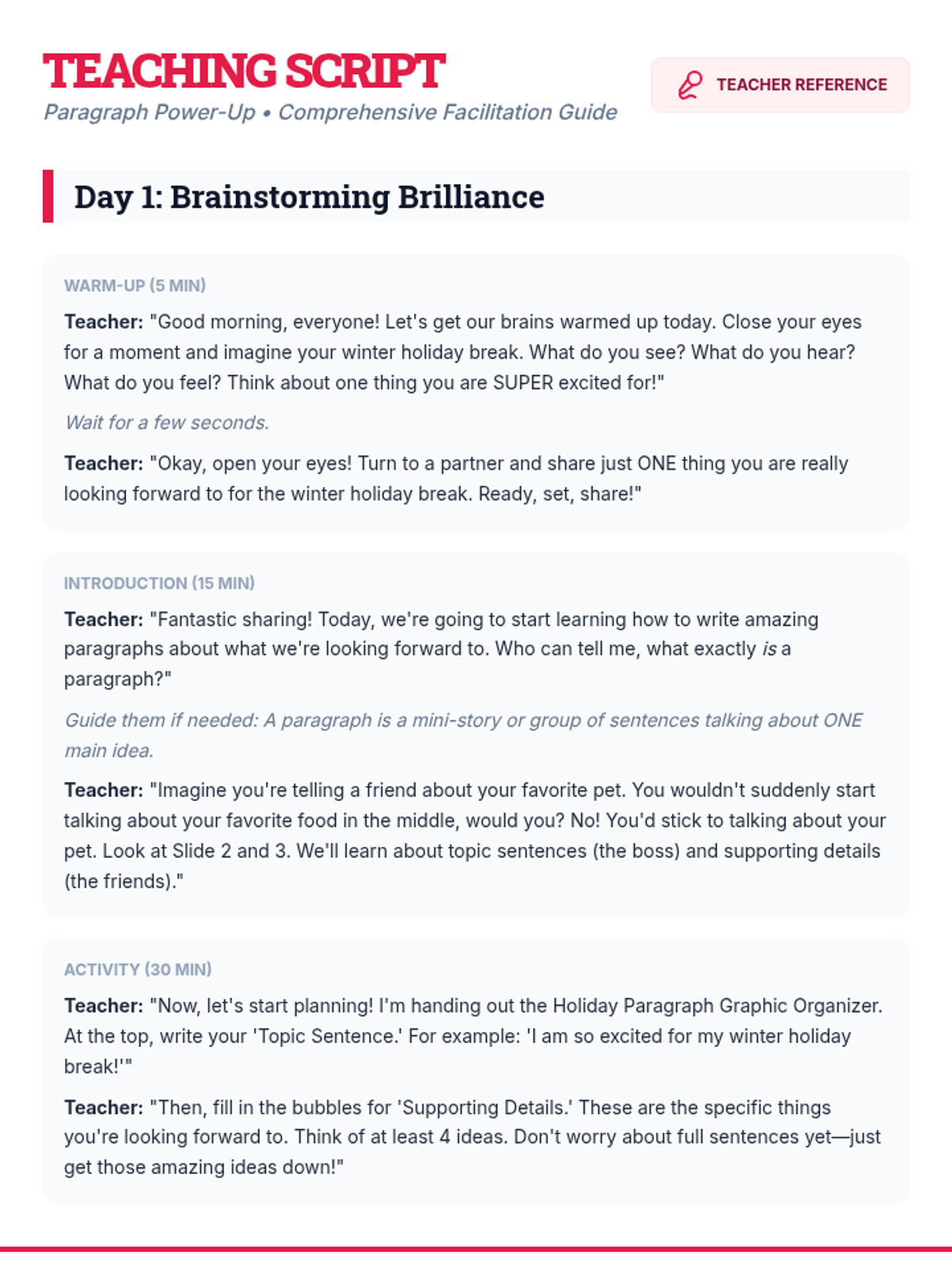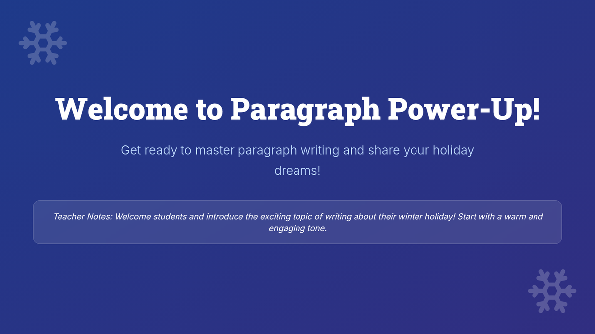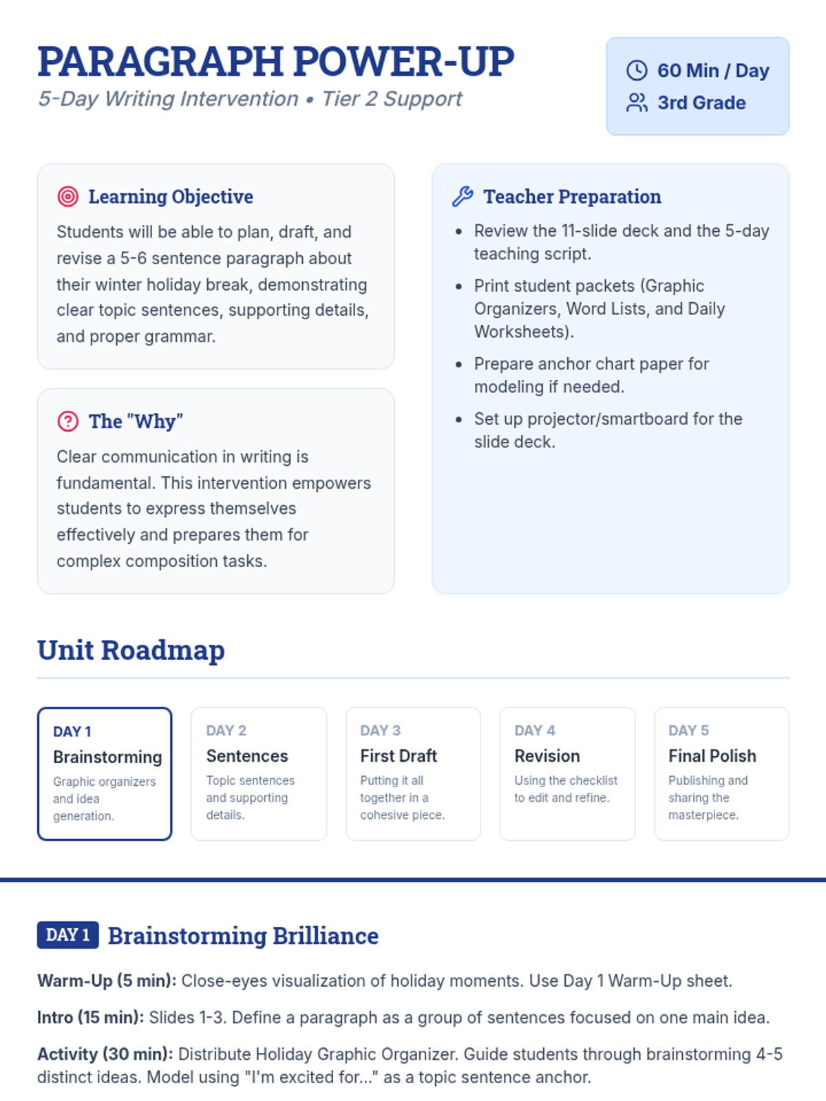A 5-day Tier 2 writing intervention for 3rd graders focused on crafting 5-6 sentence paragraphs about their winter holiday break. Students progress from brainstorming and graphic organization to drafting, editing, and final polishing.