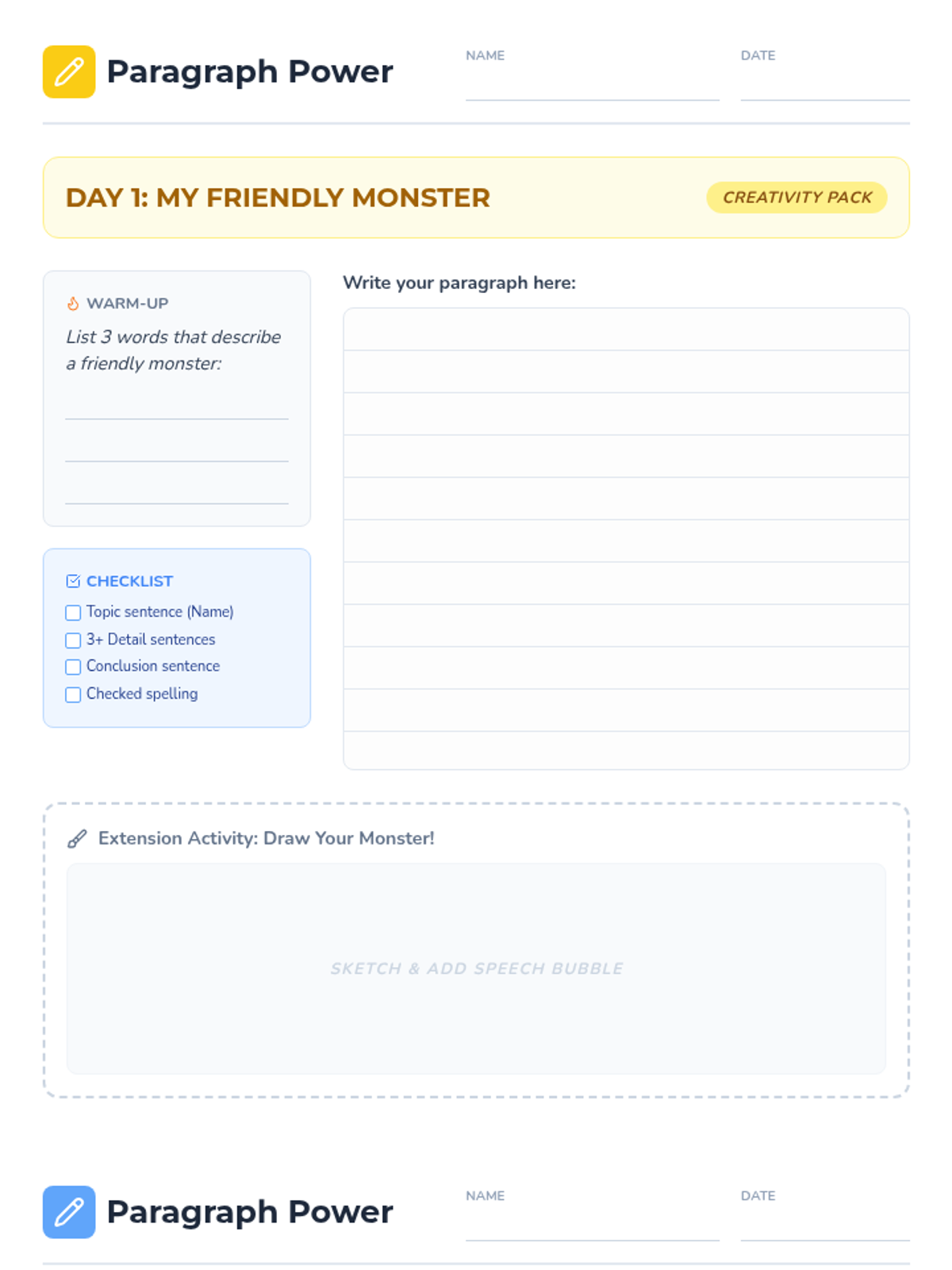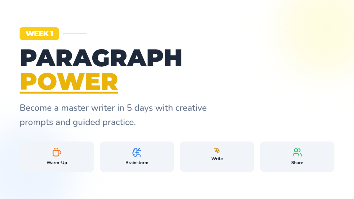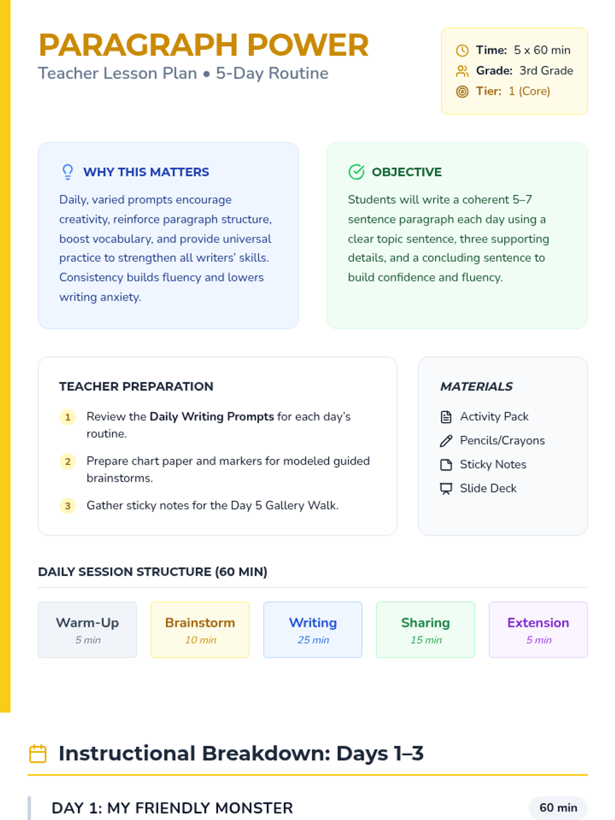 A five-day writing routine for 3rd graders focused on building paragraph structure through engaging daily prompts, guided brainstorming, and peer sharing.