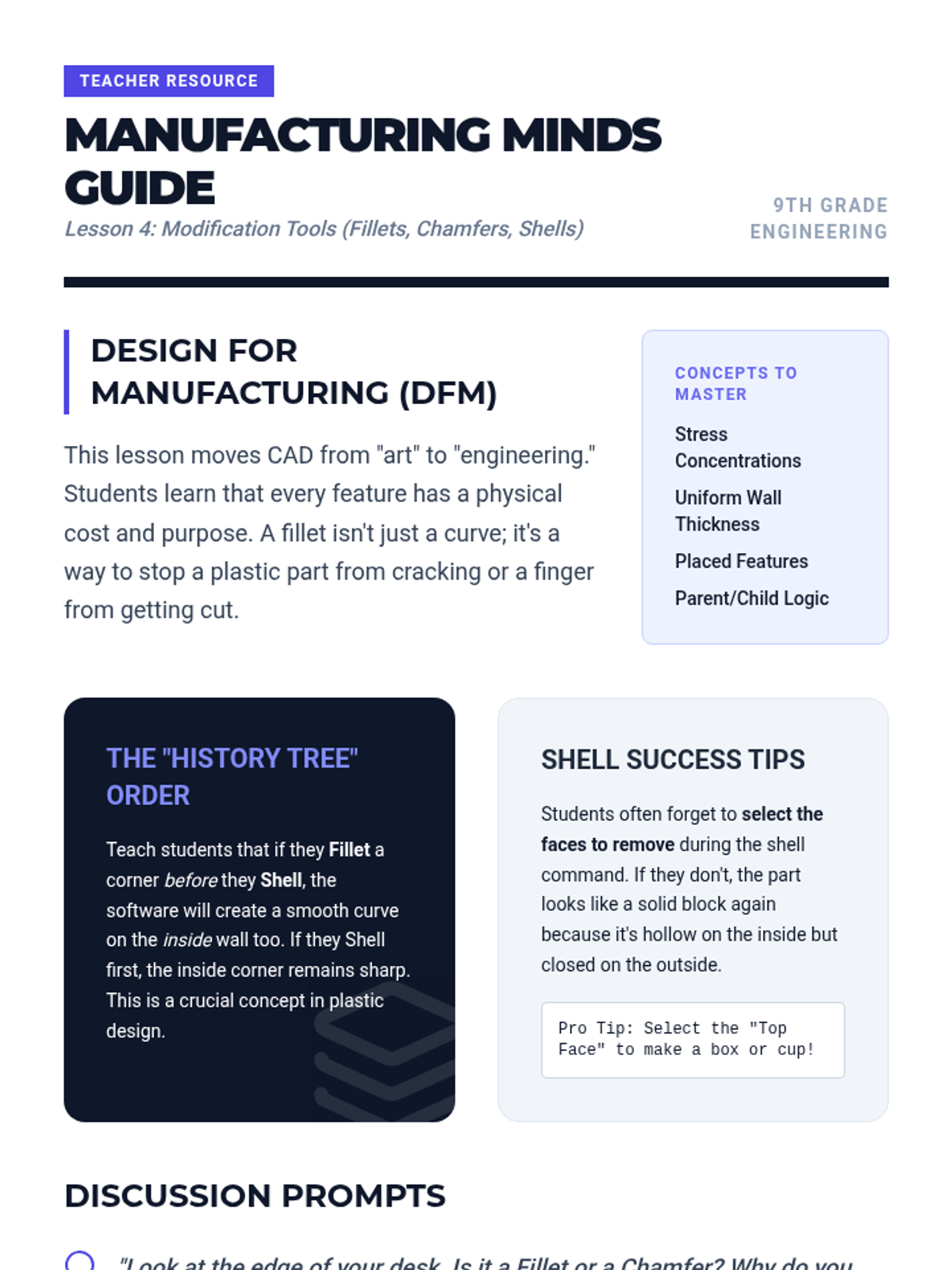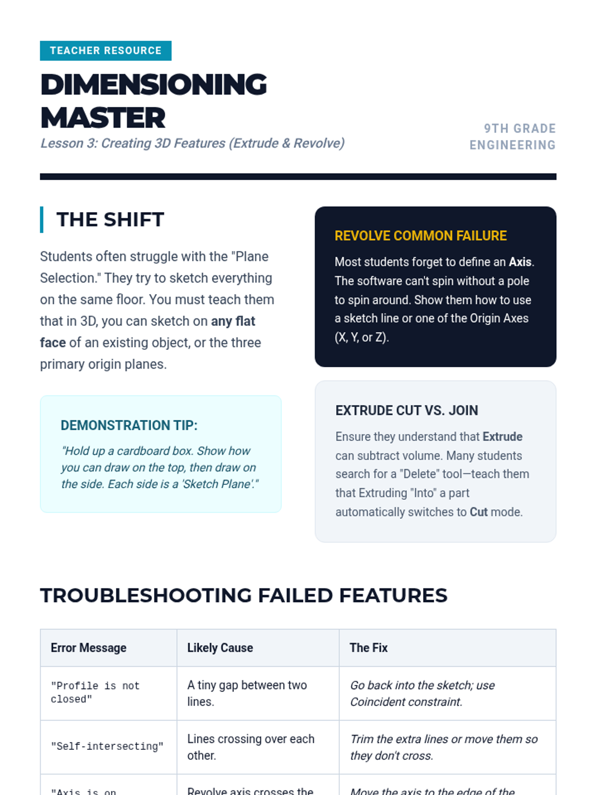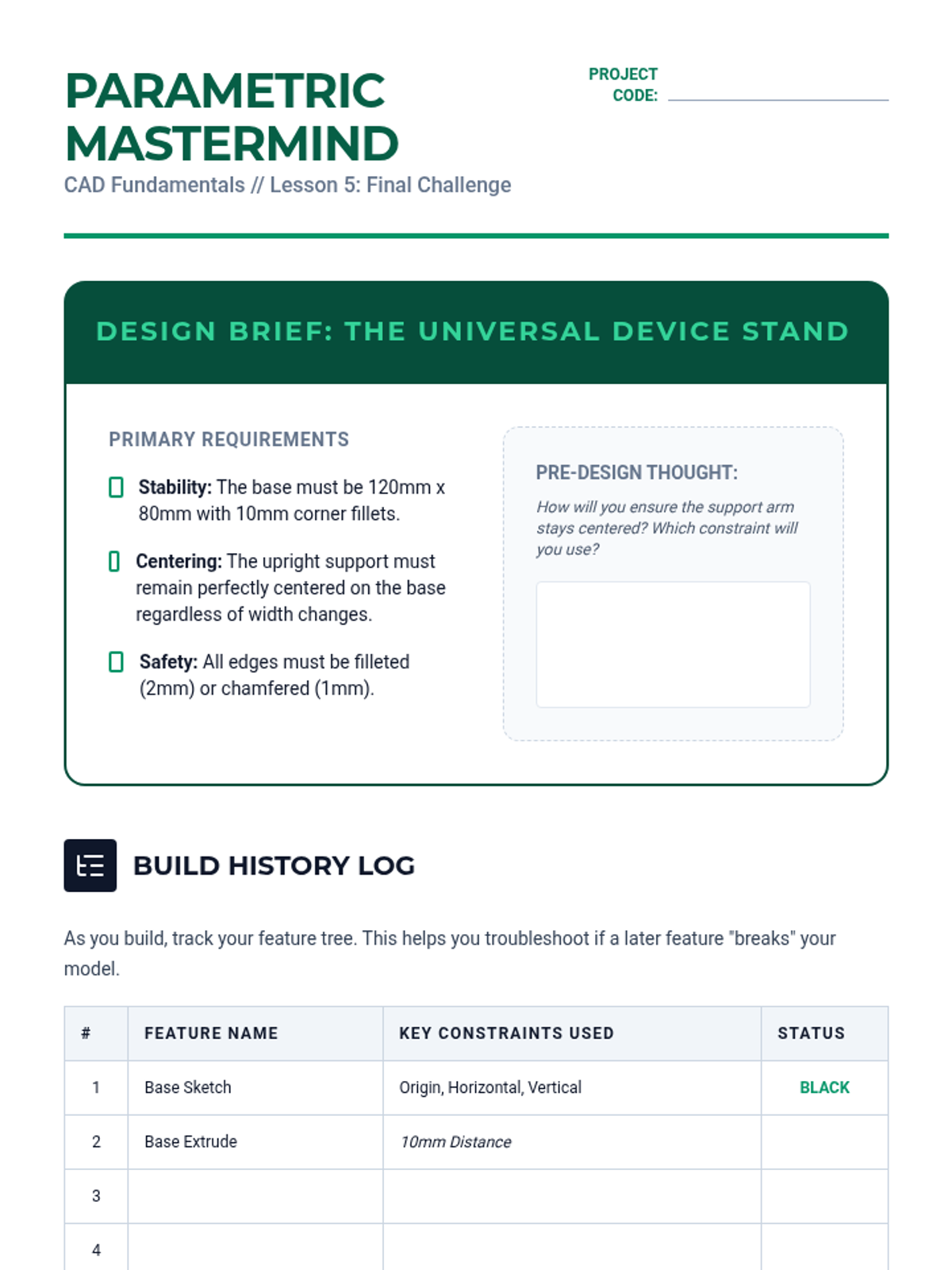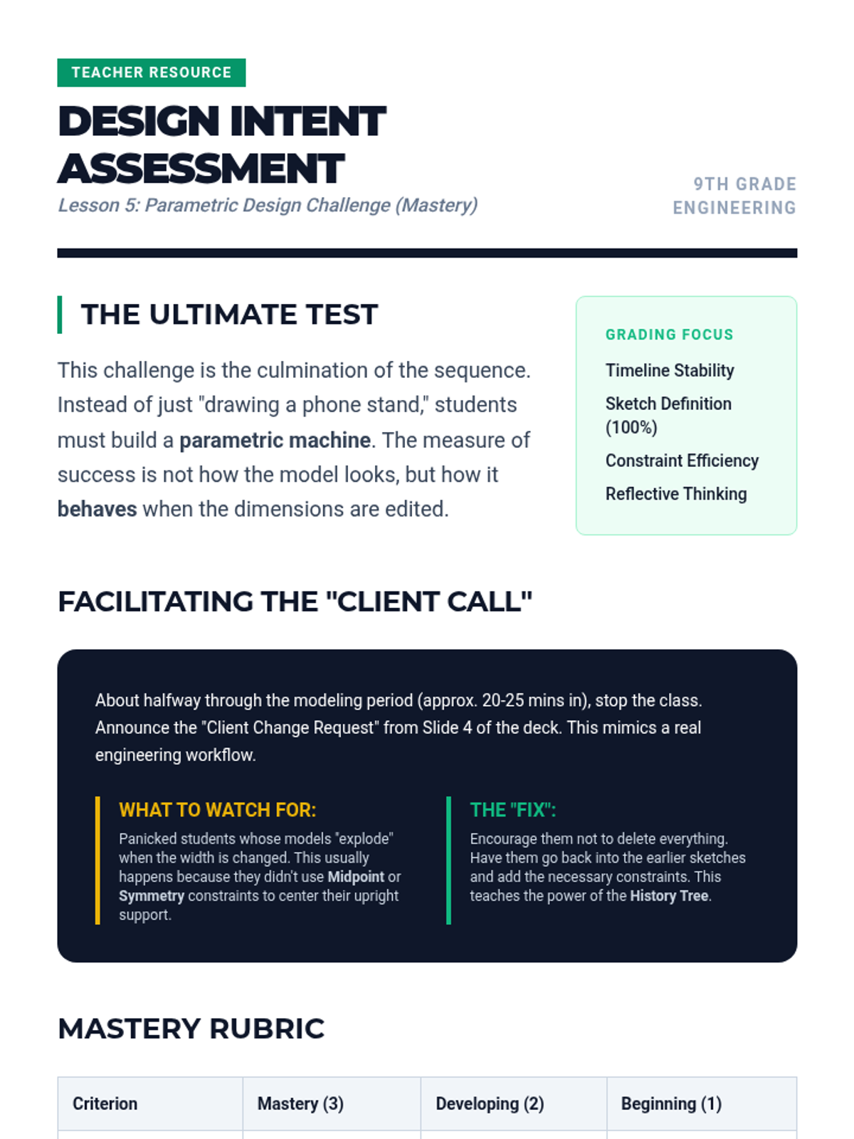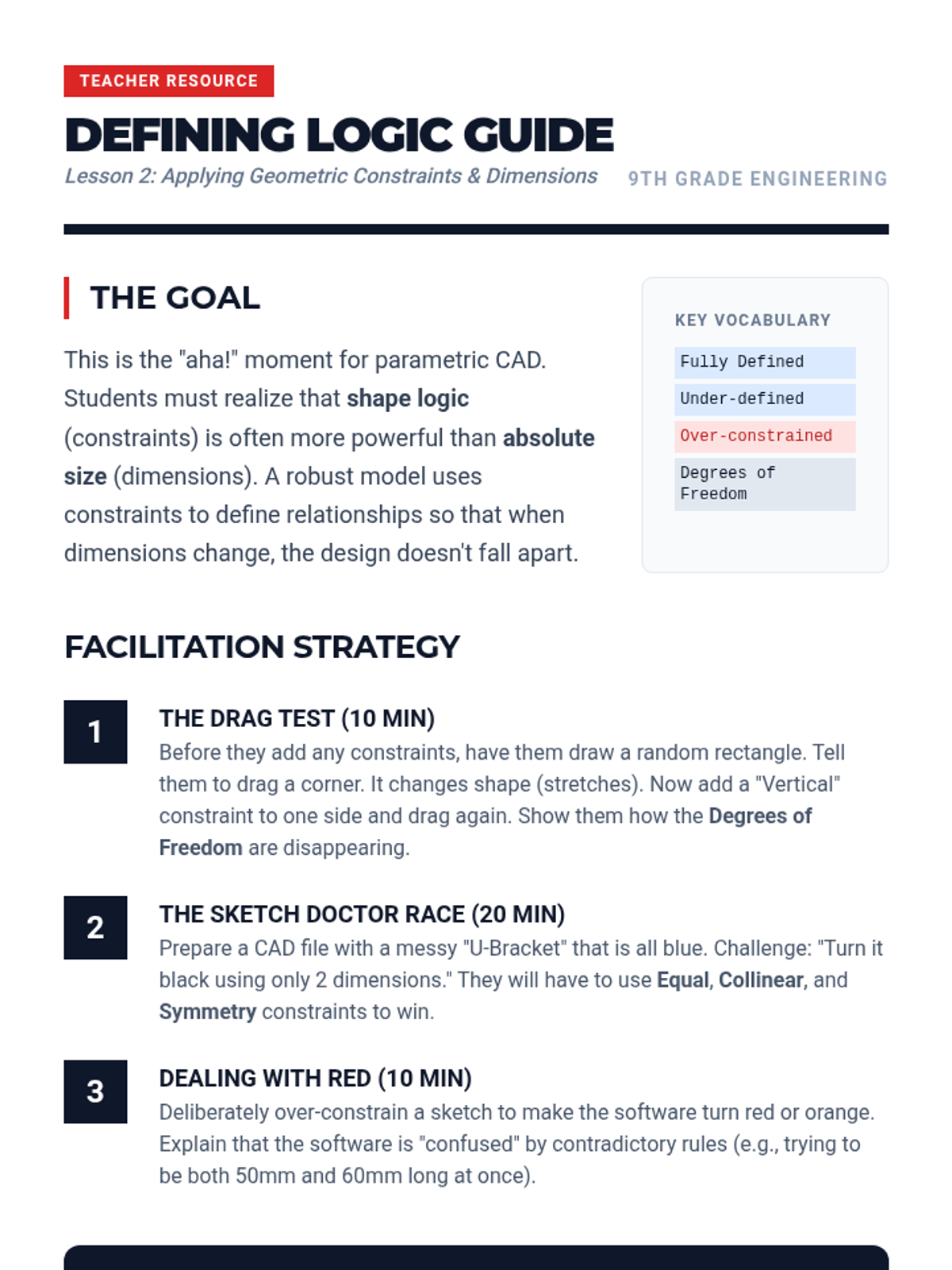 A comprehensive introduction to parametric CAD modeling for 9th-grade students, focusing on the transition from static drawing to intelligent, constraint-based design. Students progress from basic 2D sketching to complex 3D features and parametric modifications, culminating in a challenge where their models must withstand 'client' dimension changes.