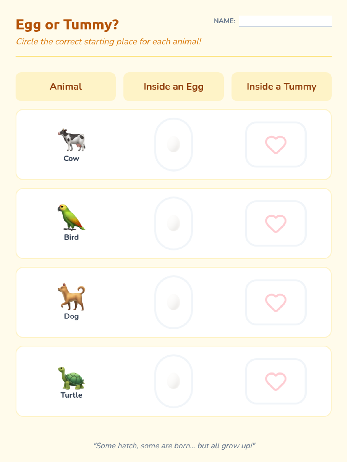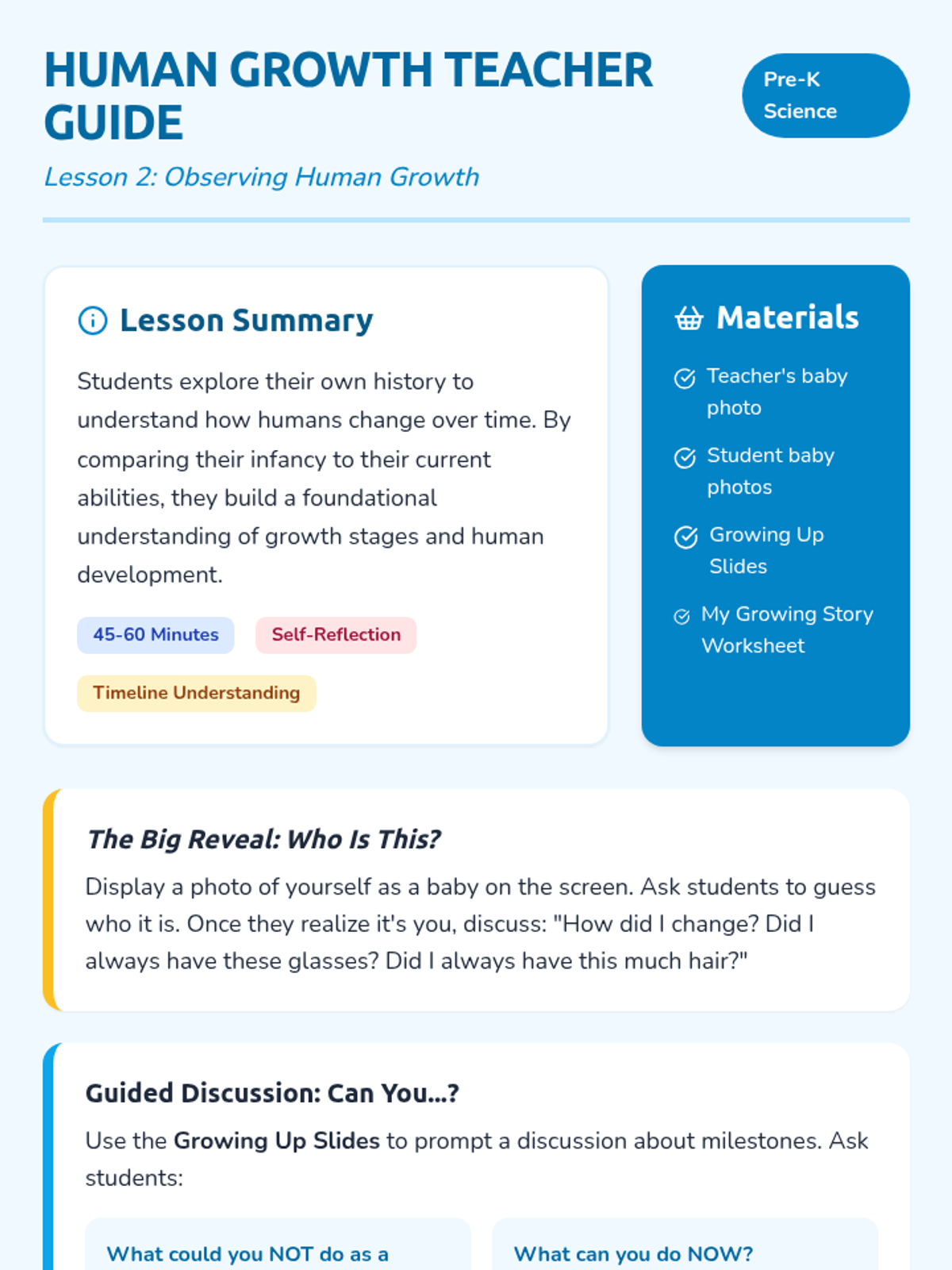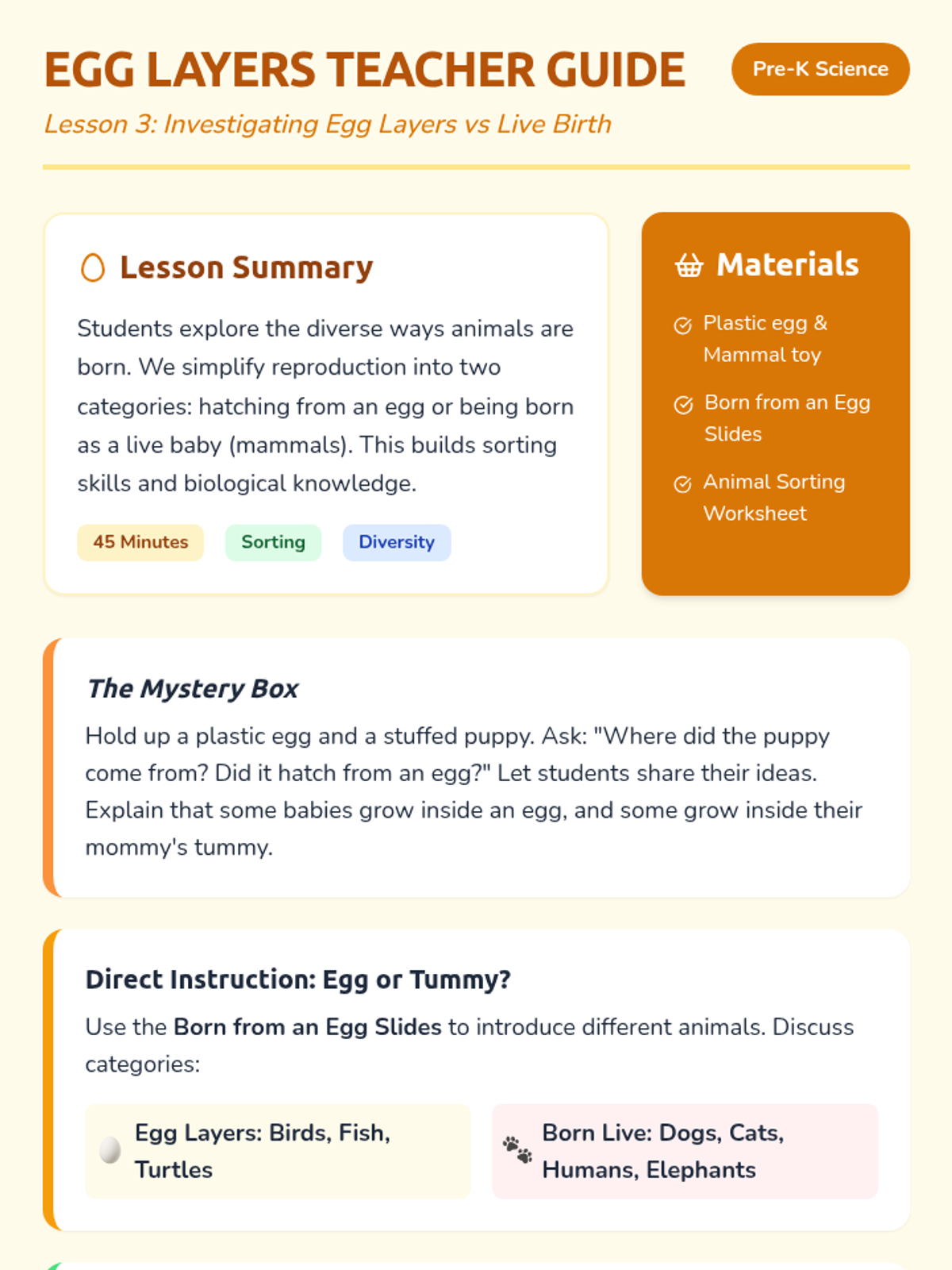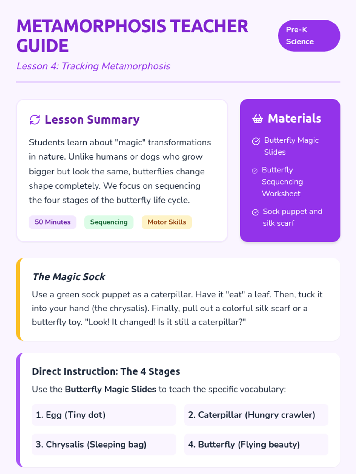 This Pre-K sequence explores how living things grow and change, focusing on the relationship between parents and offspring. Students will learn about animal baby names, human growth stages, the difference between eggs and live birth, and the unique process of metamorphosis.