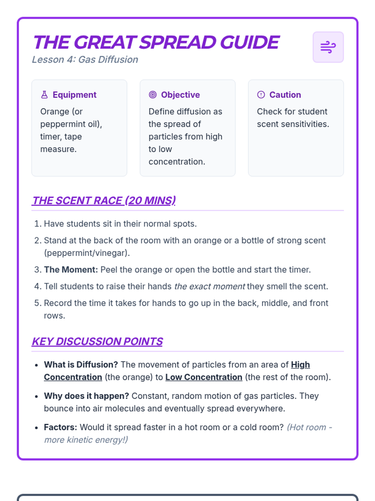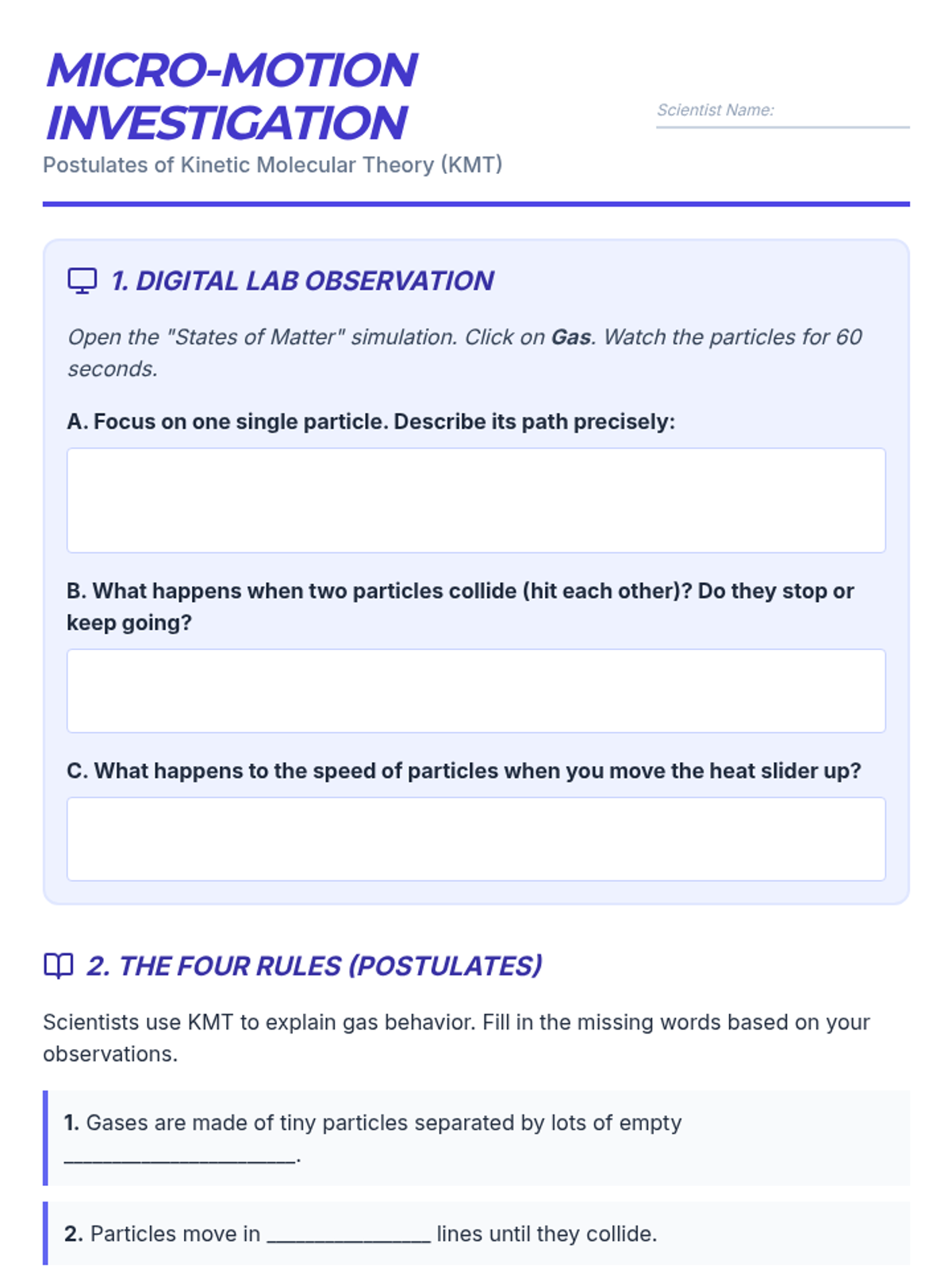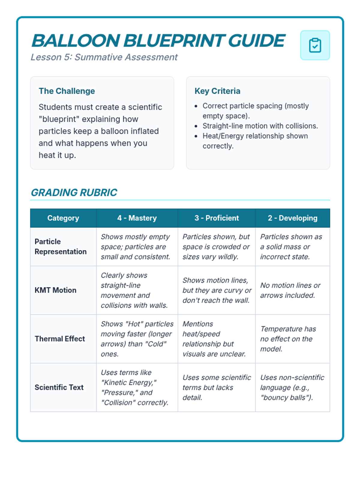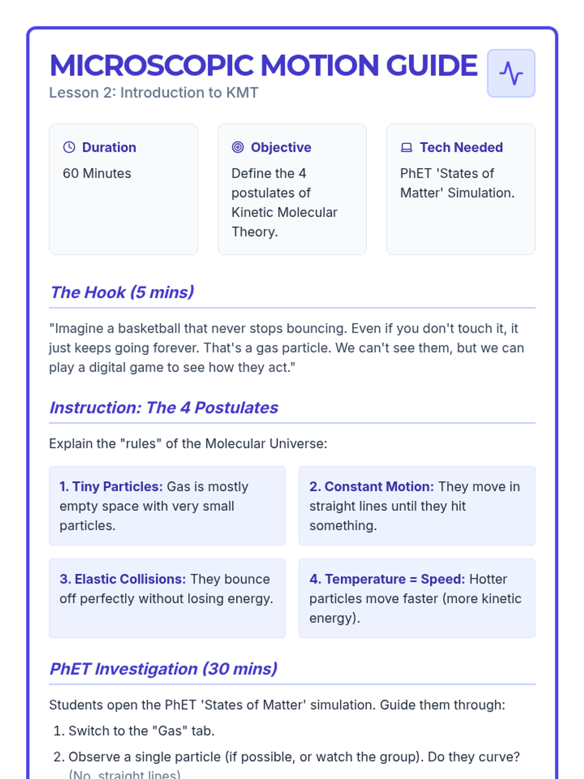A 6th-grade chemistry sequence exploring the Kinetic Molecular Theory through modeling, simulations, and hands-on investigation of particle behavior in gases.