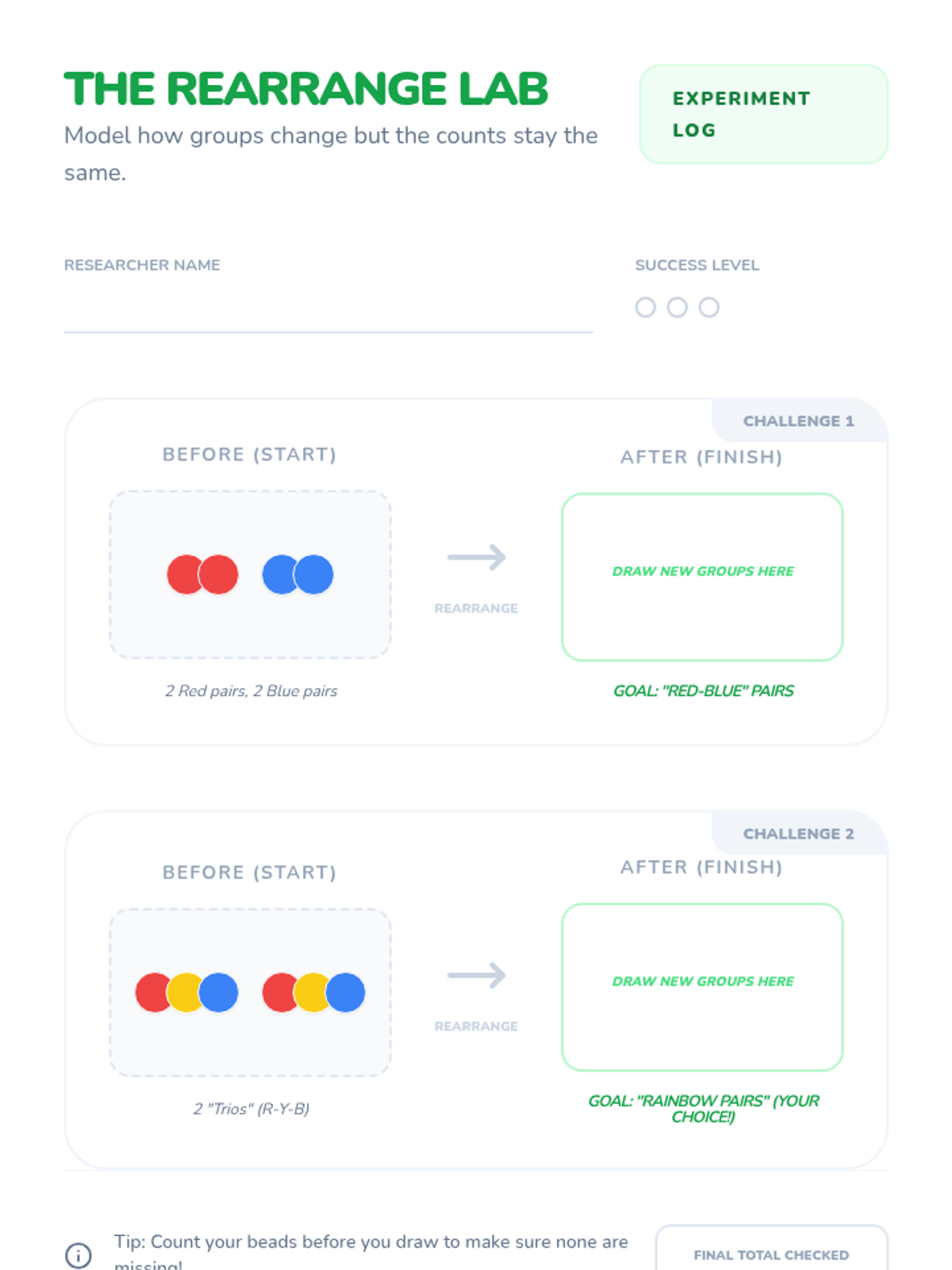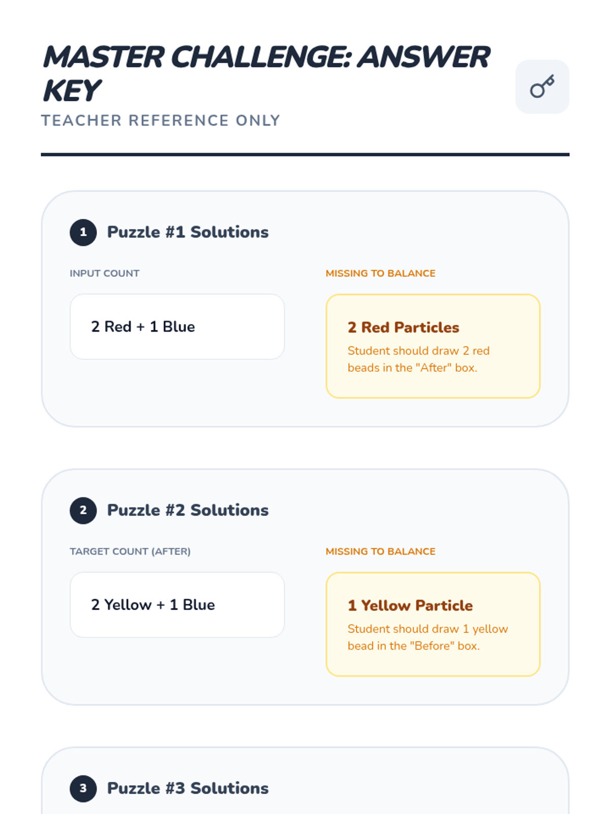 A hands-on chemistry sequence for 2nd graders using colored beads to model particle rearrangement and the fundamentals of balancing chemical equations. Students move from basic grouping to solving complex 'particle puzzles' that simulate conservation of mass.
