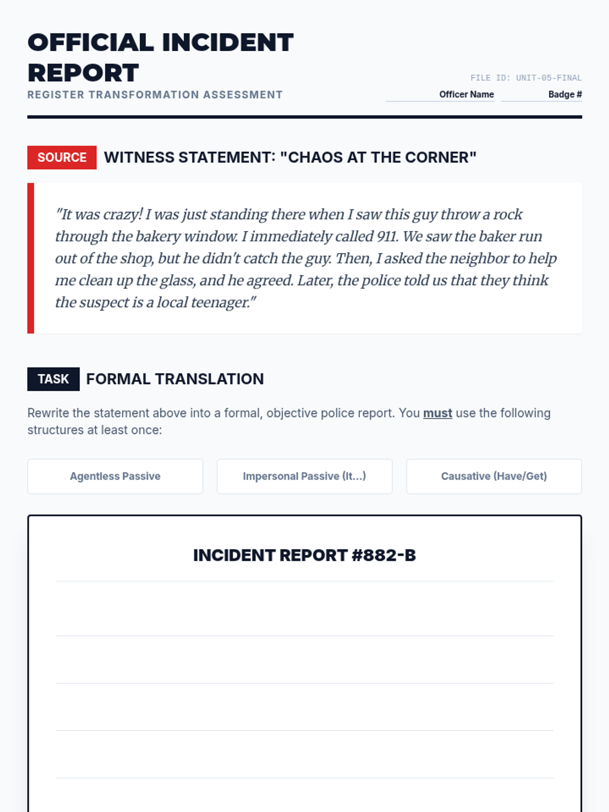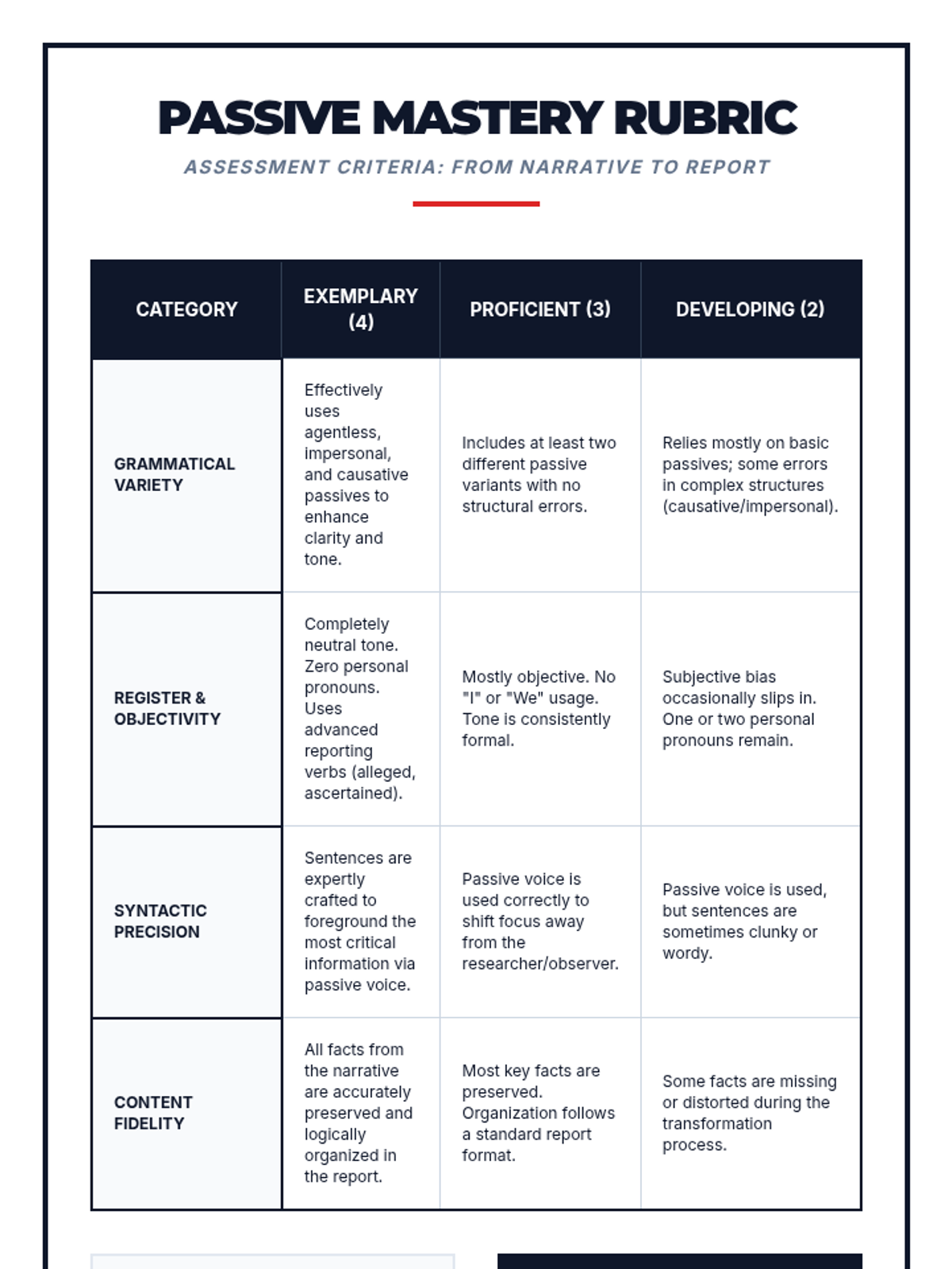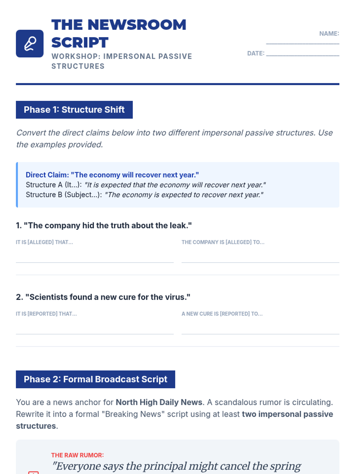 A high-school level sequence exploring the nuances of the passive voice in academic and journalistic contexts, focusing on agentless passives, impersonal structures, and causative forms to enhance objectivity.