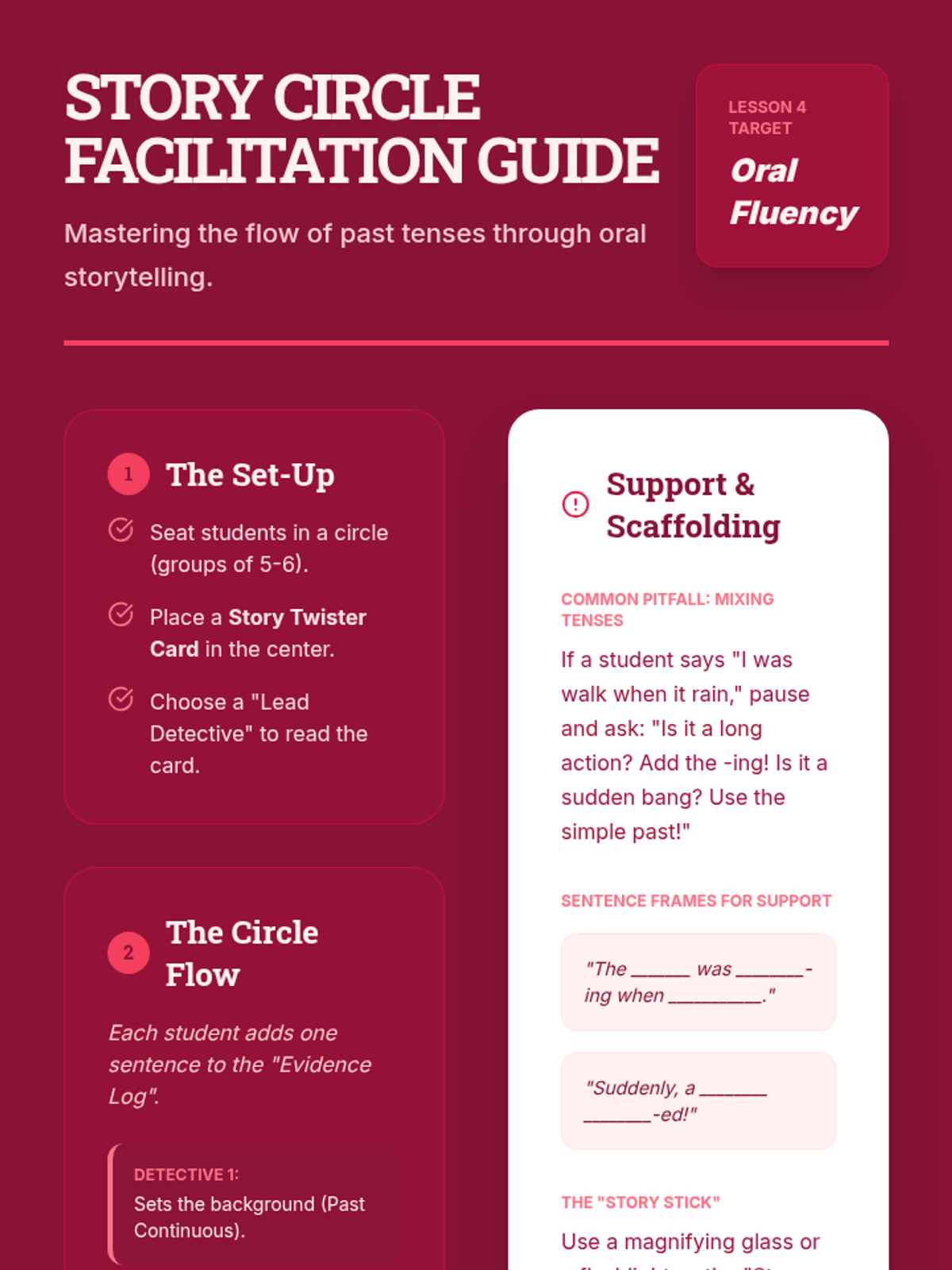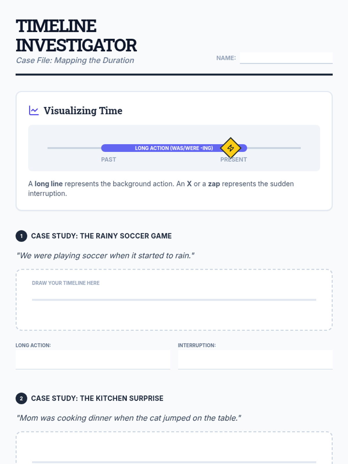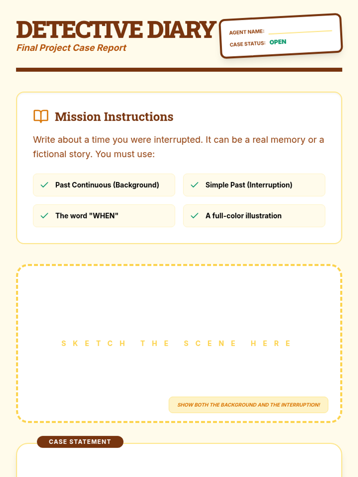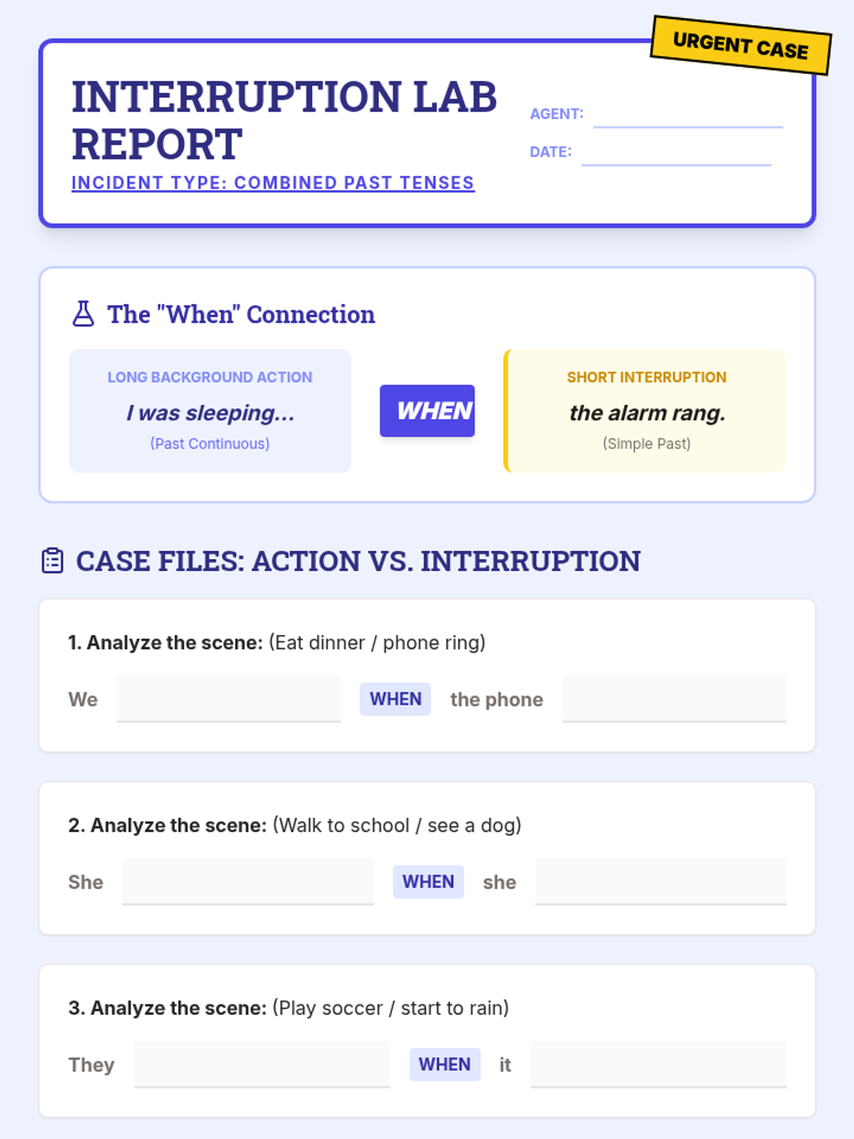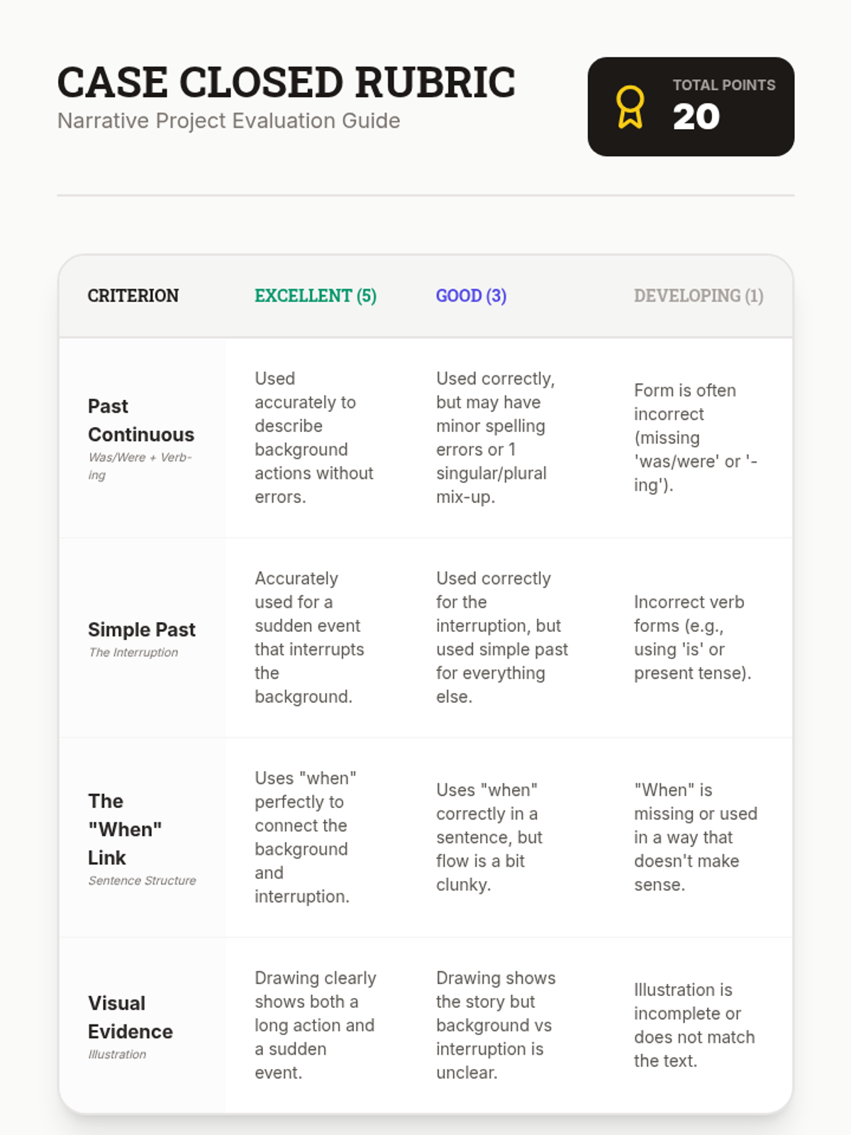A narrative-focused sequence for 3rd Grade ESL students to master past continuous and simple past tenses through the lens of a detective investigating scenes and stories. Students move from describing background actions to narrating complex, interrupted events.