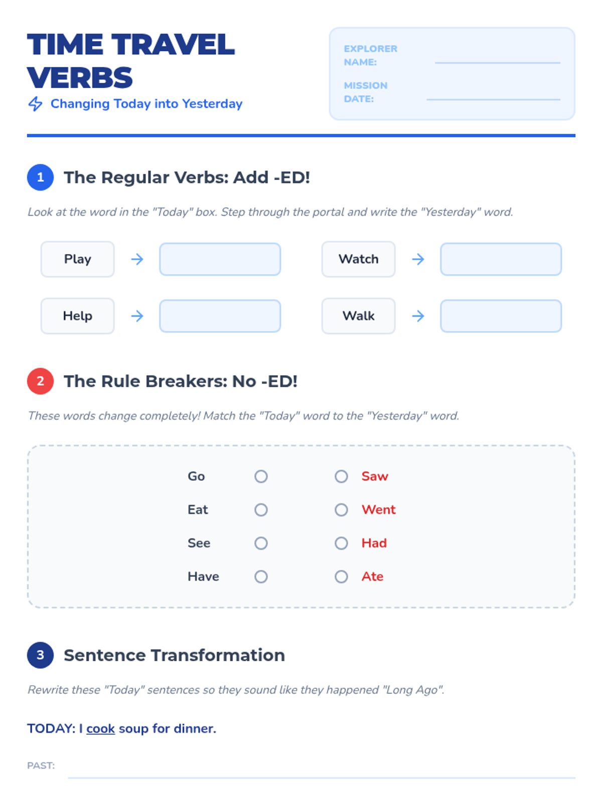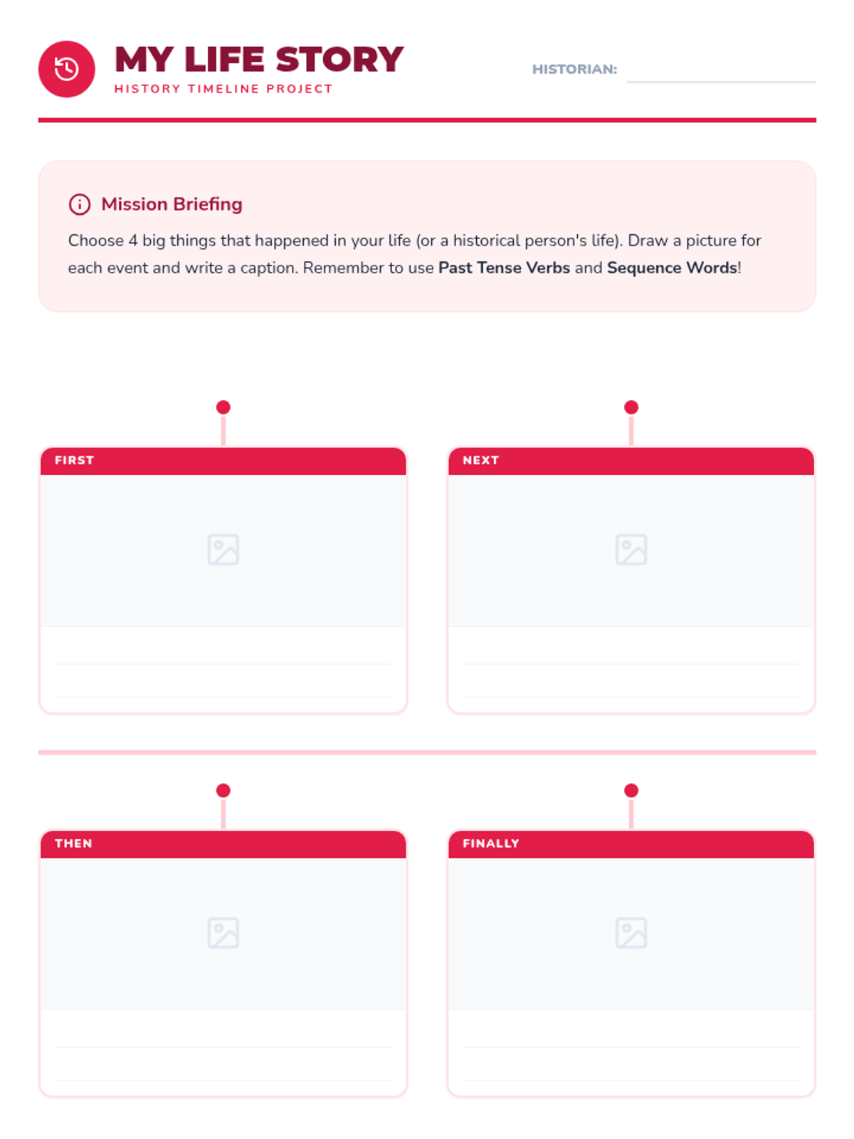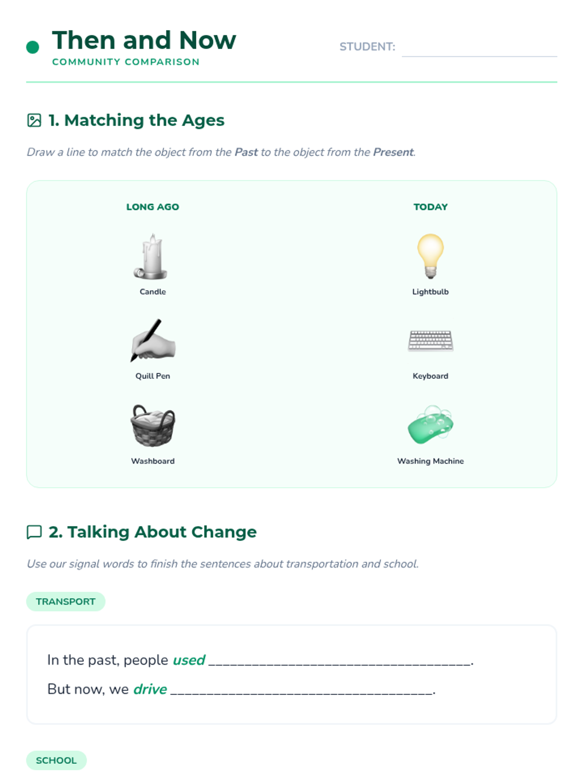 A 2nd-grade ESL sequence focused on transition words, past-tense verbs, and comparative language to help students sequence events and describe historical changes. Students move from daily routines to community history and final narrative projects.
