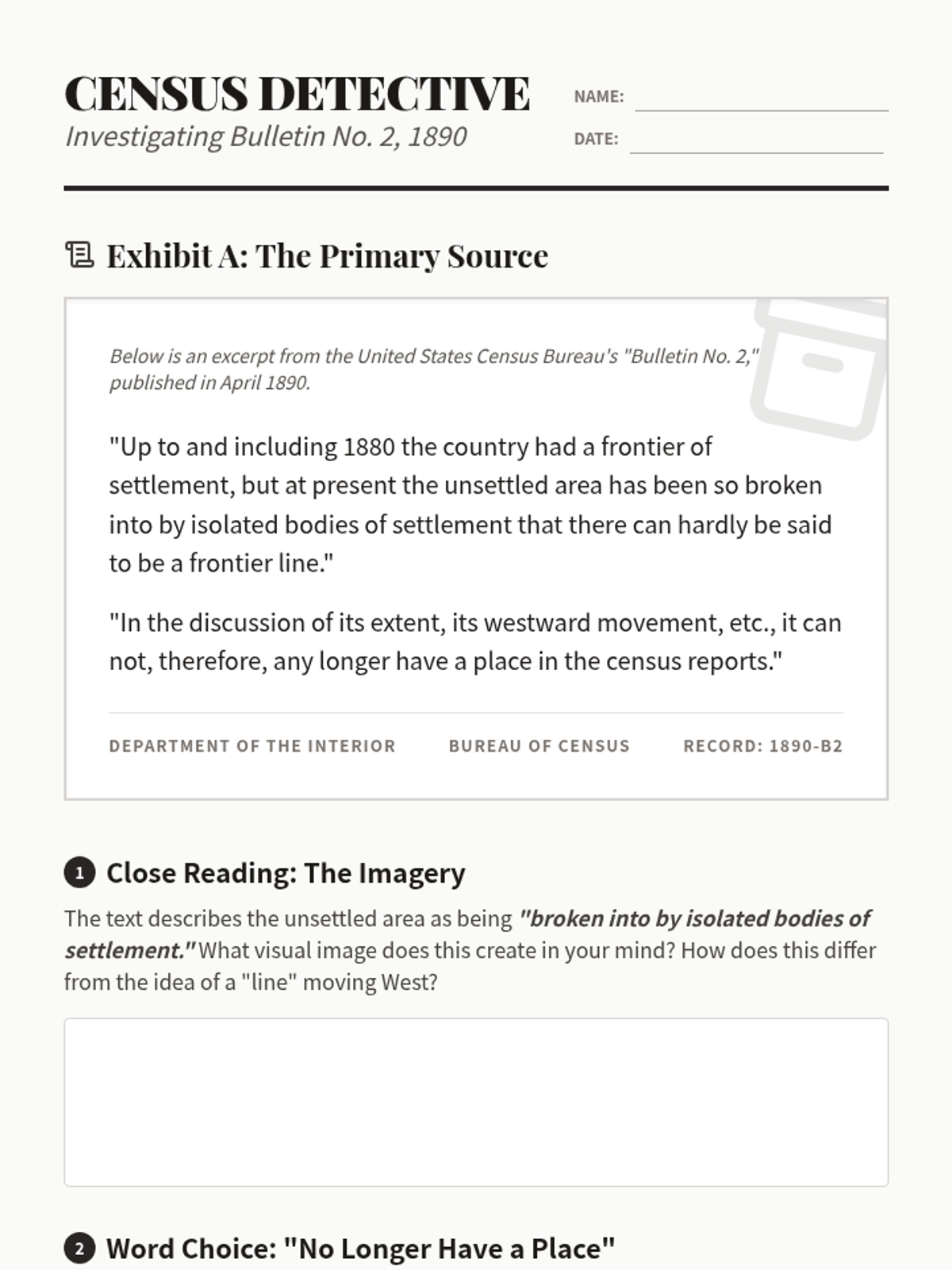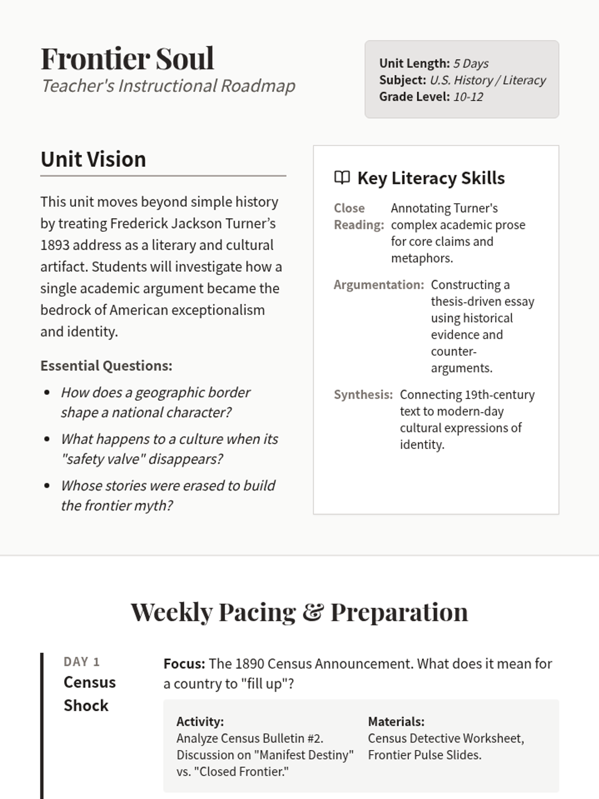 A weeklong exploration of Frederick Jackson Turner's Frontier Thesis, focusing on close reading, historical analysis, and the construction of American national identity. Students will engage with primary sources to understand how the concept of the frontier shaped democratic ideals, individualistic traits, and the exclusion of diverse perspectives.