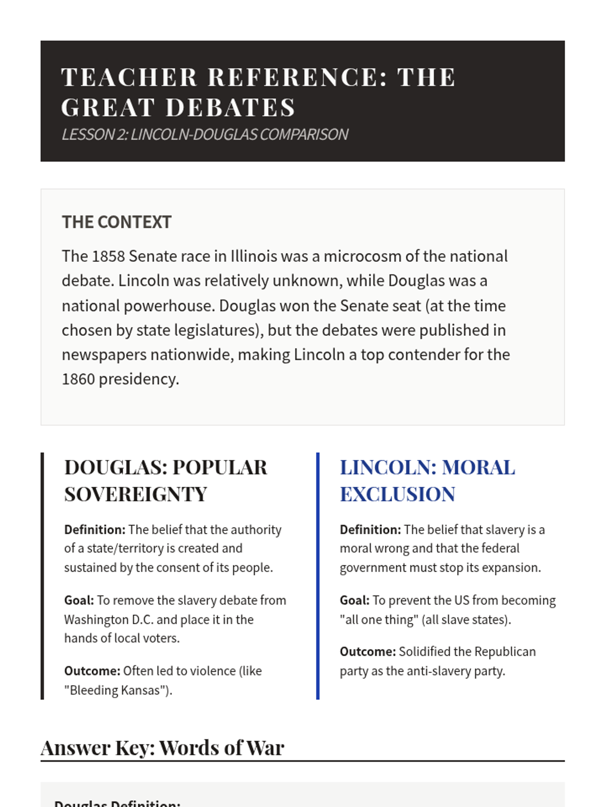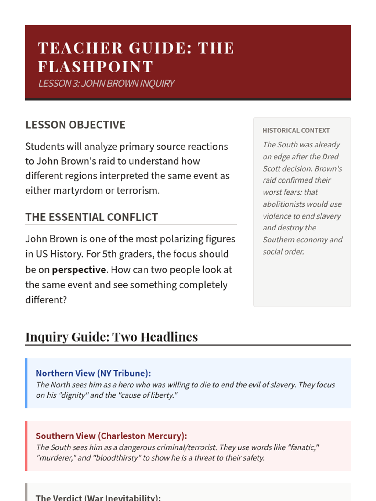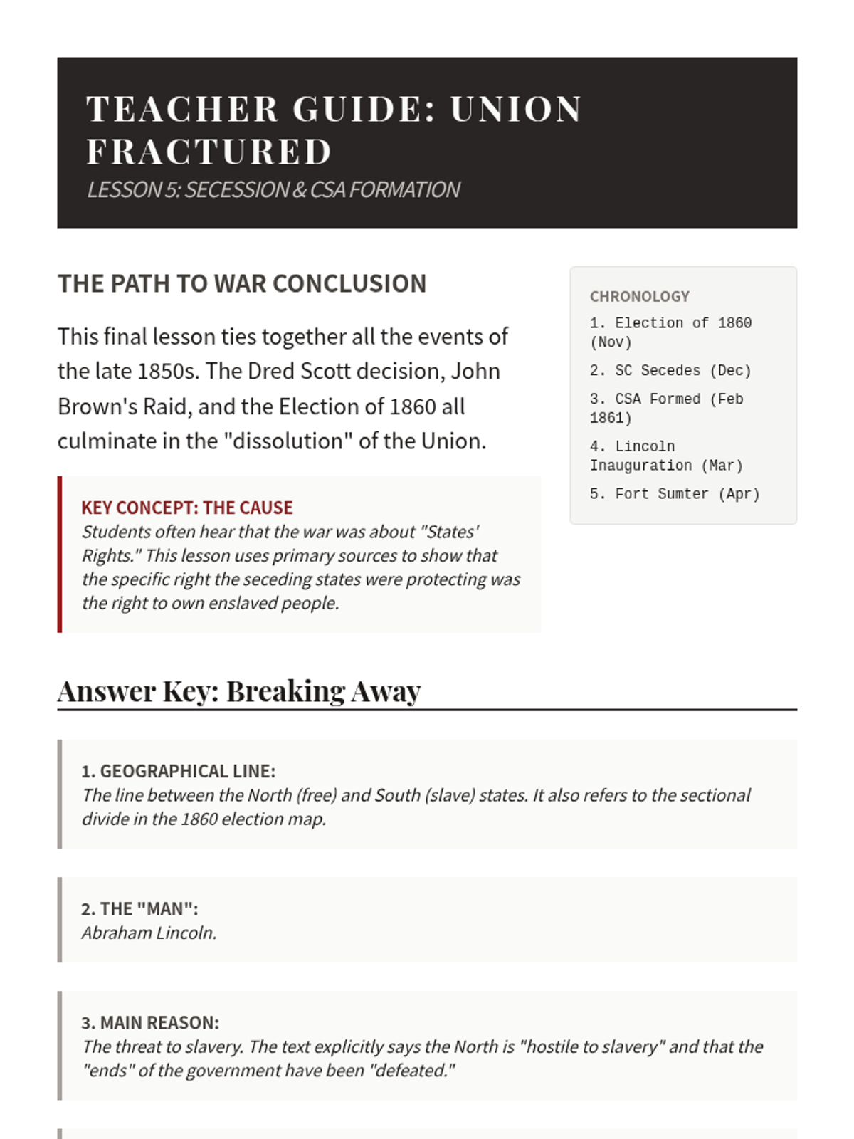This sequence explores the pivotal events of the late 1850s that led to the American Civil War, focusing on primary source analysis of the Dred Scott decision, the Lincoln-Douglas debates, John Brown's raid, and the Election of 1860.