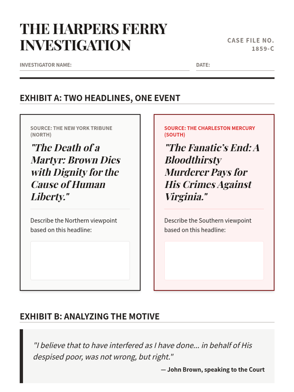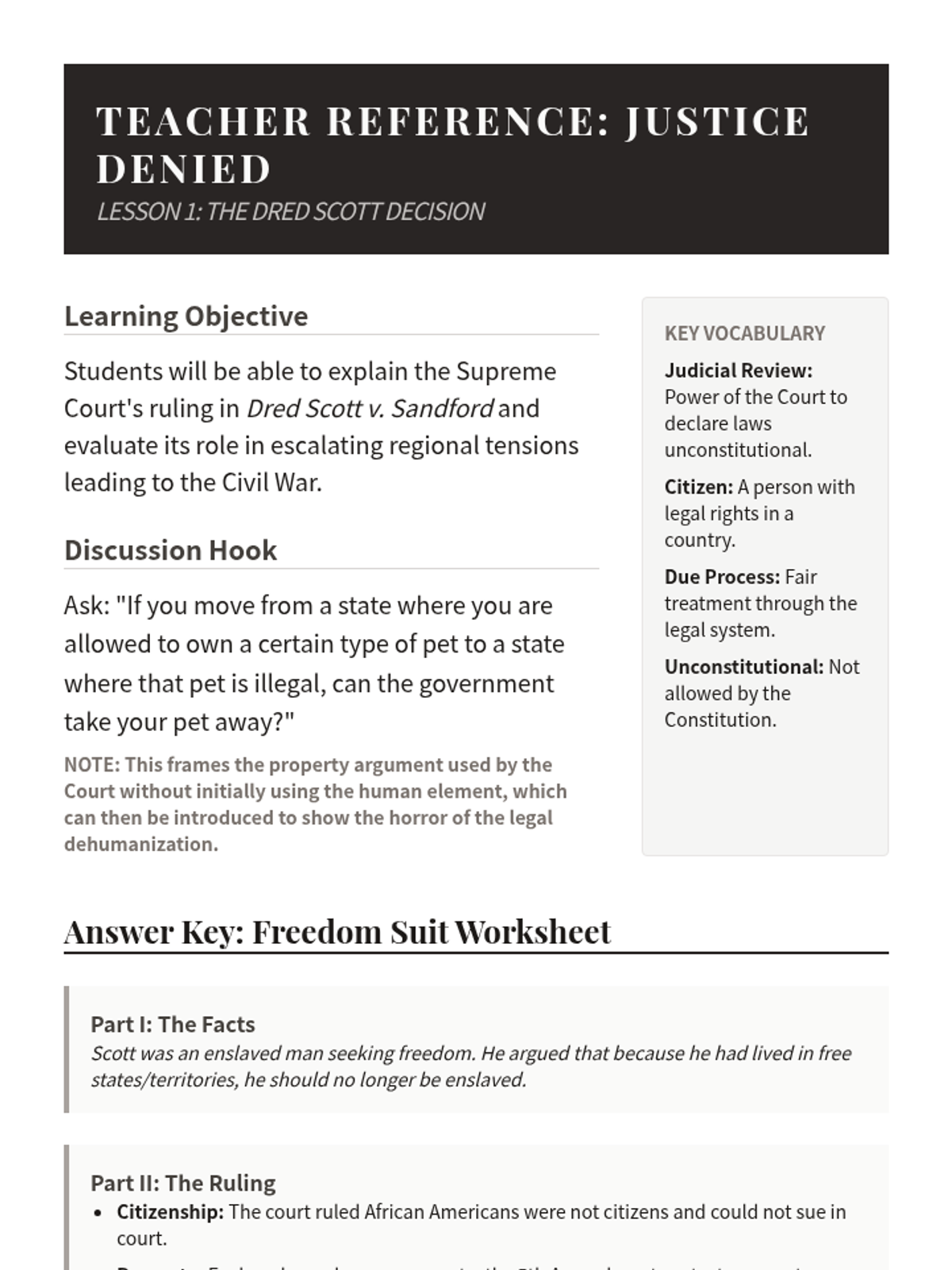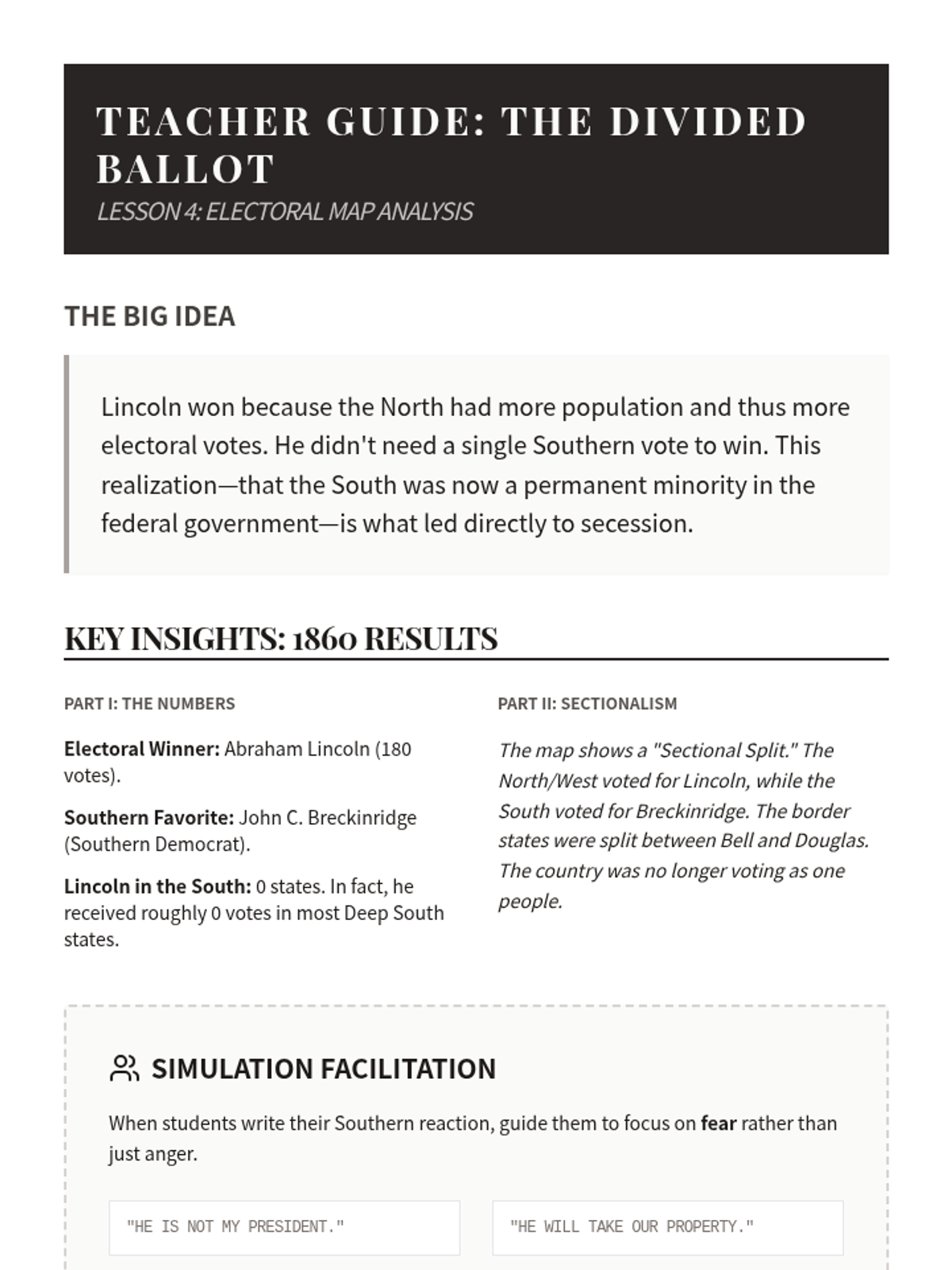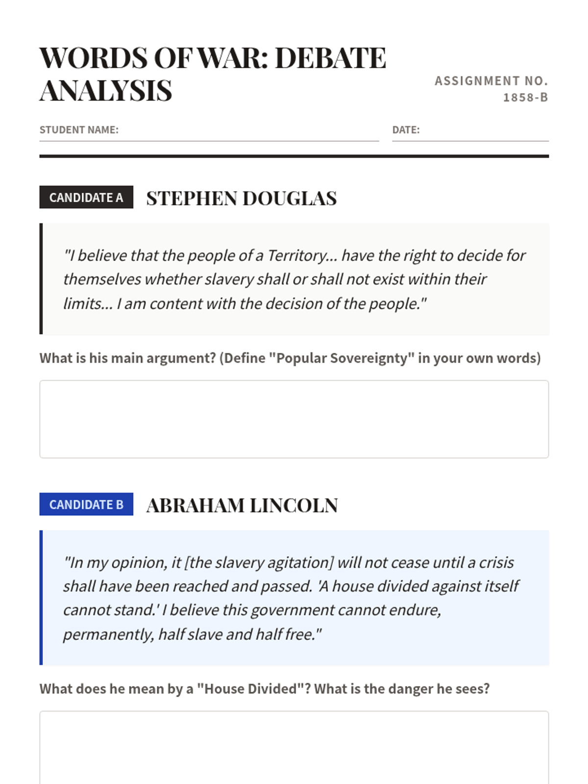 This sequence explores the pivotal events of the late 1850s that led to the American Civil War, focusing on primary source analysis of the Dred Scott decision, the Lincoln-Douglas debates, John Brown's raid, and the Election of 1860.