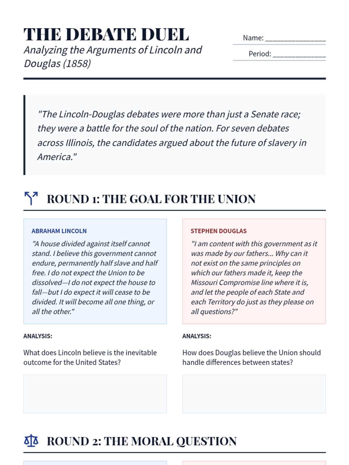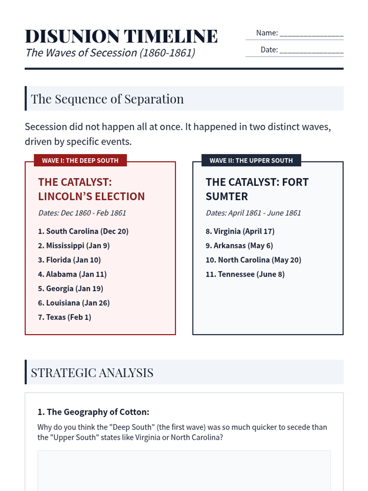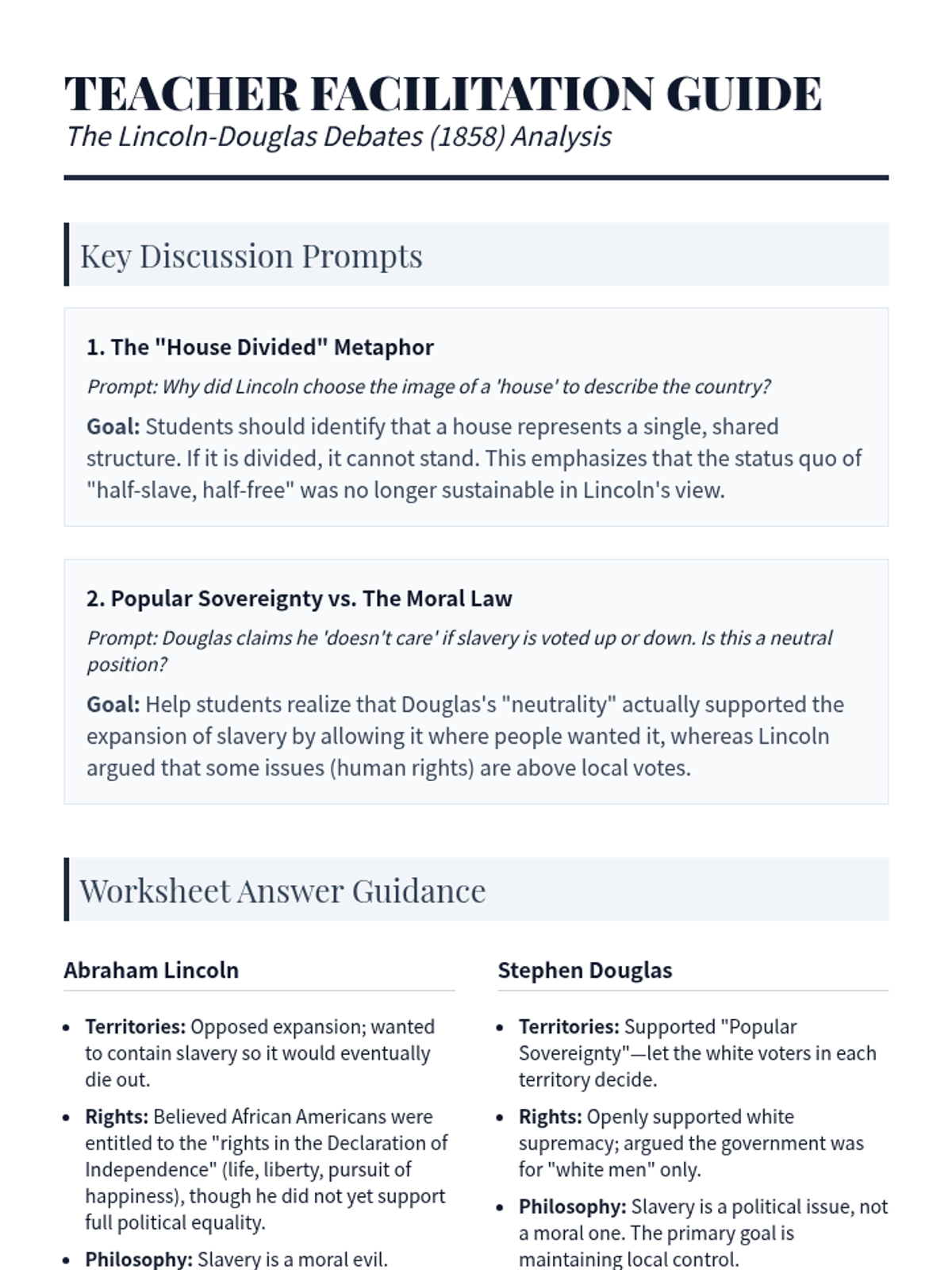 This sequence examines the critical events of the late 1850s that led to the American Civil War, including the Dred Scott decision, the Lincoln-Douglas debates, John Brown's raid, the Election of 1860, and the onset of secession. Students will analyze primary sources and legal rulings to understand the failure of diplomacy in the face of the slavery crisis.