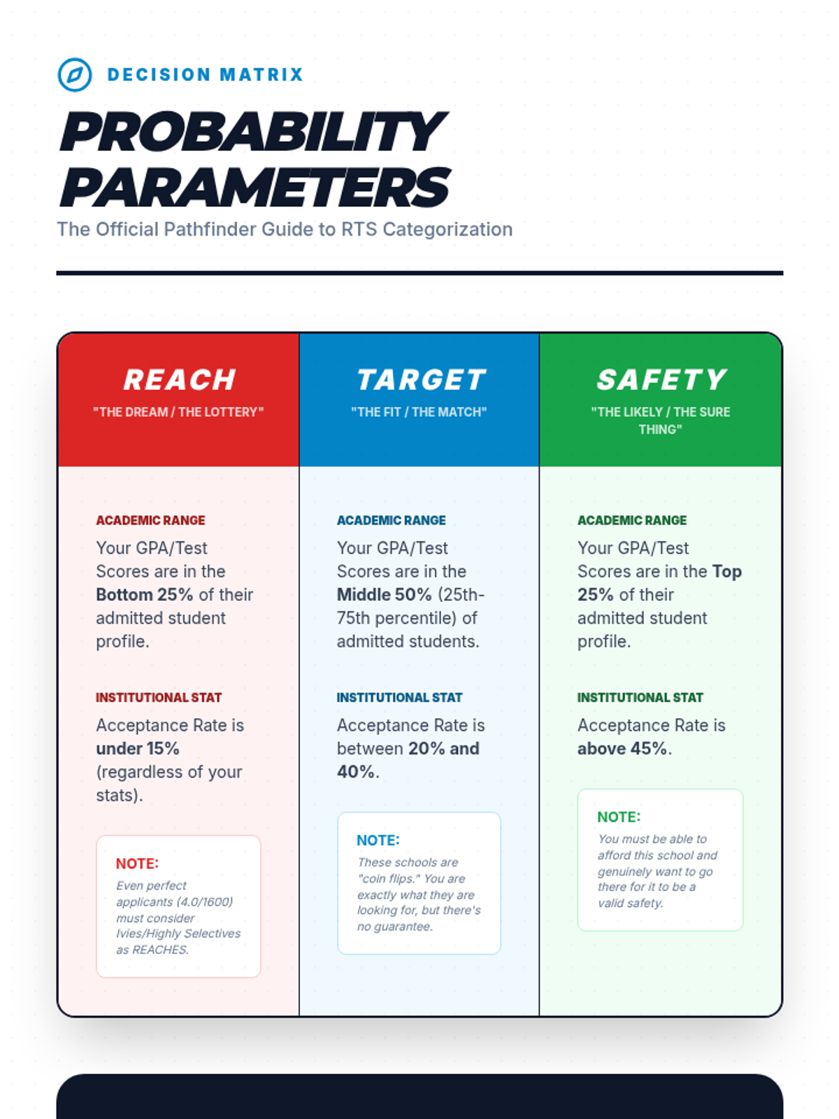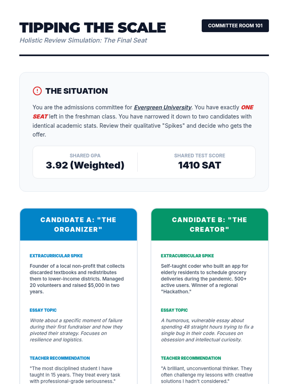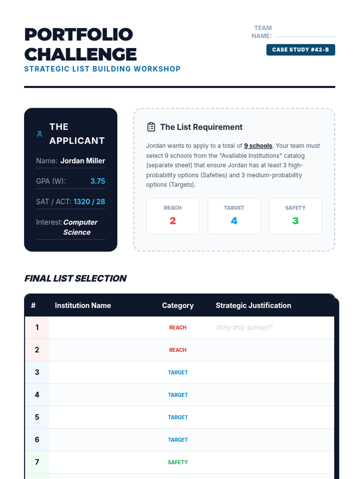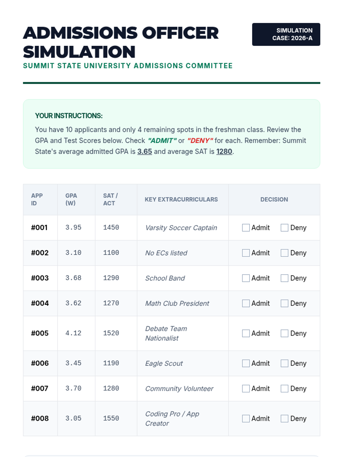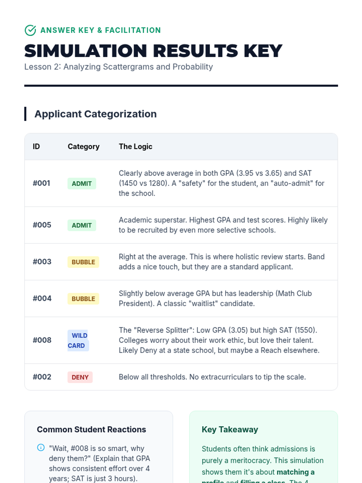 A data-driven sequence for 10th graders to understand college admissions metrics, interpret scattergrams, and build balanced college lists using quantitative and qualitative analysis.