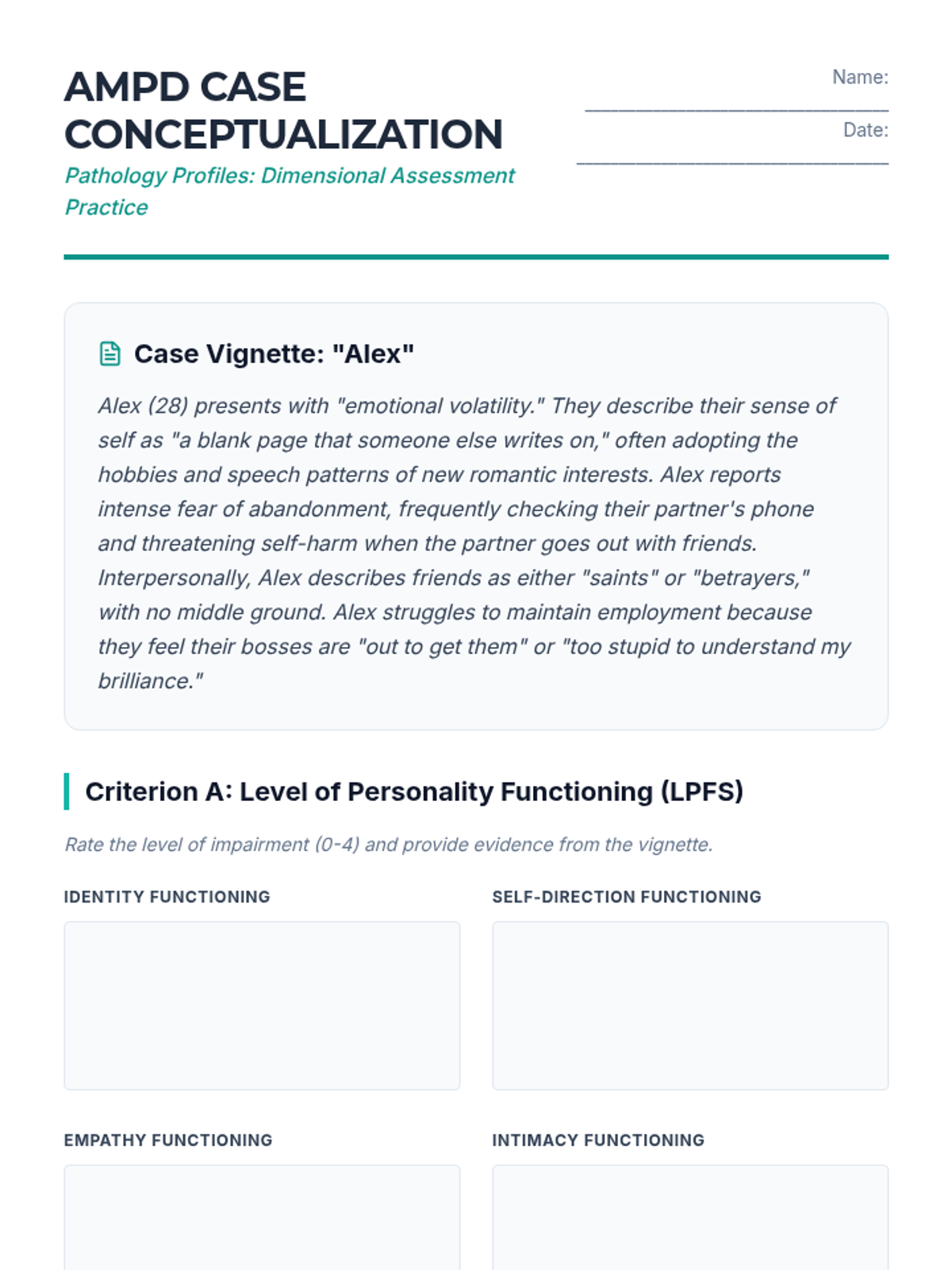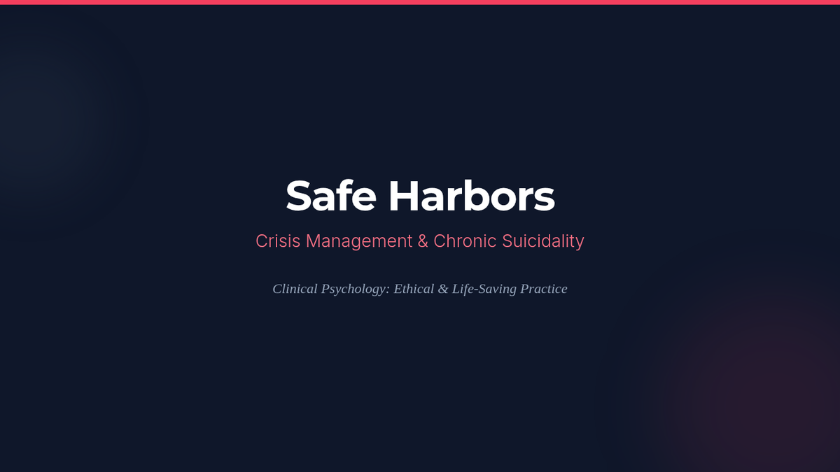 This graduate-level sequence explores the assessment and treatment of complex personality pathology. Students move beyond basic diagnostic criteria to master dimensional assessment (AMPD), Dialectical Behavior Therapy (DBT) skills, management of narcissistic dynamics, and high-risk crisis intervention.