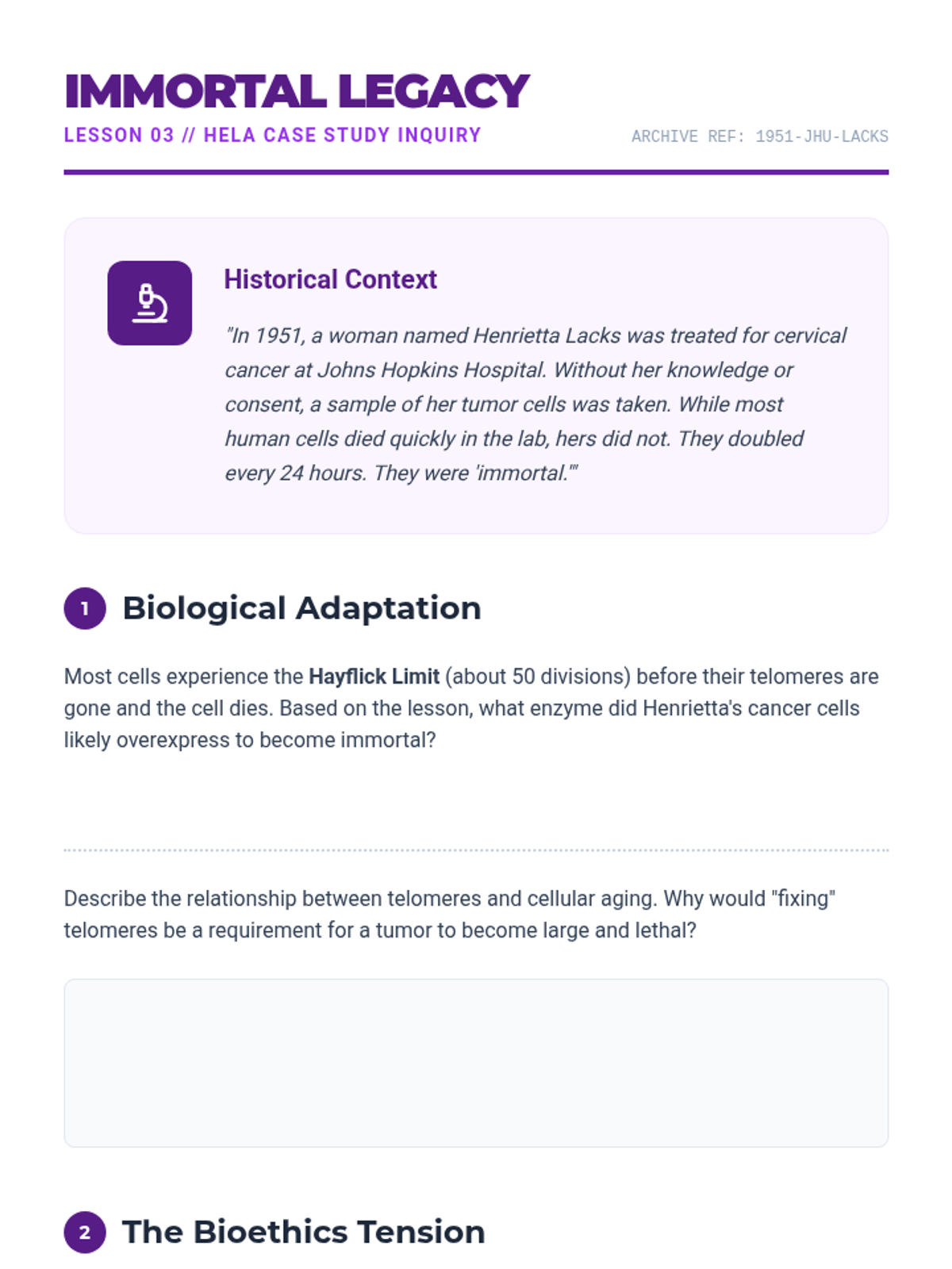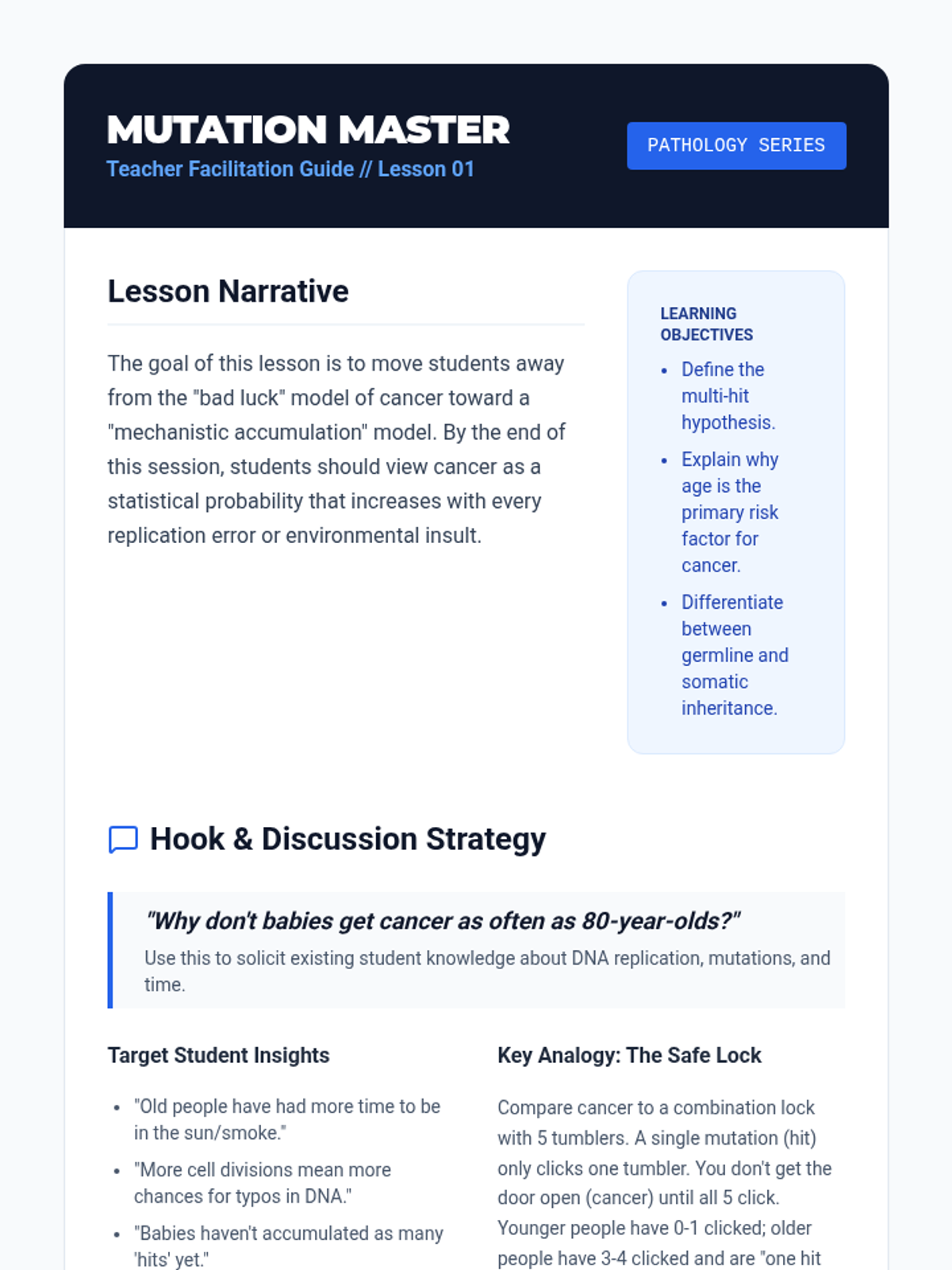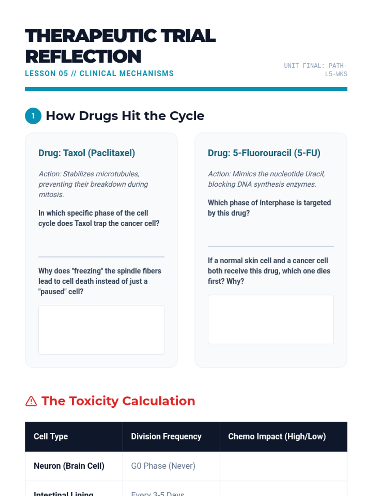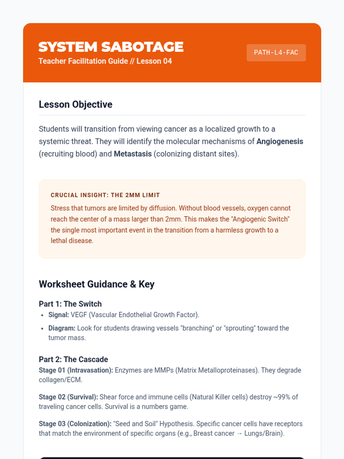 This sequence explores oncology through the lens of cell cycle regulation. Students investigate the genetic triggers of cancer, the functional differences between oncogenes and tumor suppressors, and the physiological adaptations that allow tumors to thrive and spread, concluding with an analysis of modern medical interventions.
