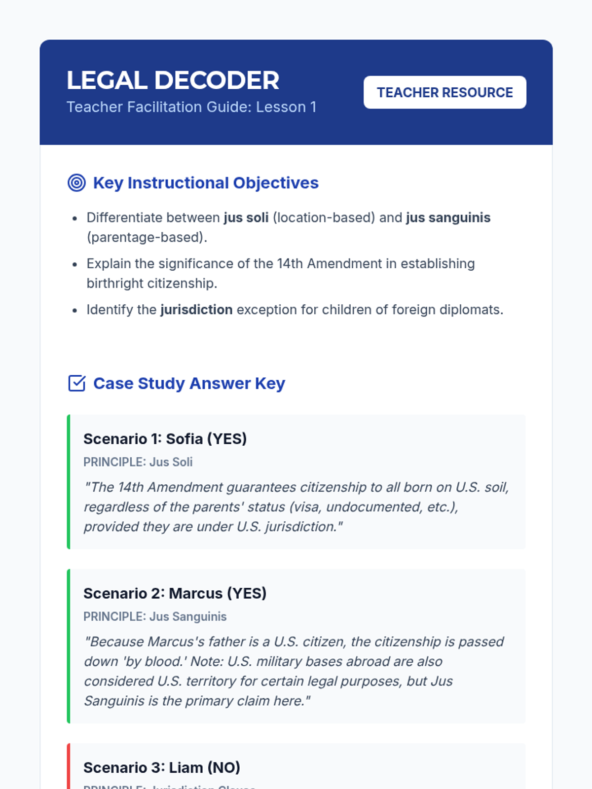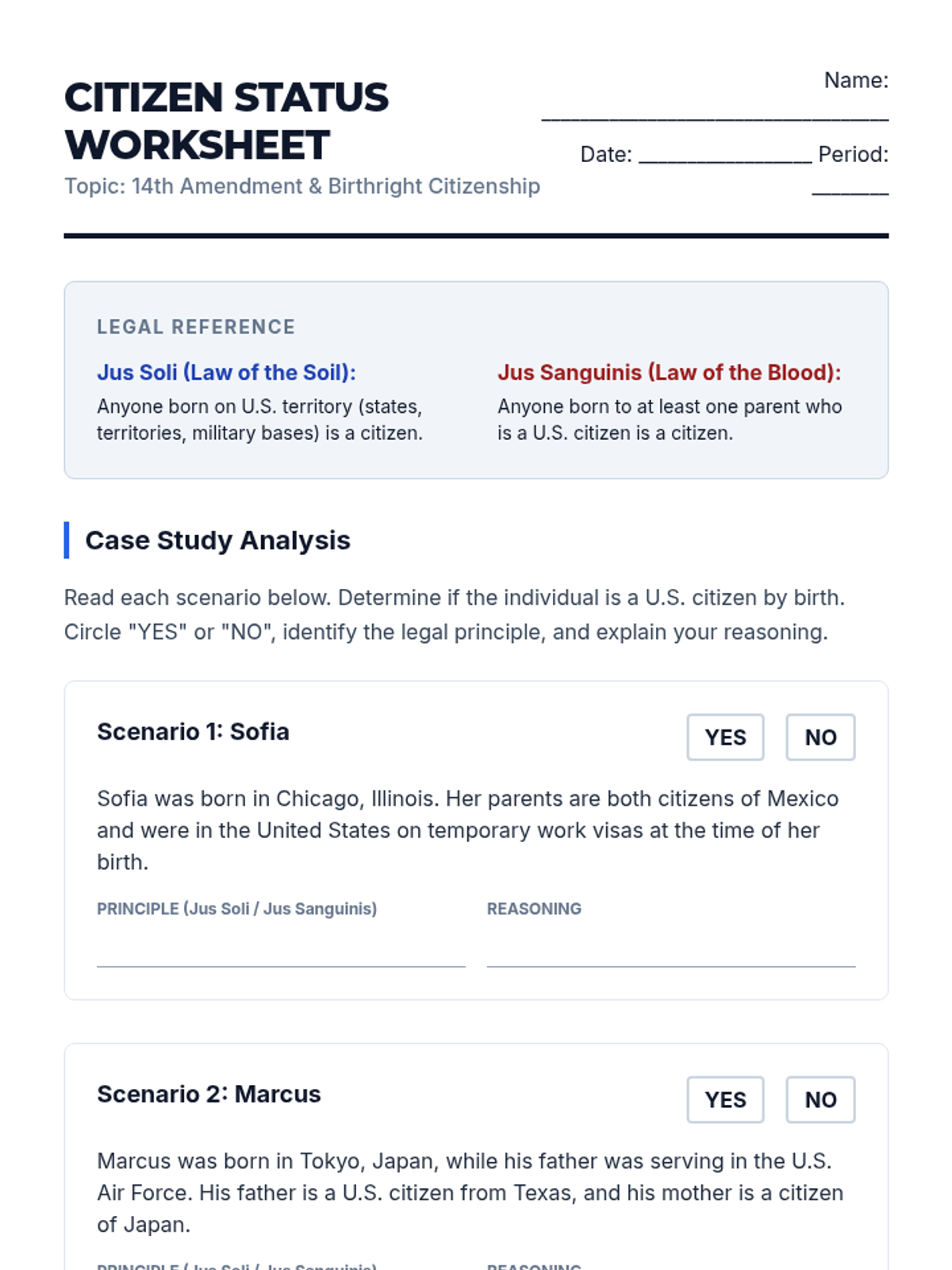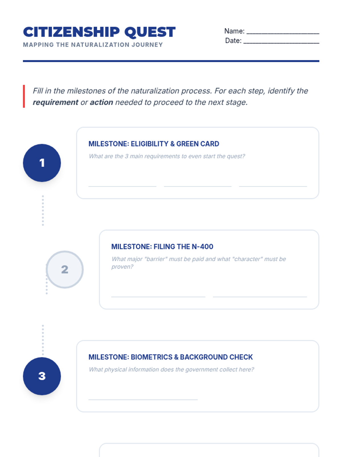 A comprehensive 8th-grade unit exploring the legal pathways to U.S. citizenship. Students analyze the 14th Amendment, navigate the naturalization process, and participate in a mock naturalization simulation.