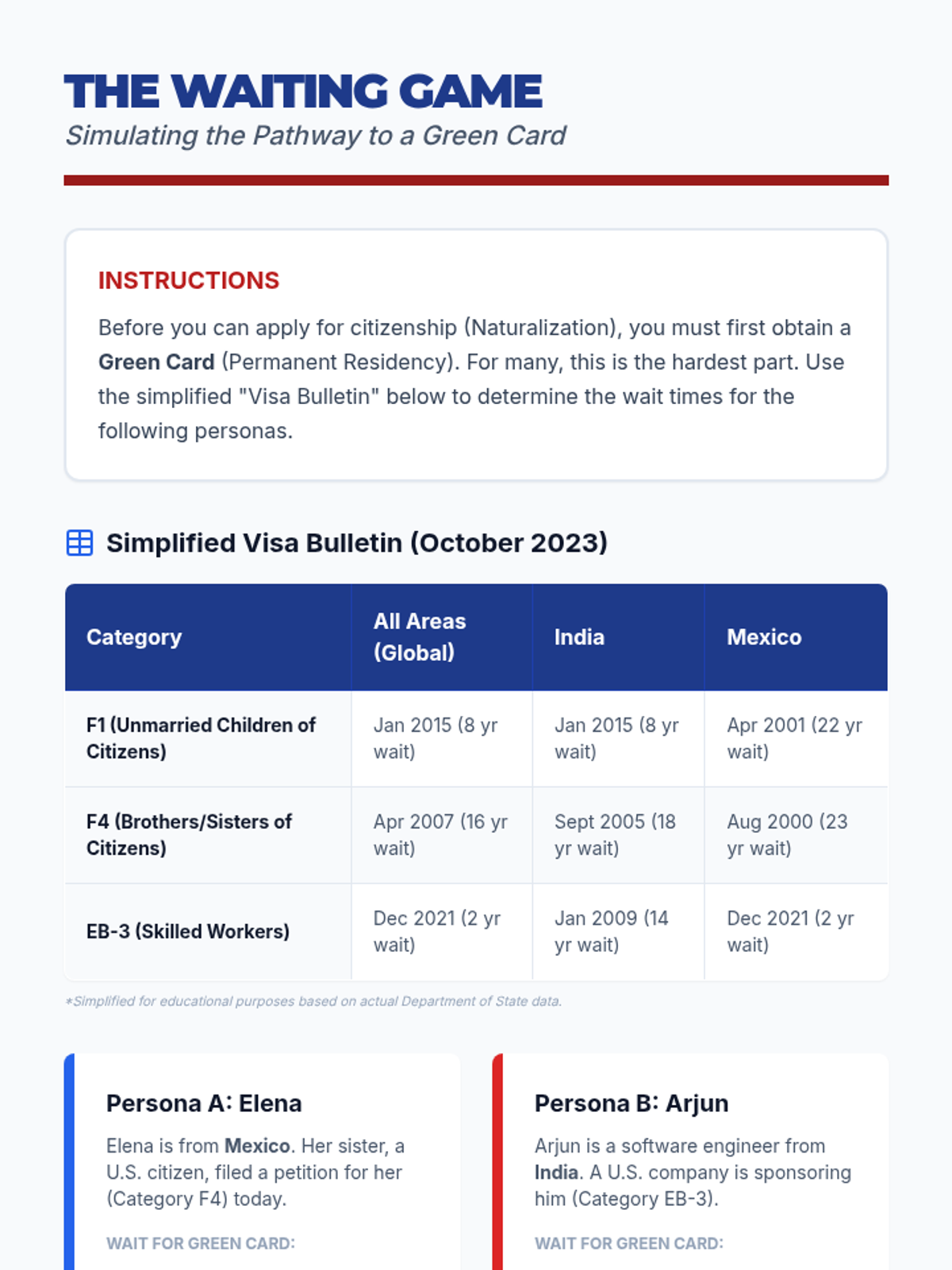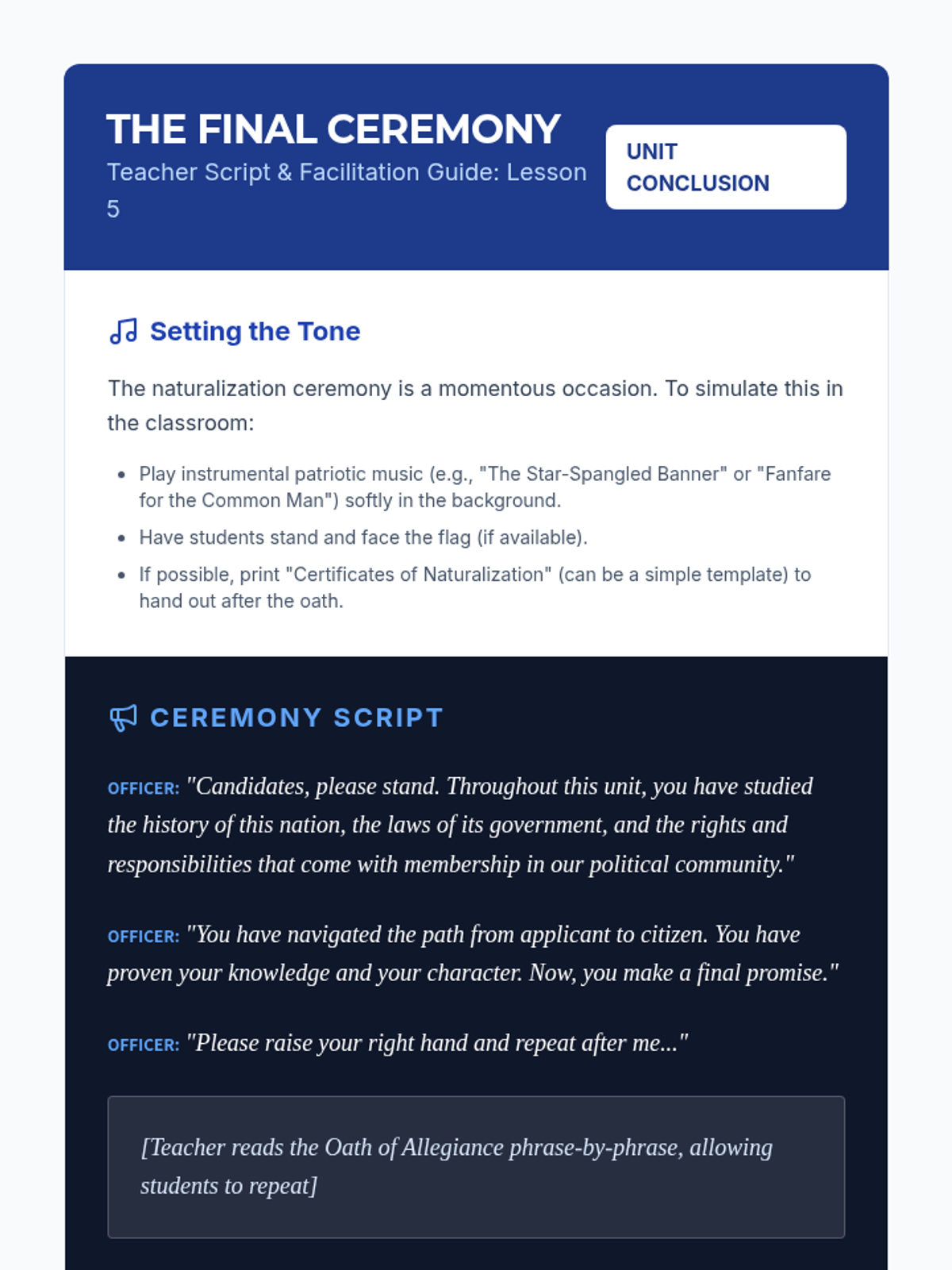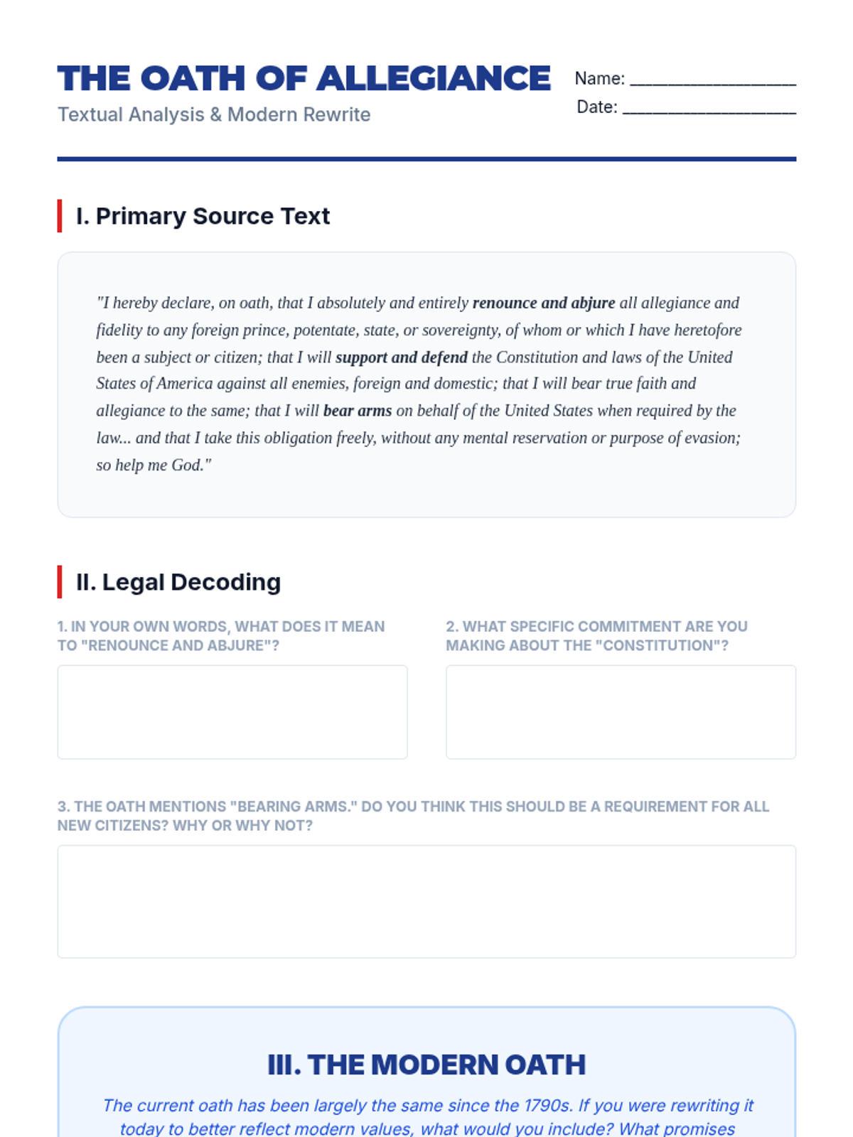 A comprehensive 8th-grade unit exploring the legal pathways to U.S. citizenship. Students analyze the 14th Amendment, navigate the naturalization process, and participate in a mock naturalization simulation.