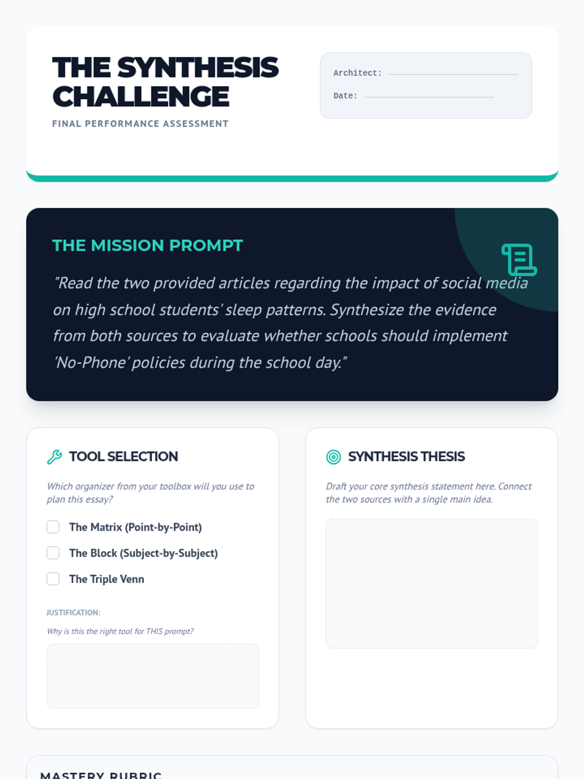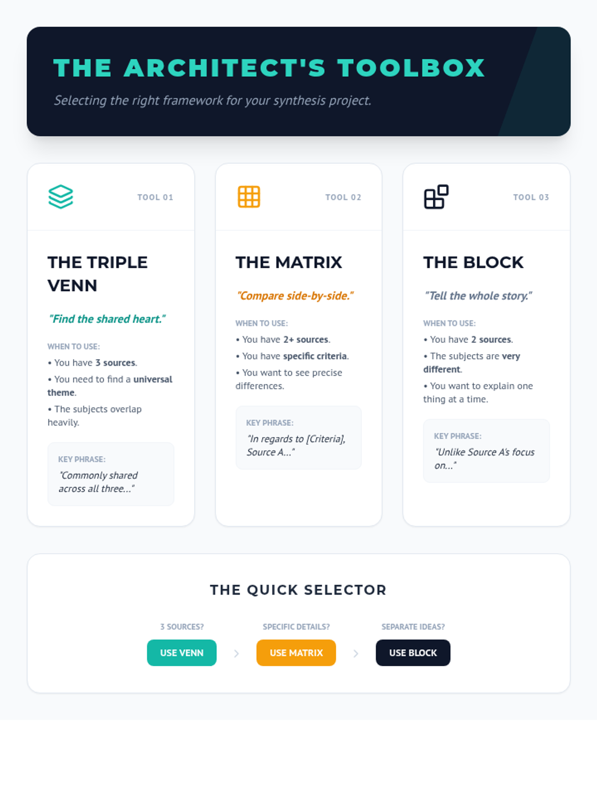This sequence teaches 9th-grade students how to synthesize information from multiple sources using advanced graphic organizers. Students progress from three-way Venn diagrams to matrices, block methods, and problem-solution maps, culminating in a project where they select the best tool for a complex writing task.