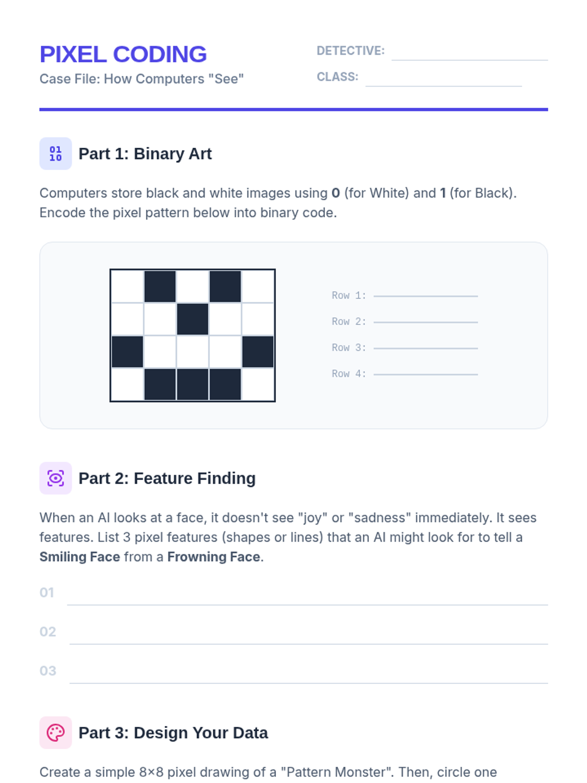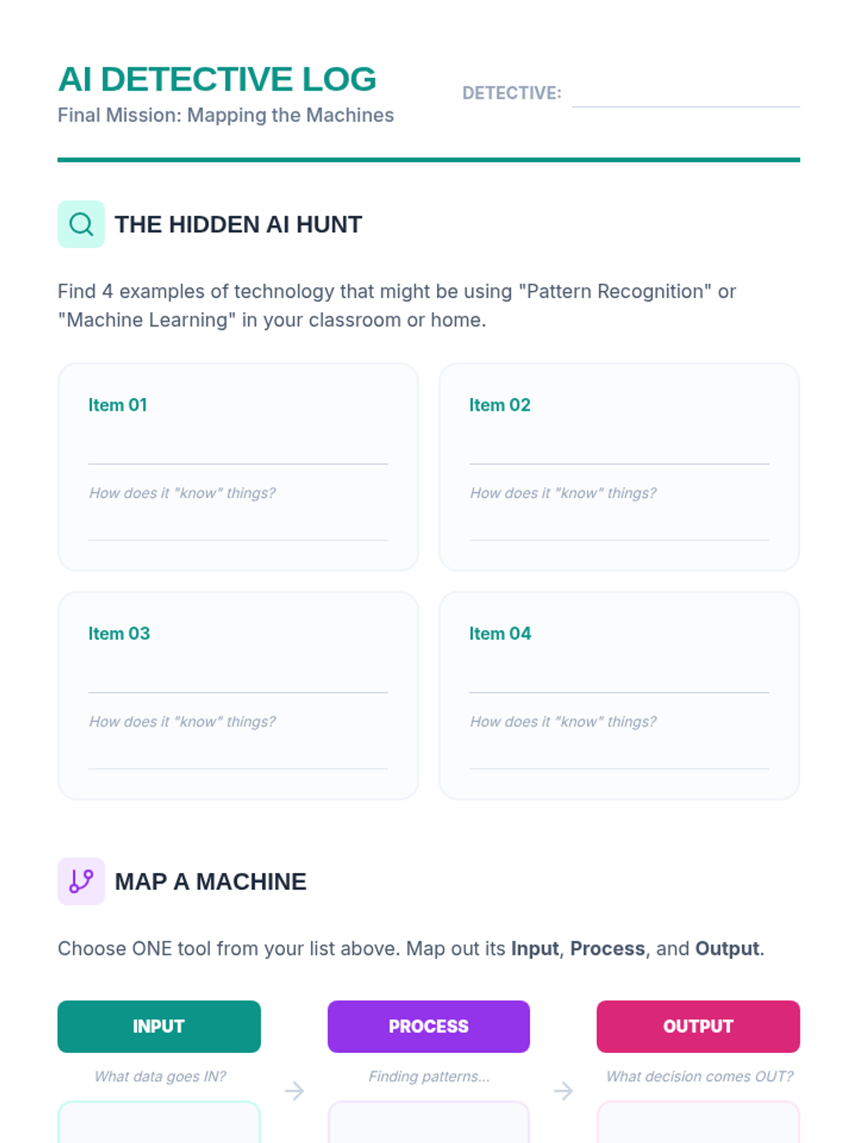 This sequence introduces 4th-grade students to machine learning and pattern recognition through a detective-themed exploration. Students move from understanding basic rules to analyzing complex data training, visual recognition, and algorithmic bias.