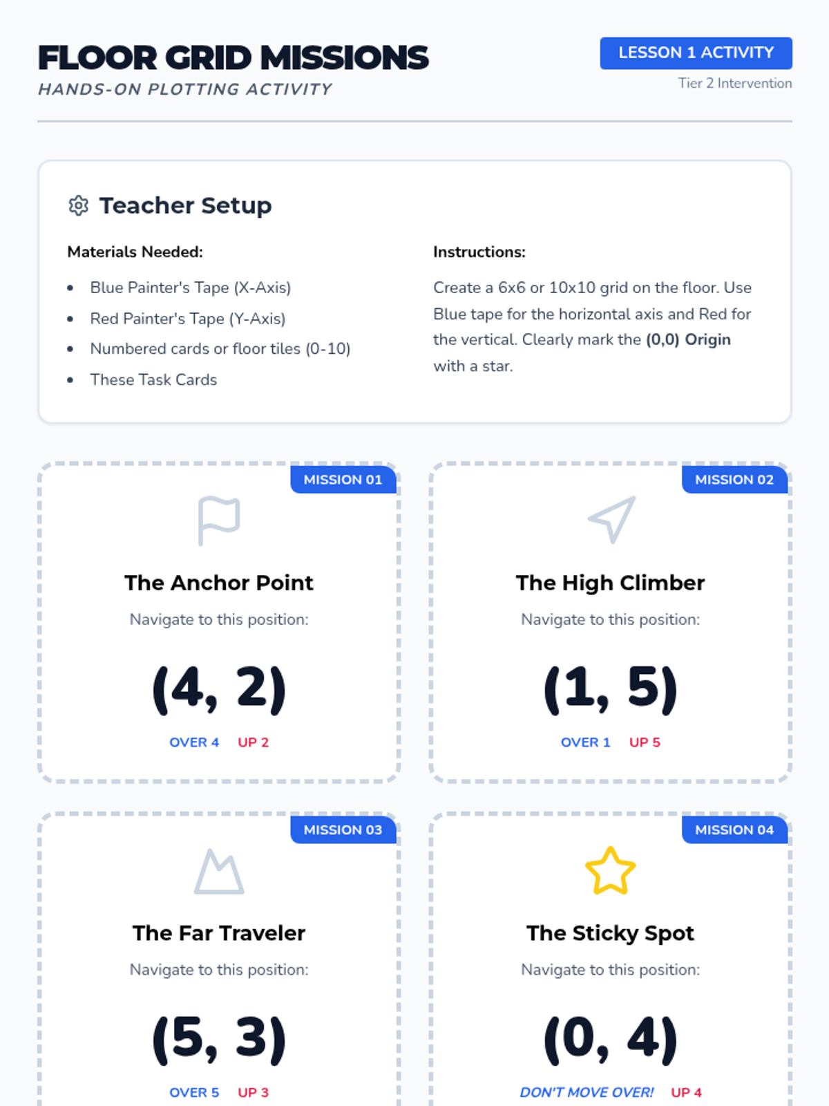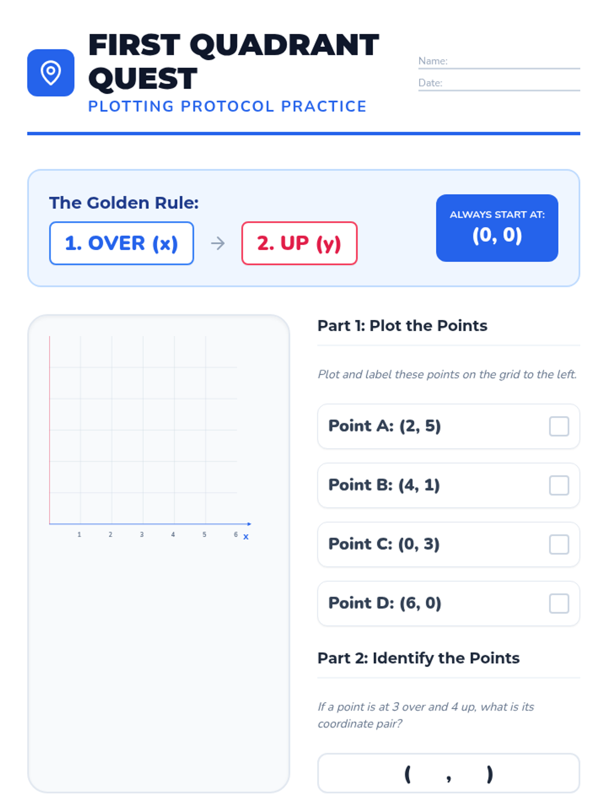 A 2-lesson intervention sequence focused on mastering the first quadrant of the coordinate plane through hands-on exploration and pattern-based plotting. Students develop a strong foundation in the 'over, then up' protocol to bridge the gap between basic graphing and algebraic patterns.