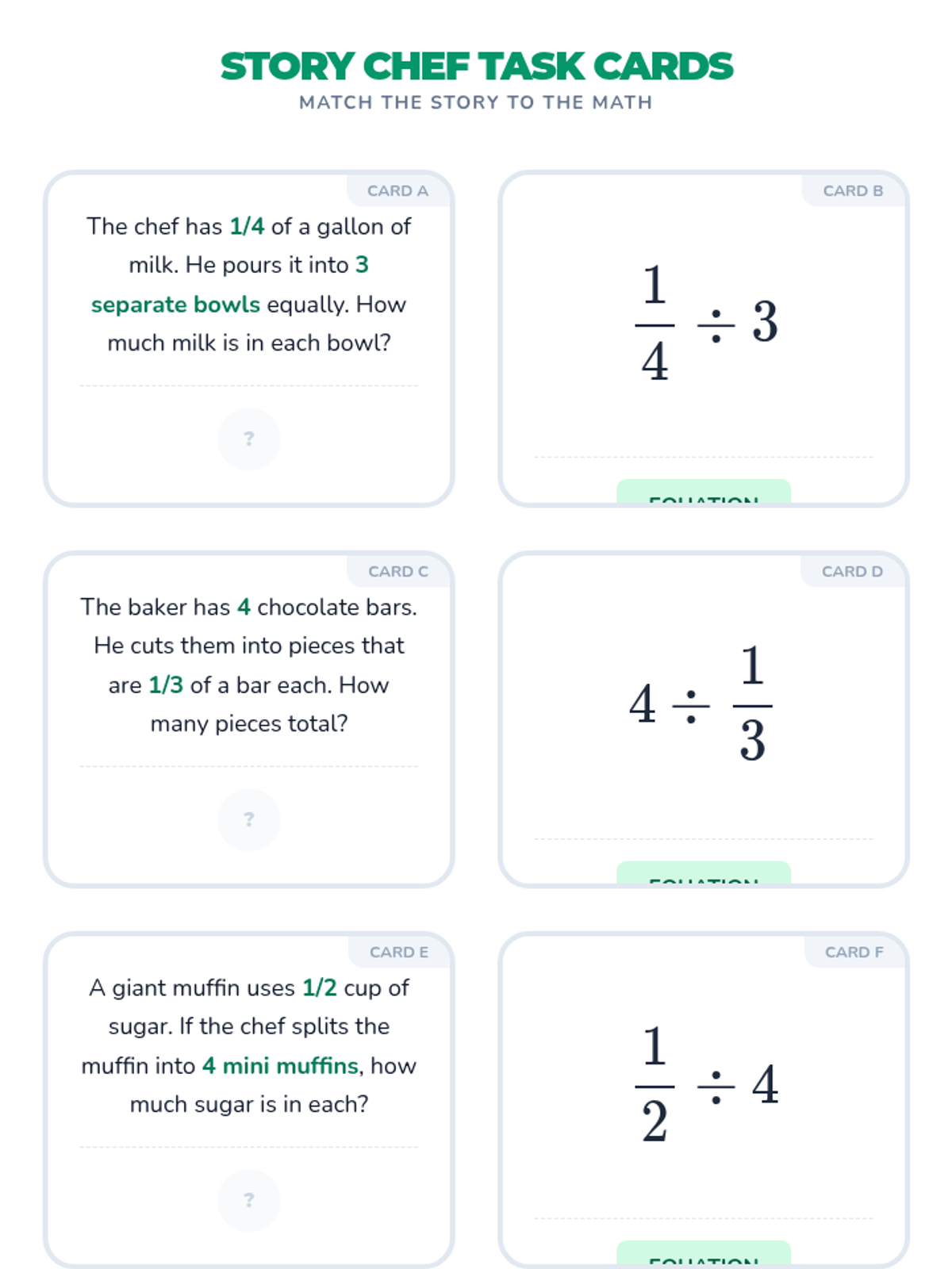 A Tier 2 intervention sequence focused on dividing unit fractions by whole numbers and vice versa, using bakery-themed visual models and story-based learning. Students use fraction strips, number lines, and area models to master 5.NF.B.7.