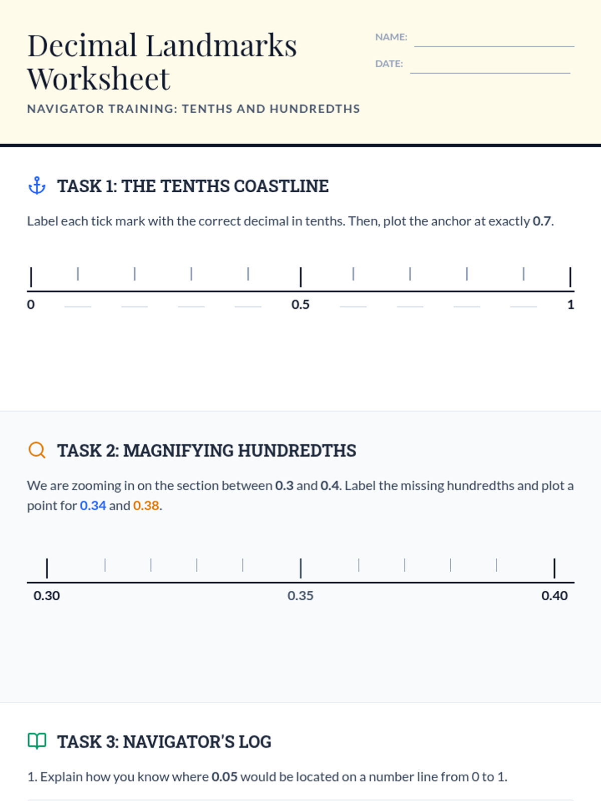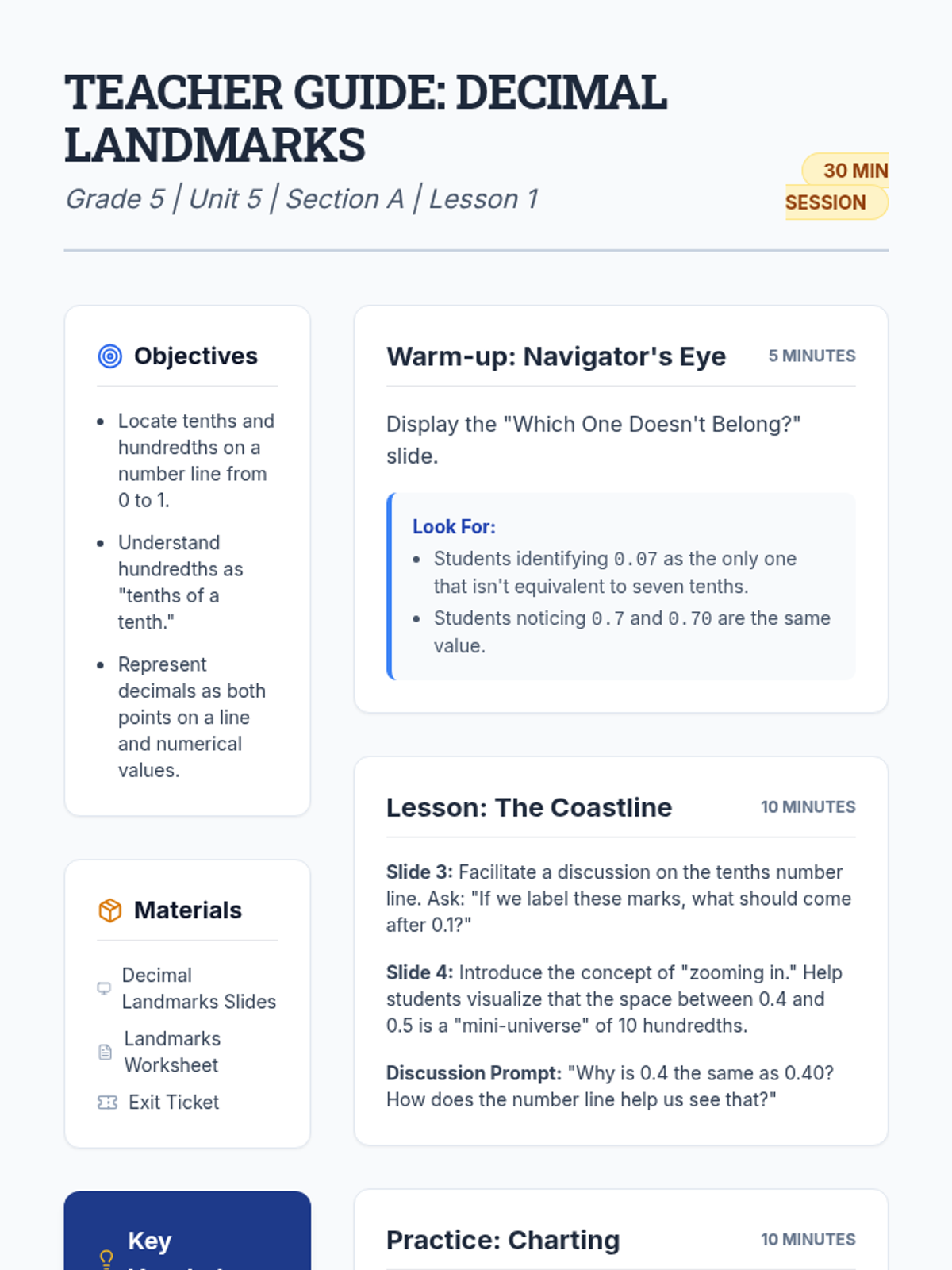 A series of 3 lessons focused on mastering decimal place value and ordering decimals on a number line, following Illustrative Mathematics Grade 5 Unit 5 Section A. Students use a map-making theme to explore tenths, hundredths, and thousandths.