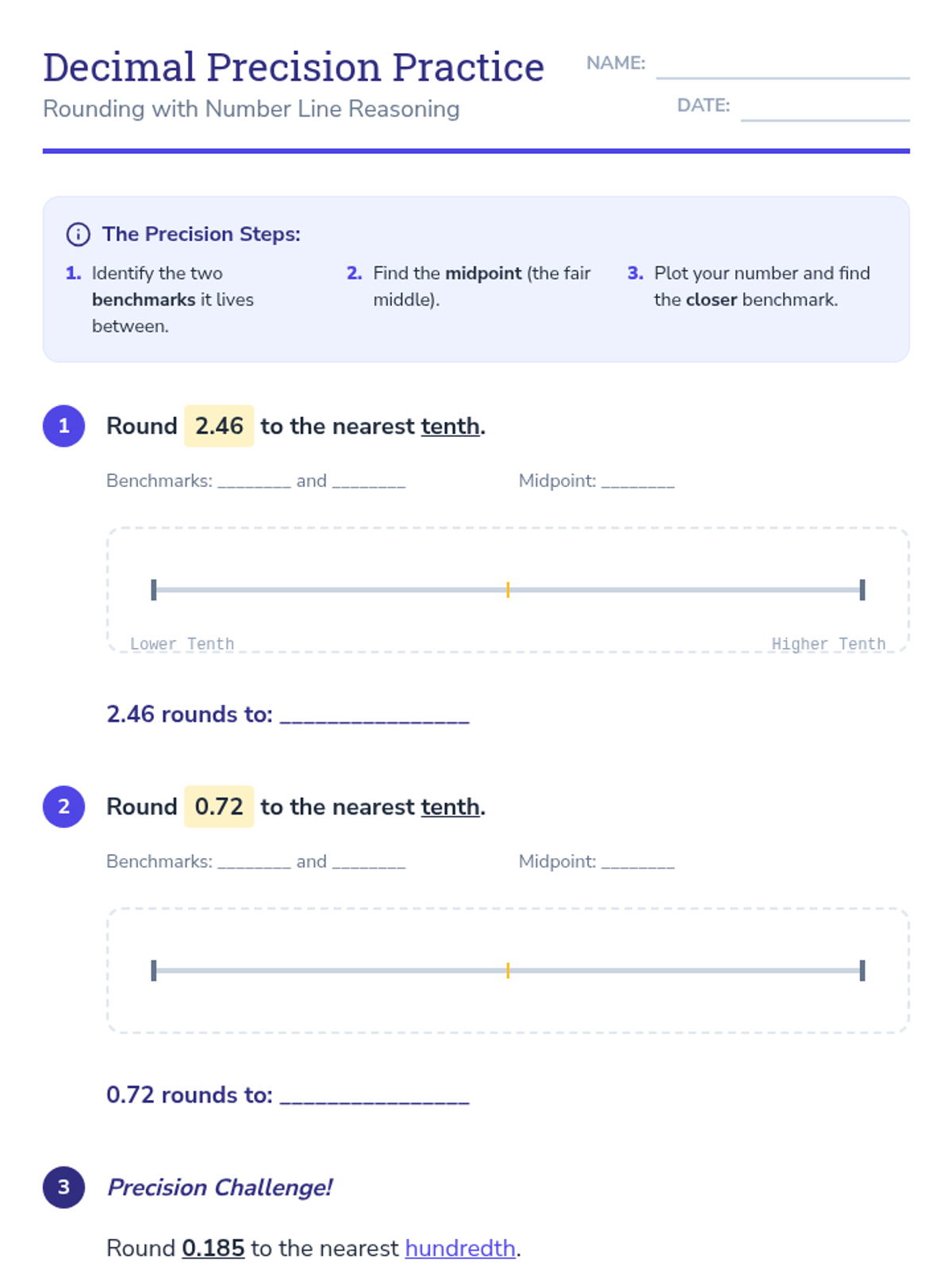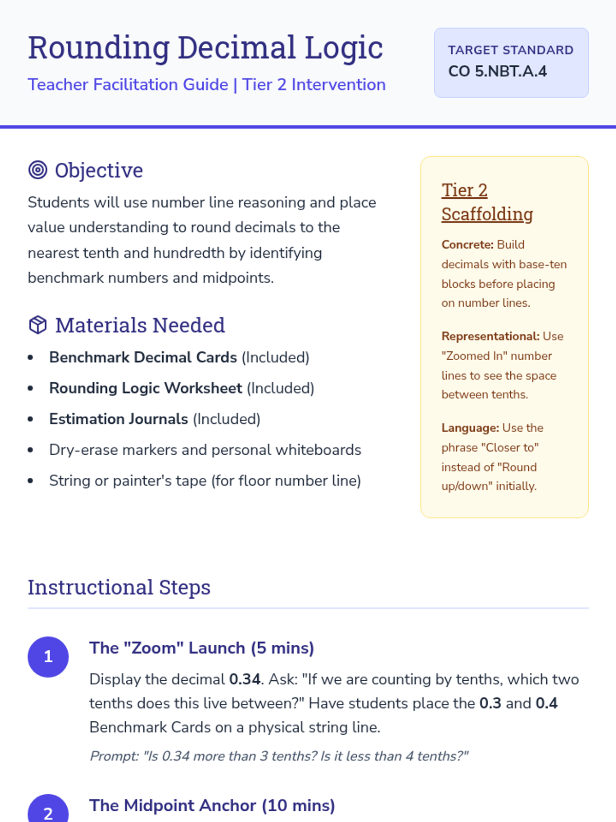 A Tier 2 intervention sequence focused on developing deep conceptual understanding of rounding decimals using place value and number line reasoning, aligned with Colorado standard 5.NBT.A.4.