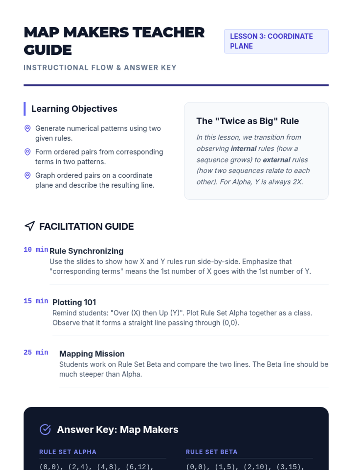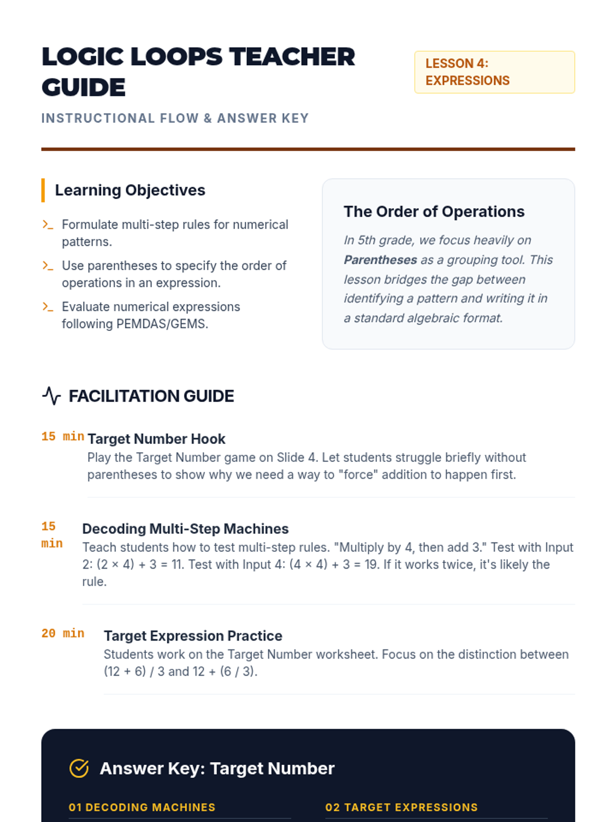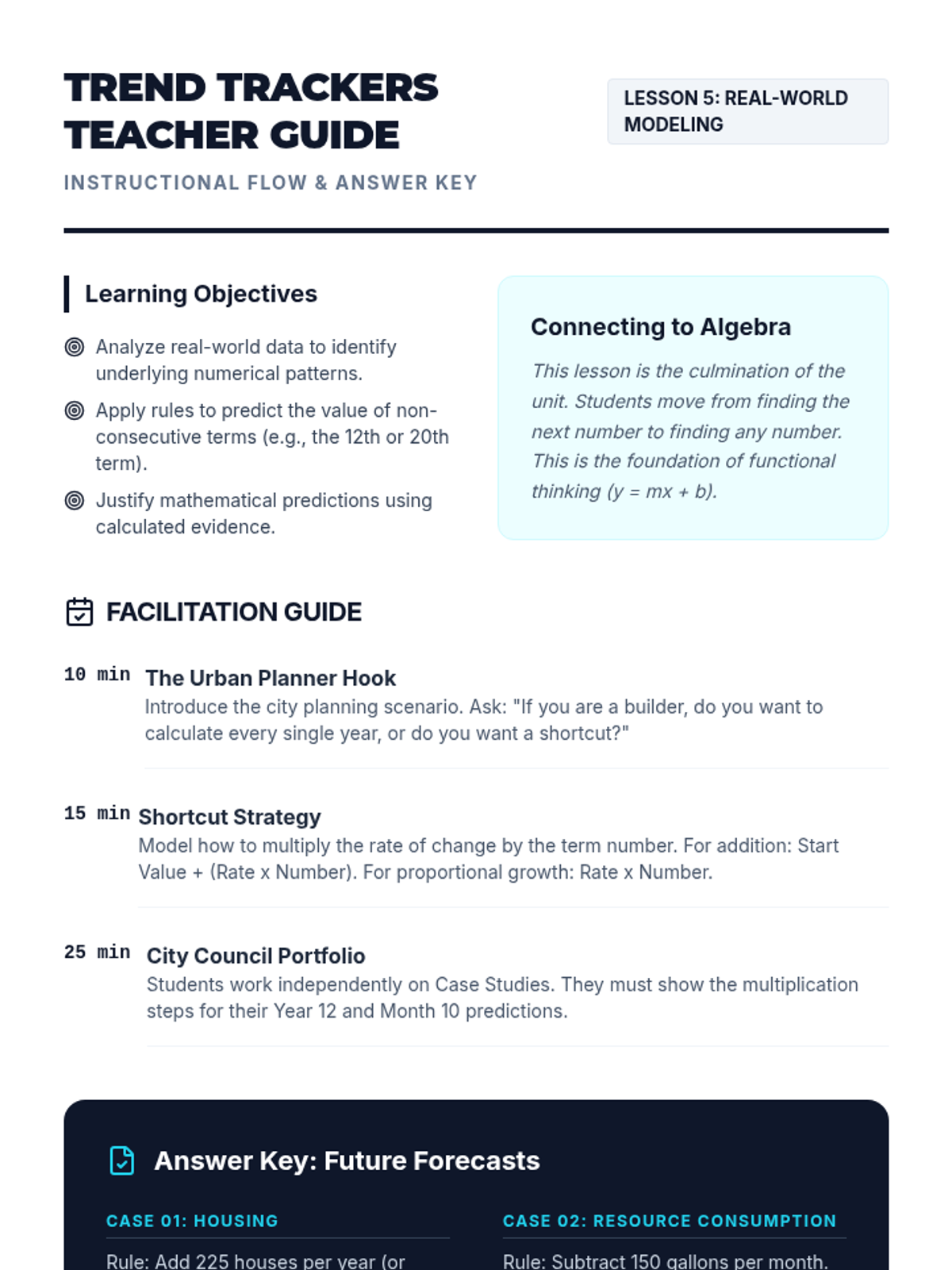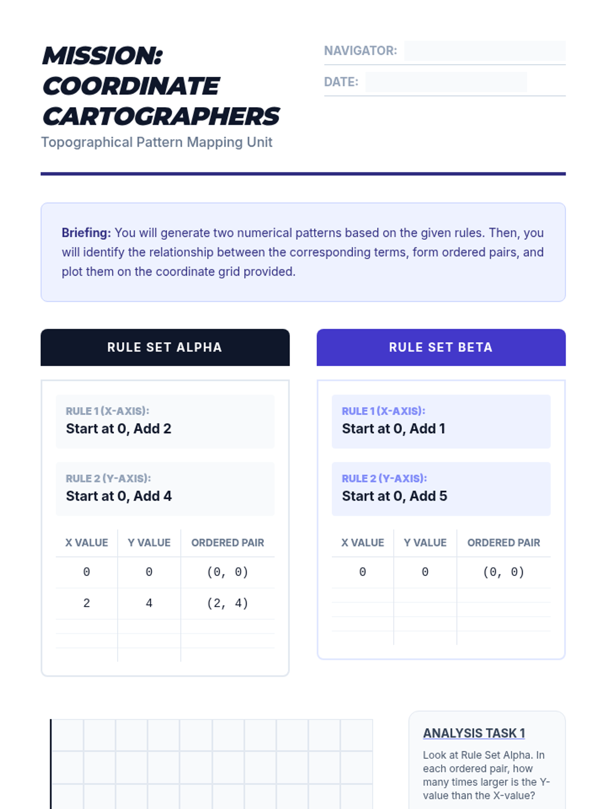 A comprehensive sequence for 5th-grade students focusing on identifying, generating, and graphing numerical patterns using the four operations. Students progress from simple additive rules to multi-step expressions and coordinate plane visualization.