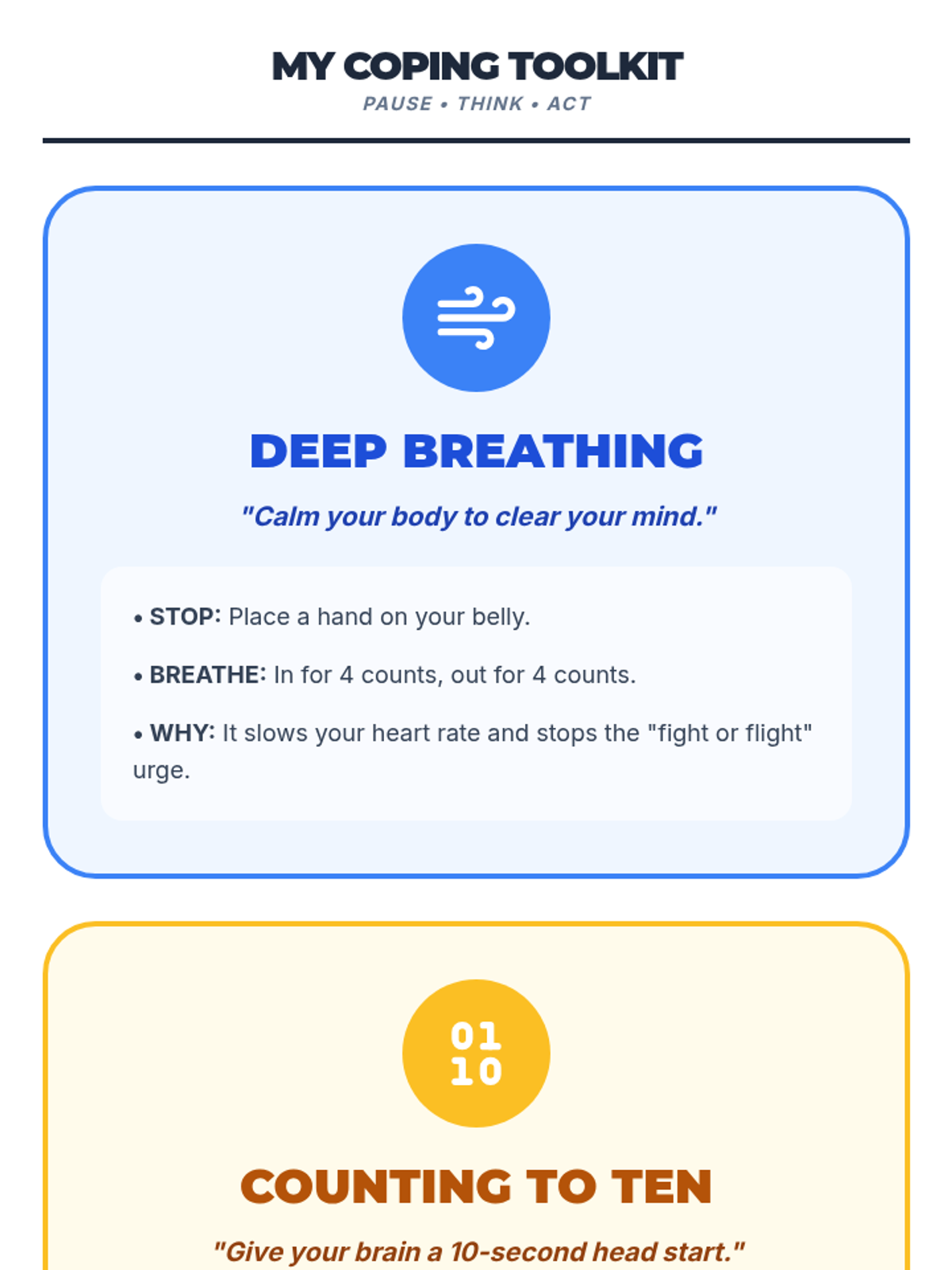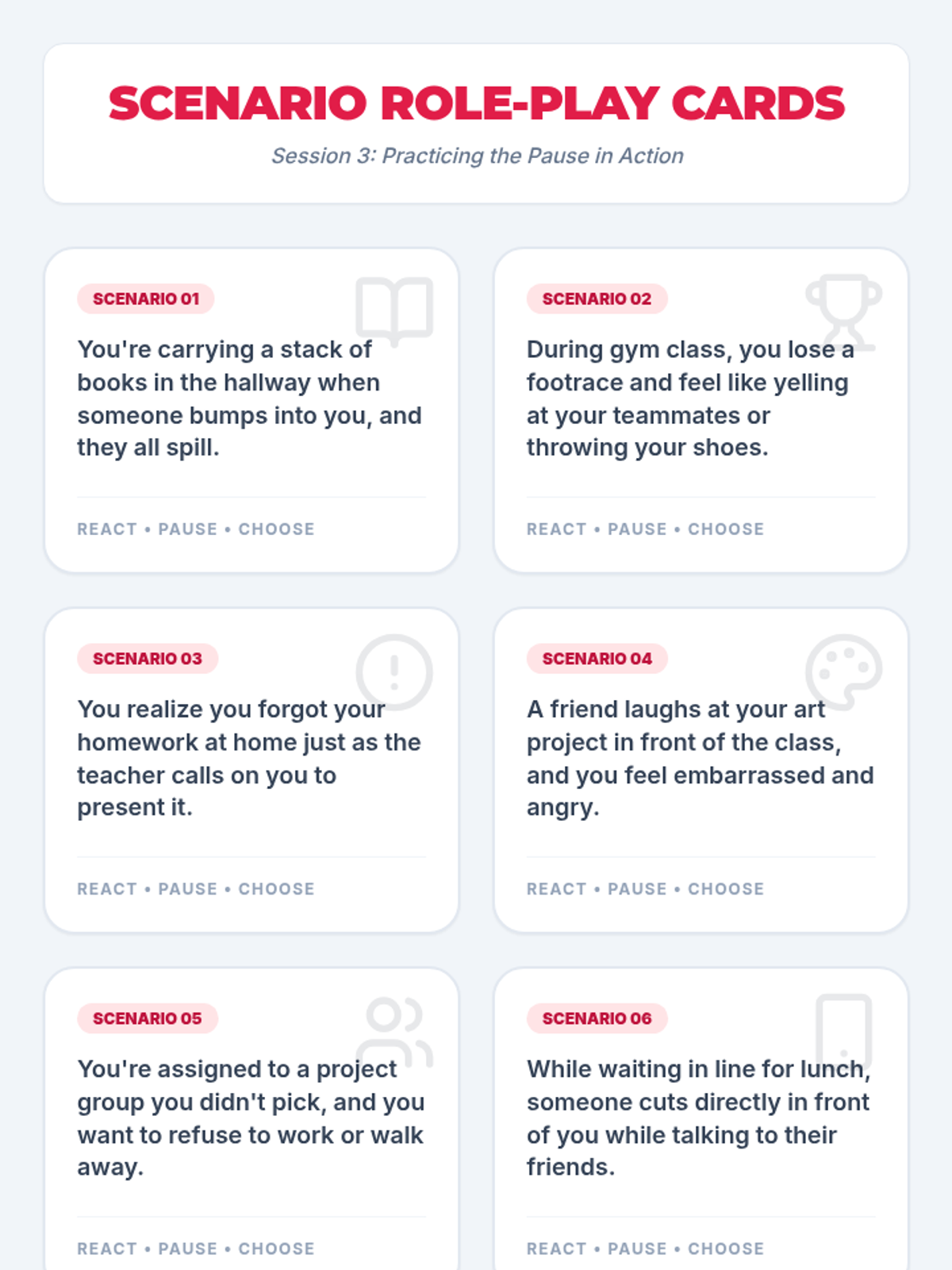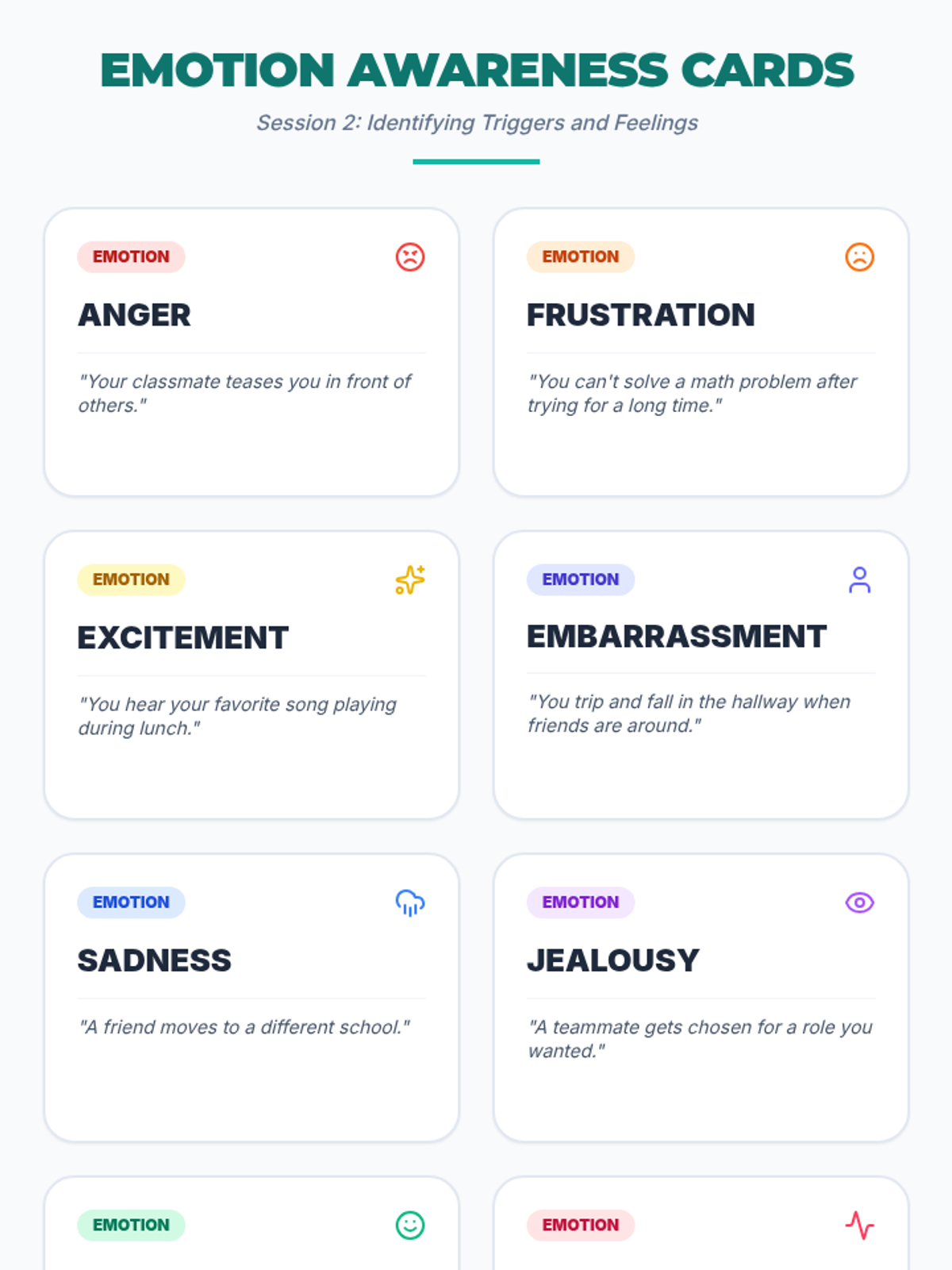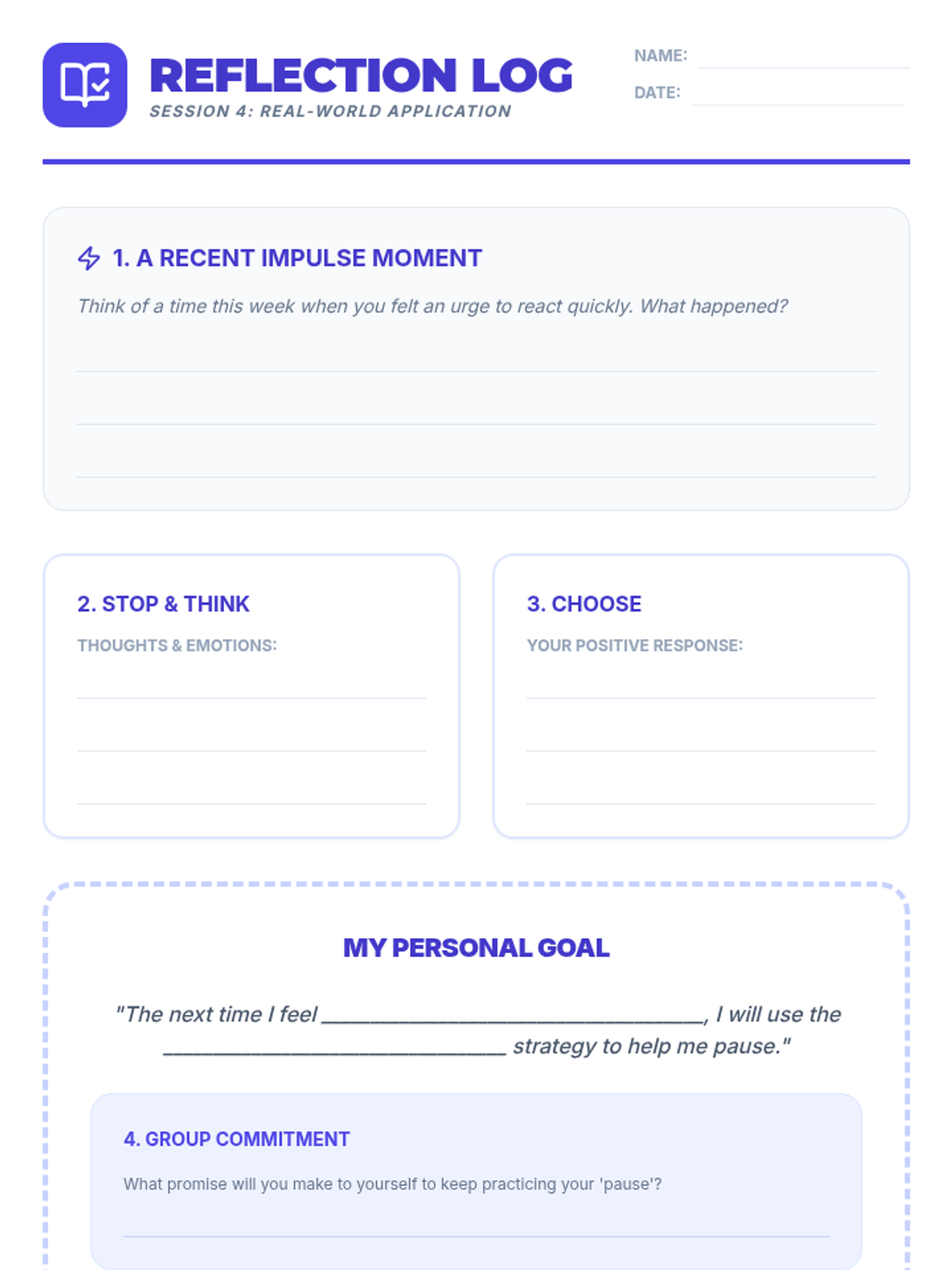 A 4-session Tier 2 intervention designed for 6th graders to improve impulse control. Students learn to recognize emotional triggers, practice 'stop-and-think' techniques, and build a personalized toolkit of coping strategies for real-world application.