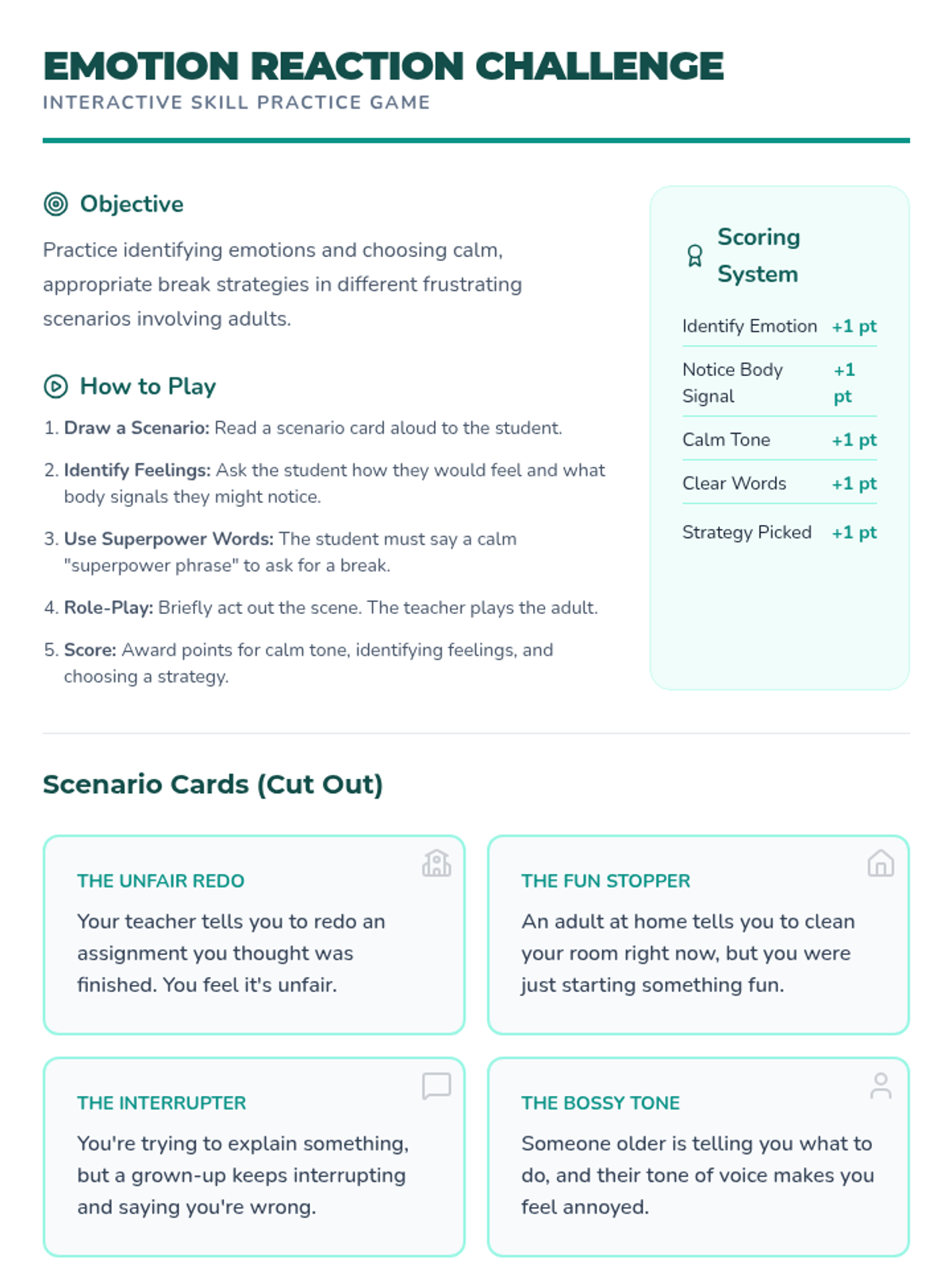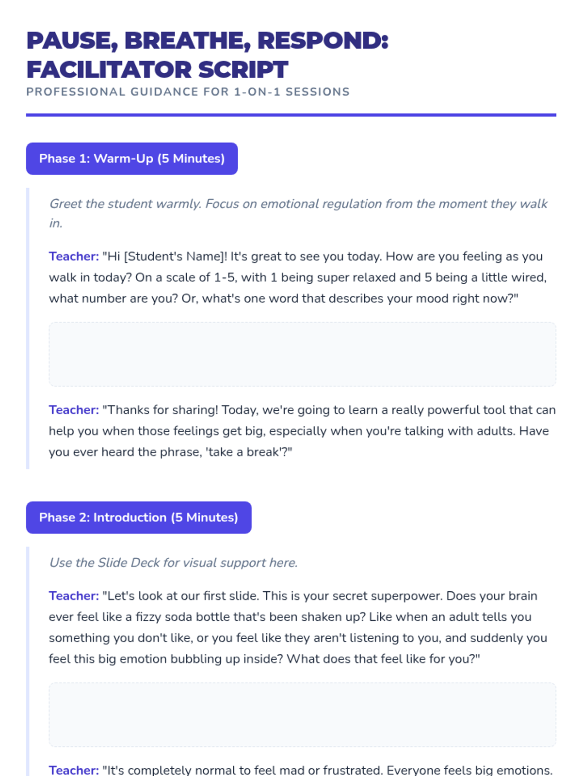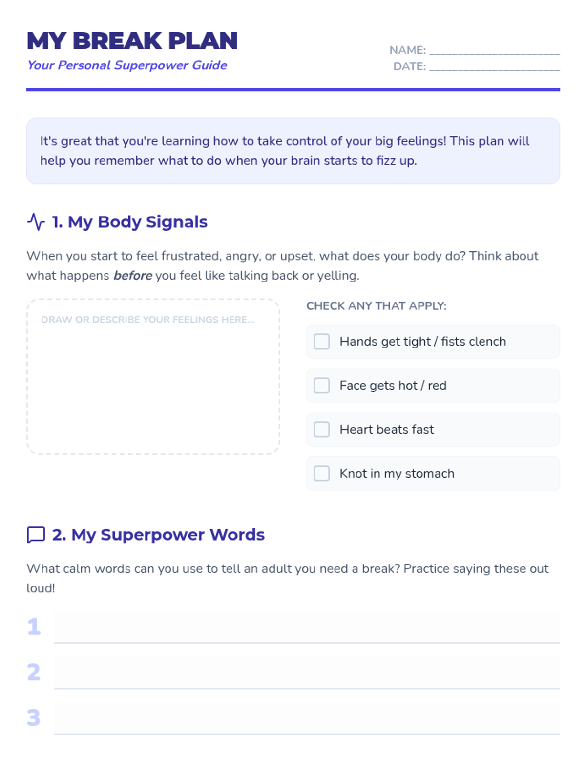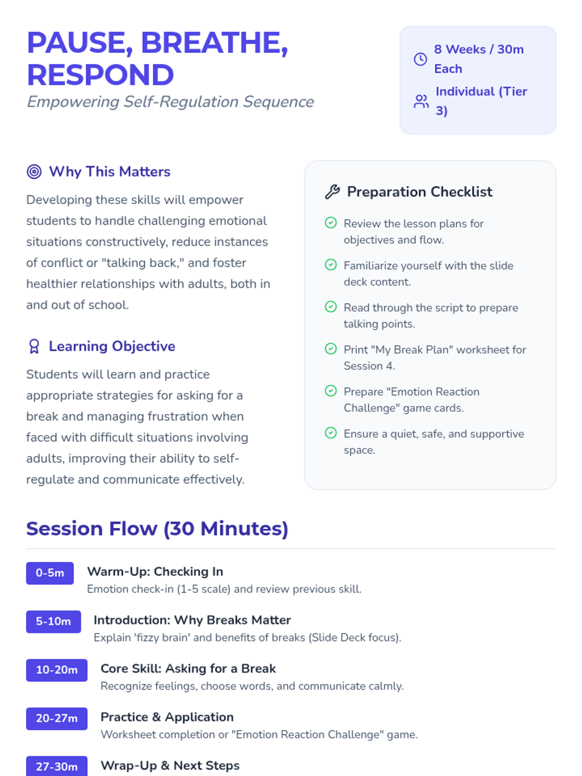 An 8-week individual counseling sequence designed for a 5th-grade girl to develop self-regulation skills, learn to ask for breaks, and manage frustration in interactions with adults. The program uses a 'superpower' theme to empower the student through body awareness, calm communication, and proactive planning.