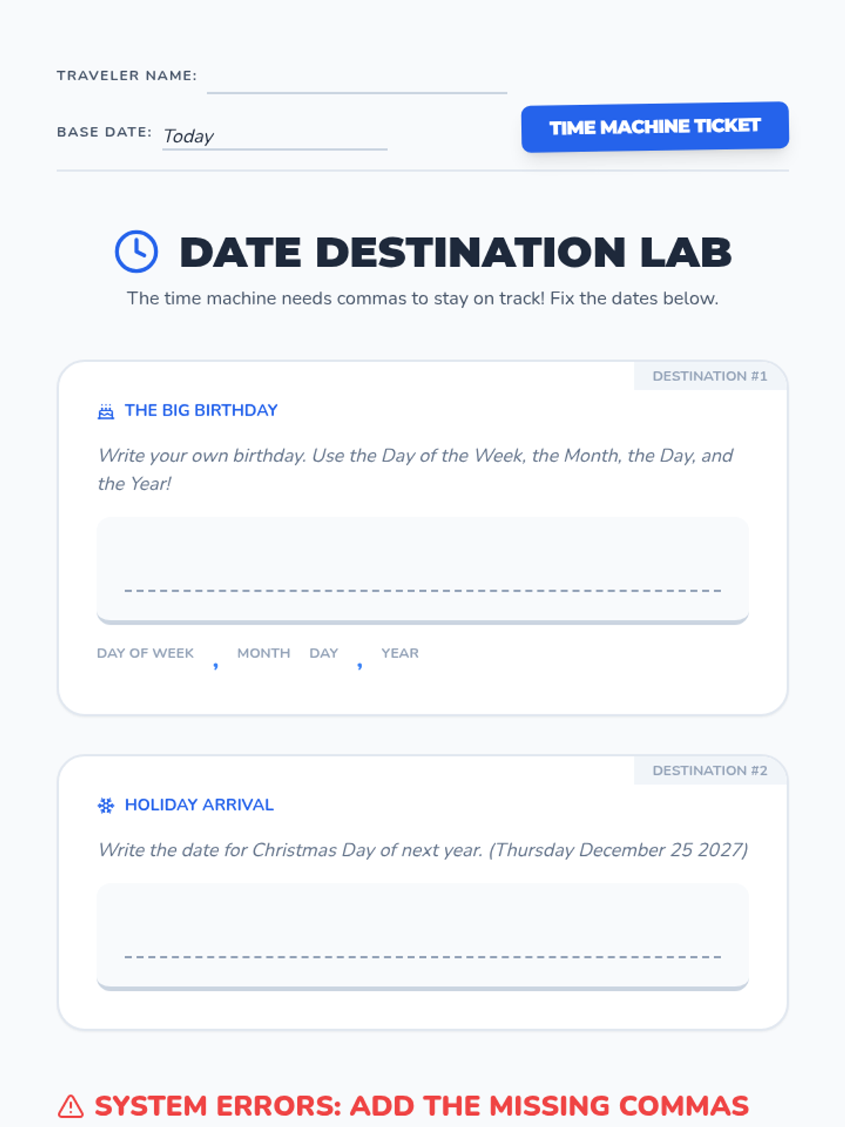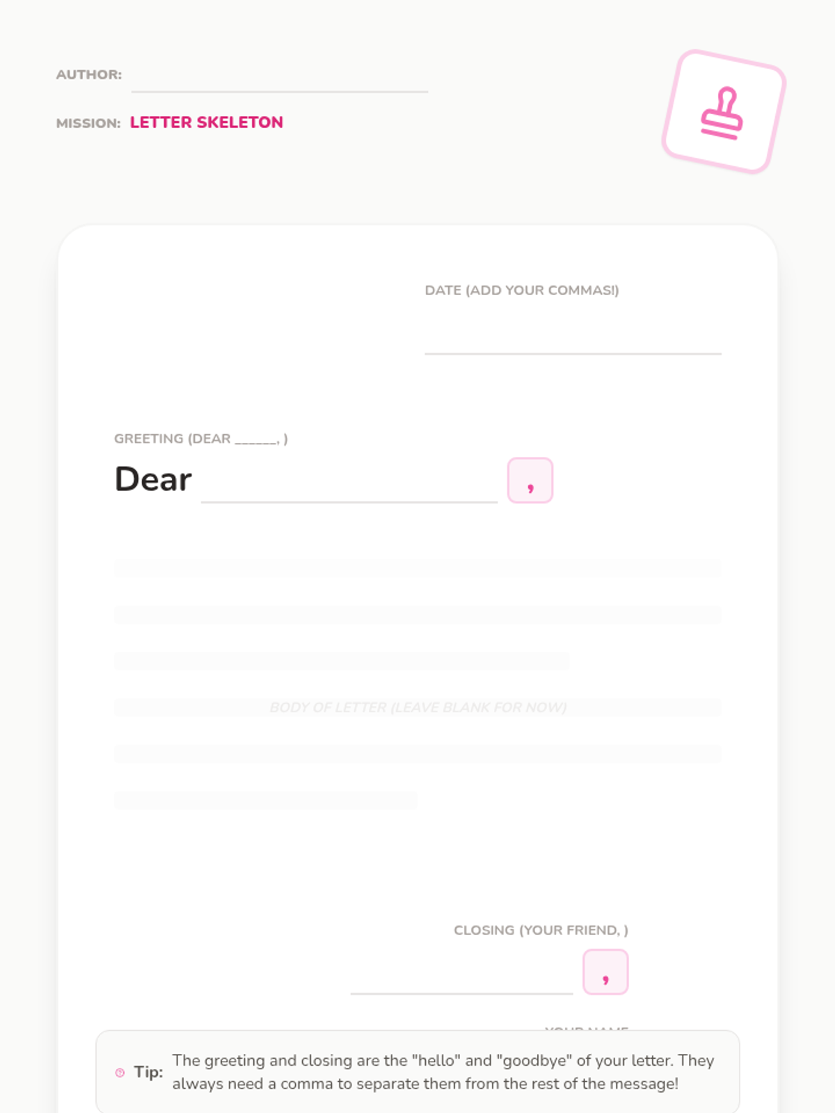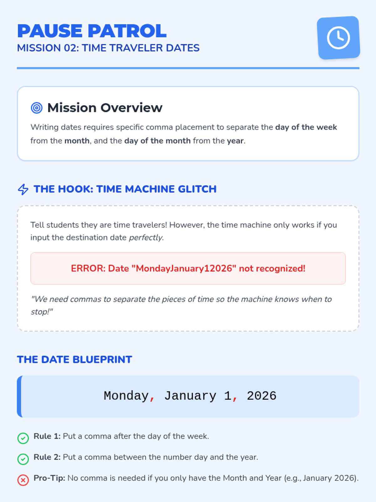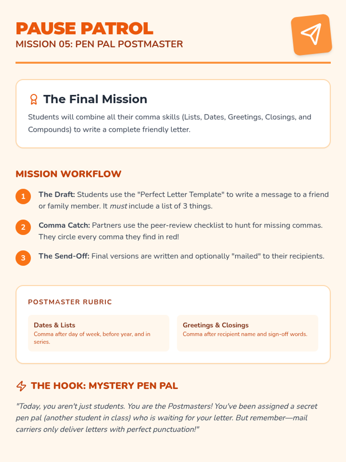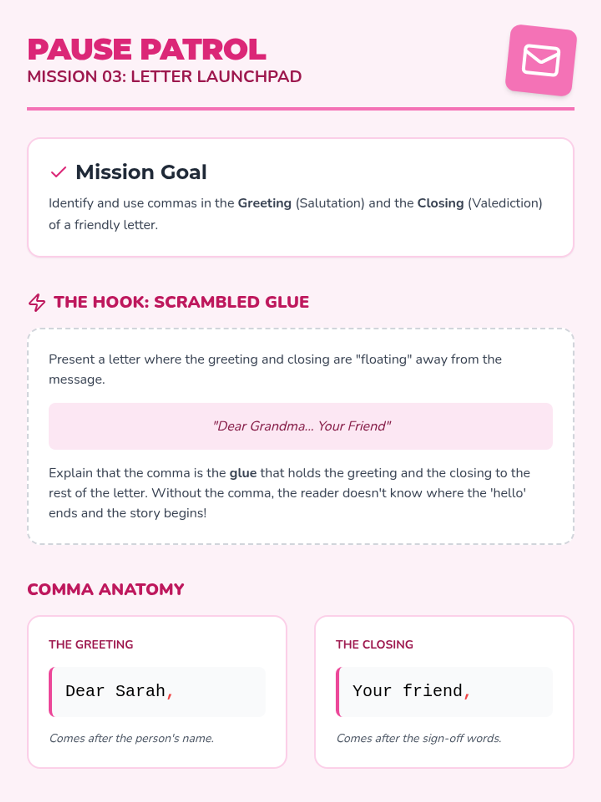 A 2nd-grade grammar workshop focused on the practical application of commas in lists, dates, and friendly letters. Students learn that commas act as 'yield signs' or pauses for the reader through hands-on activities, games, and writing projects.
