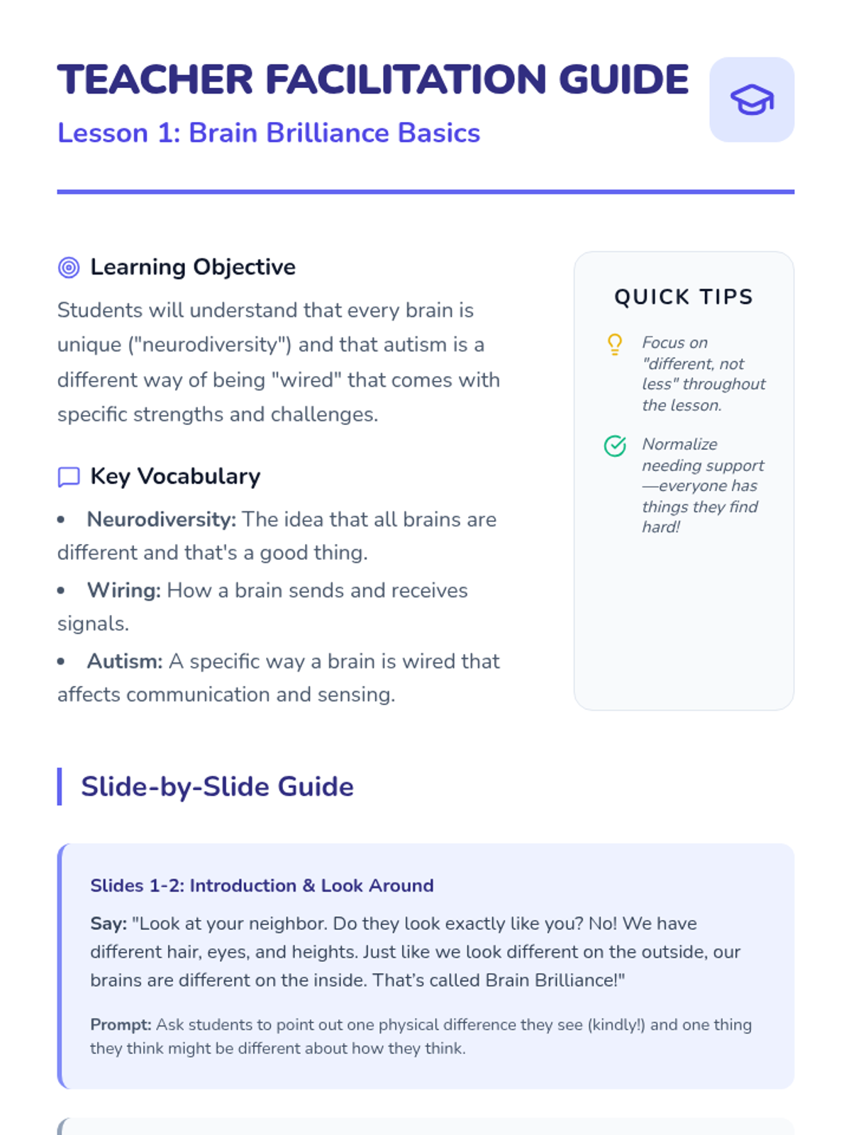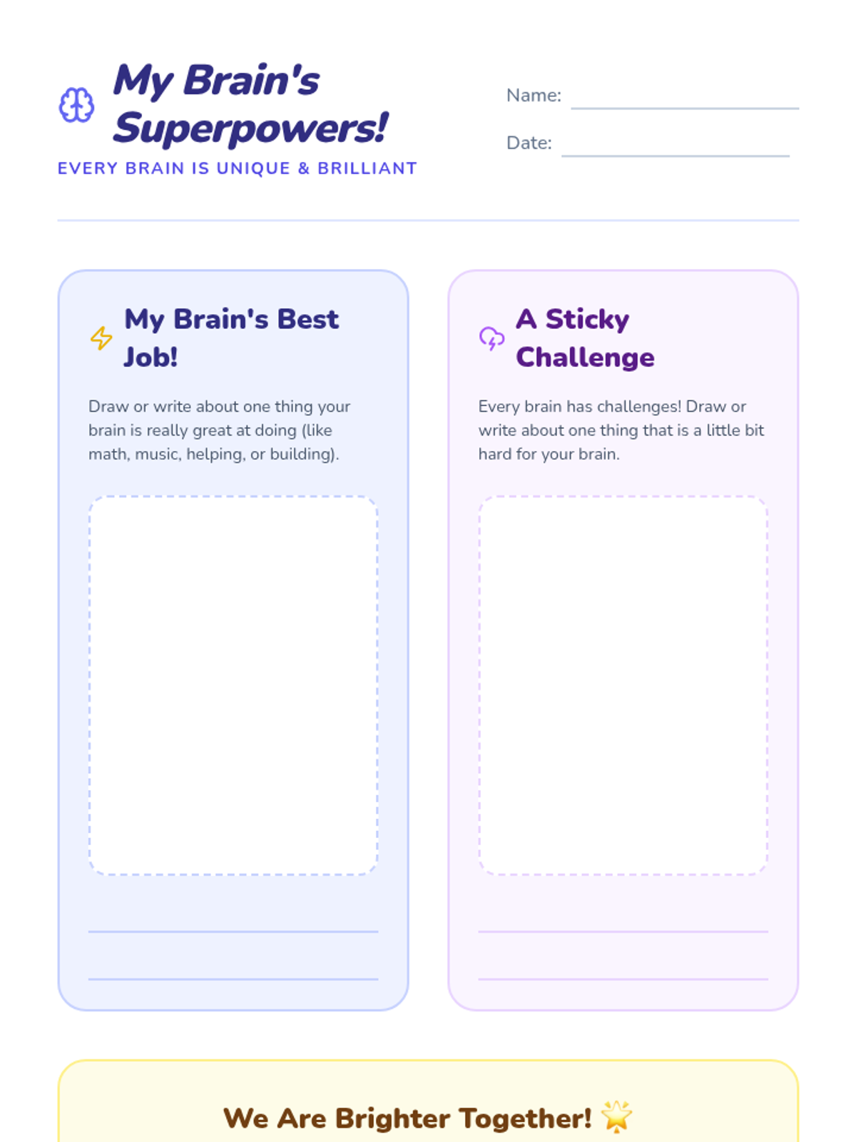 A 3-lesson sequence for K-4 students focused on neurodiversity, celebrating individual strengths, and building inclusive classroom communities. Students will learn that every brain is unique and that differences make a community stronger.