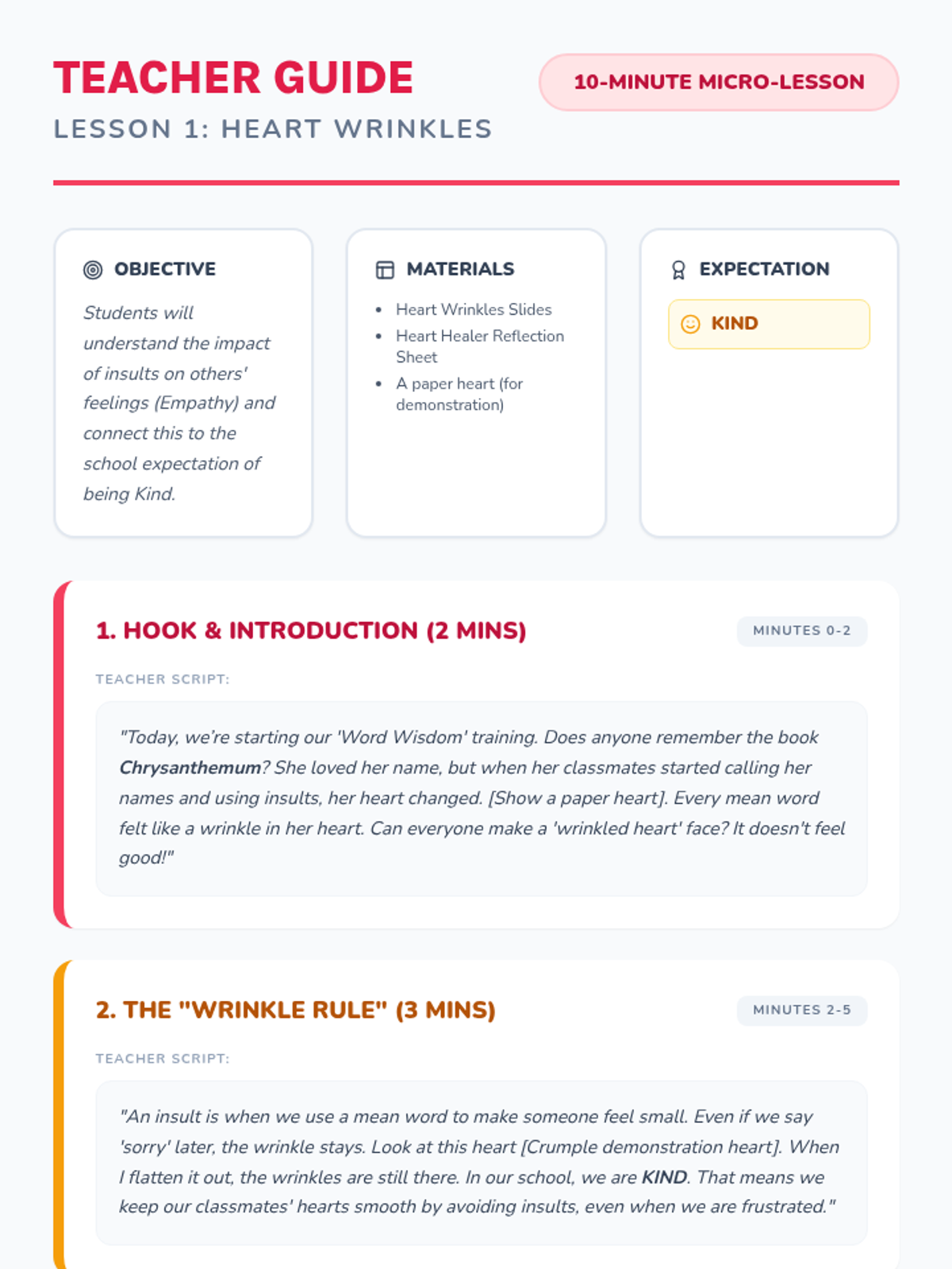 A series of four 10-minute micro-lessons designed for 3rd graders to build empathy, self-control, and respect. Using the 'Think Before You Speak' framework and the book Chrysanthemum, students learn to replace name-calling with responsible and kind choices aligned with school expectations.
