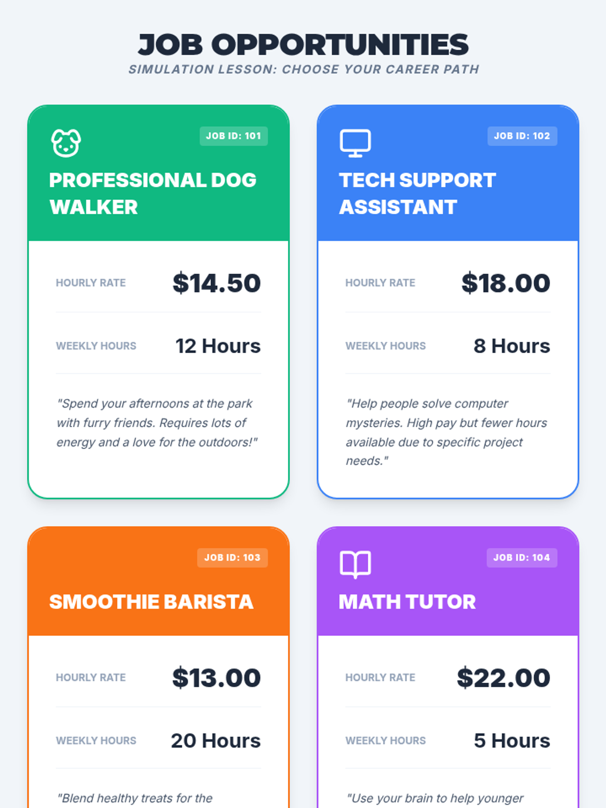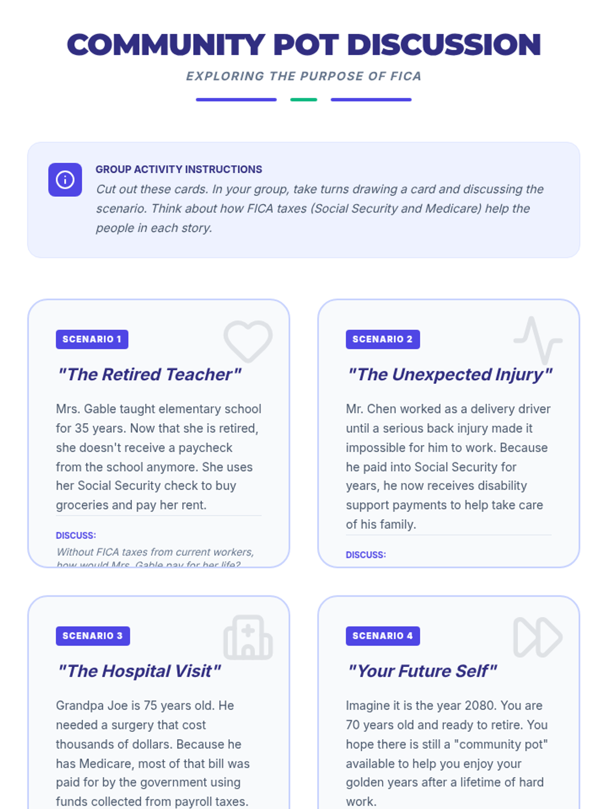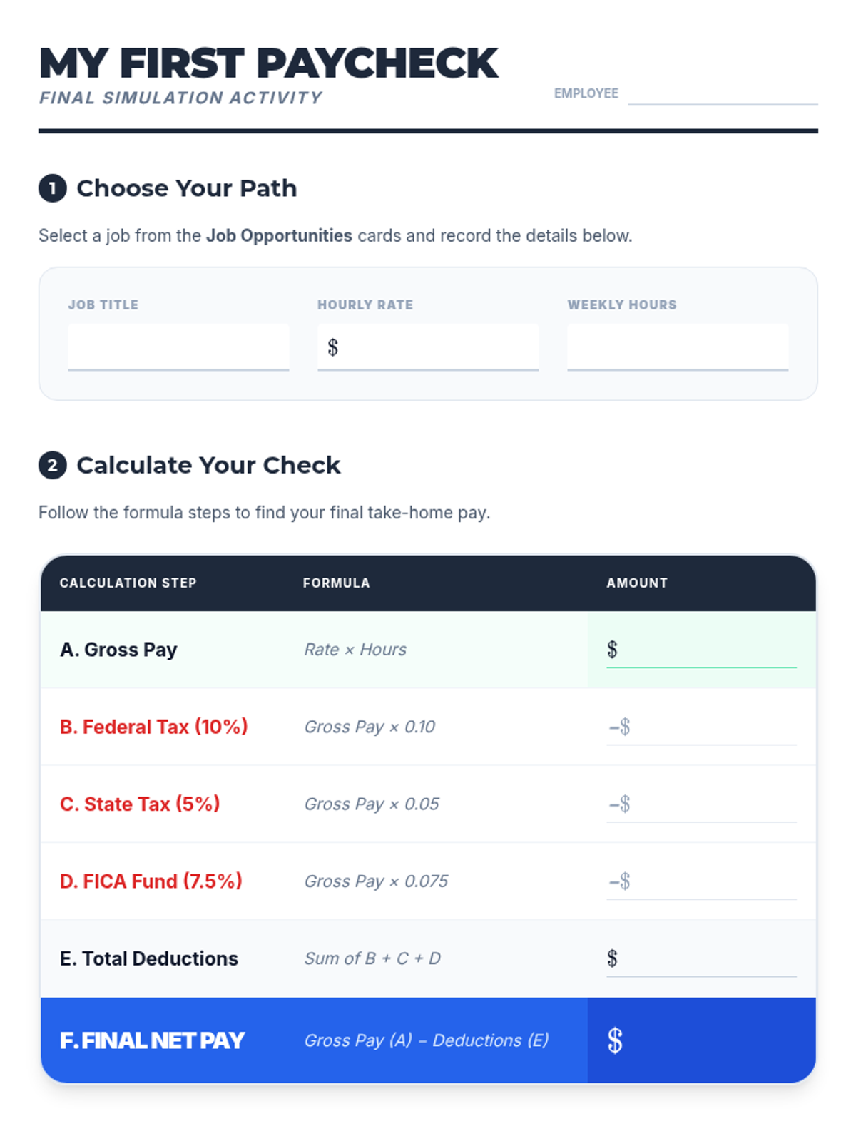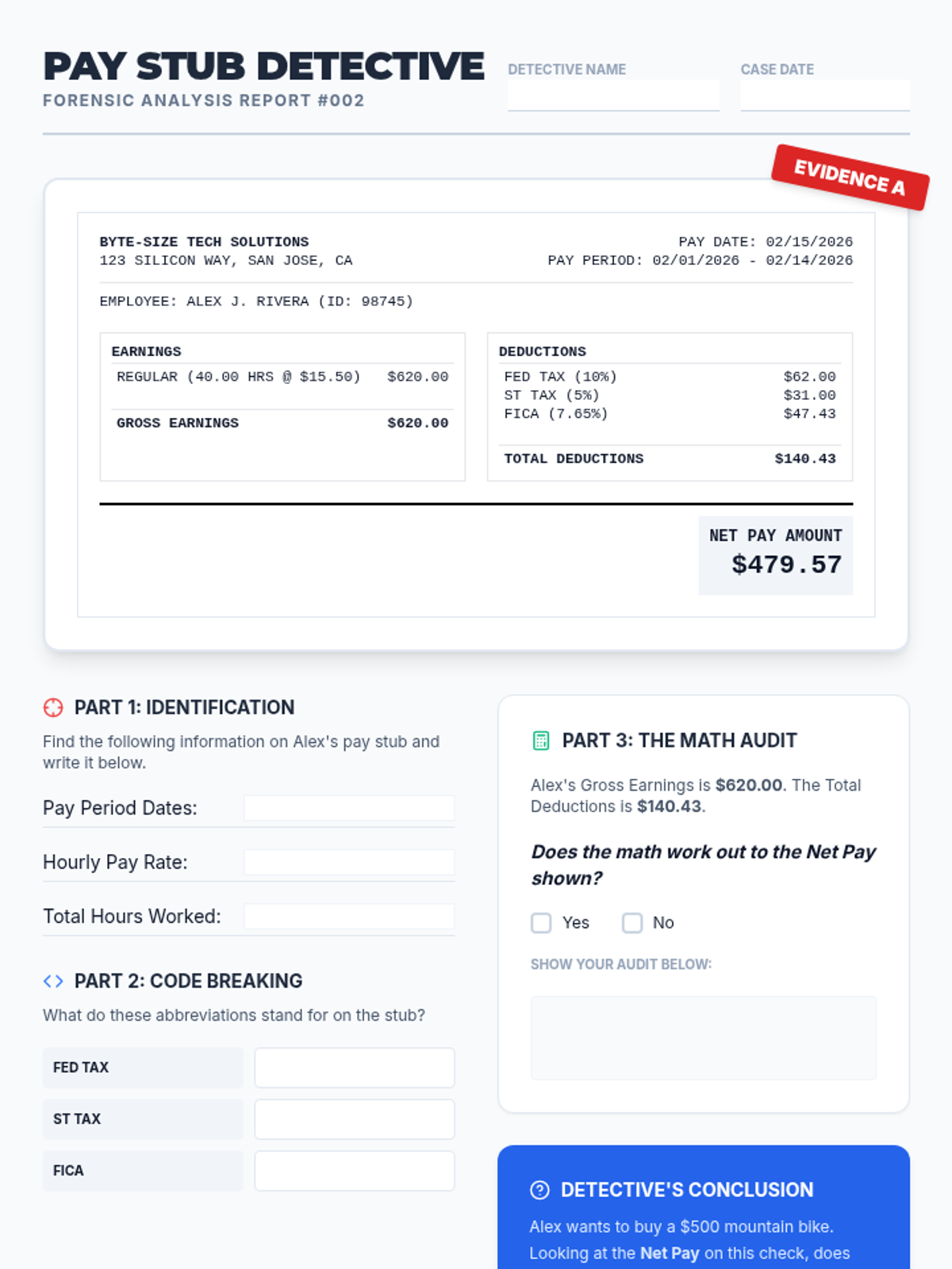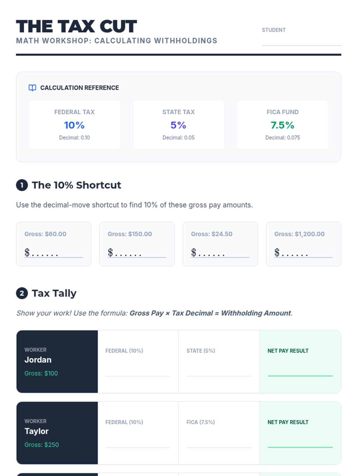 This sequence introduces 6th-grade students to the practical reality of taxes and payroll withholdings. Students learn to distinguish between gross and net pay, decode pay stubs, understand FICA contributions, and calculate proportional taxes to better understand their take-home pay.