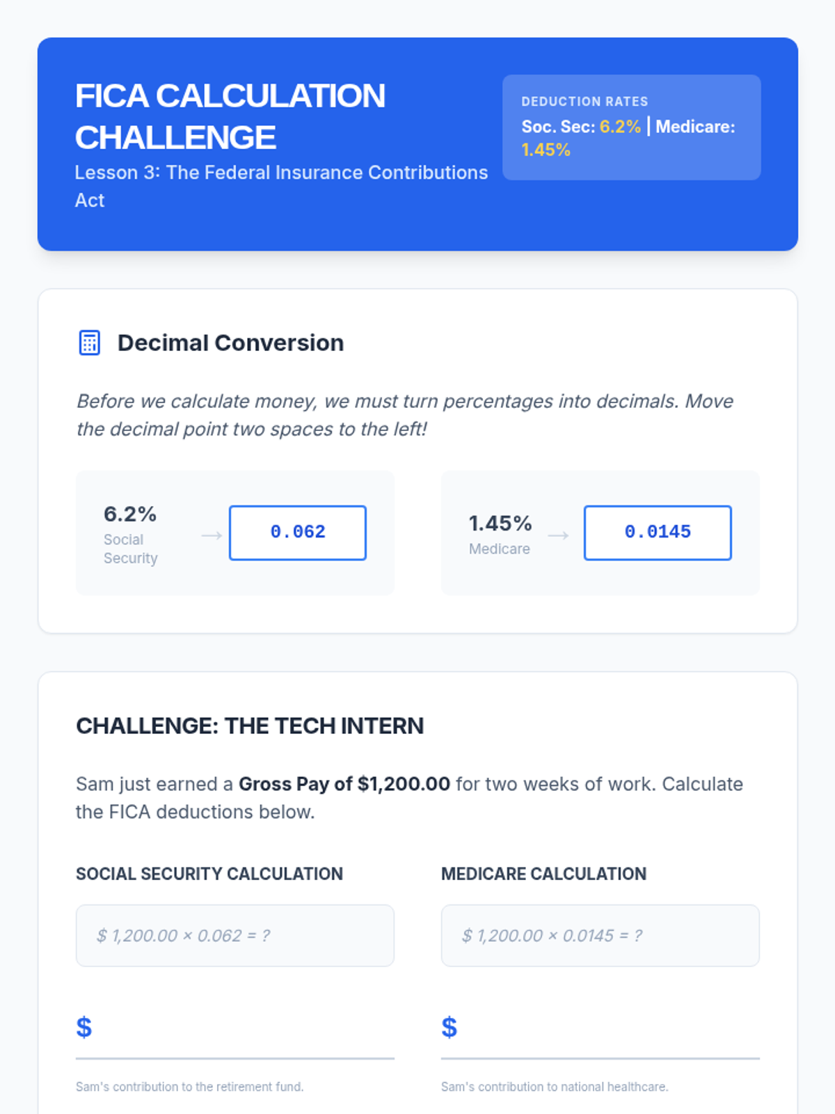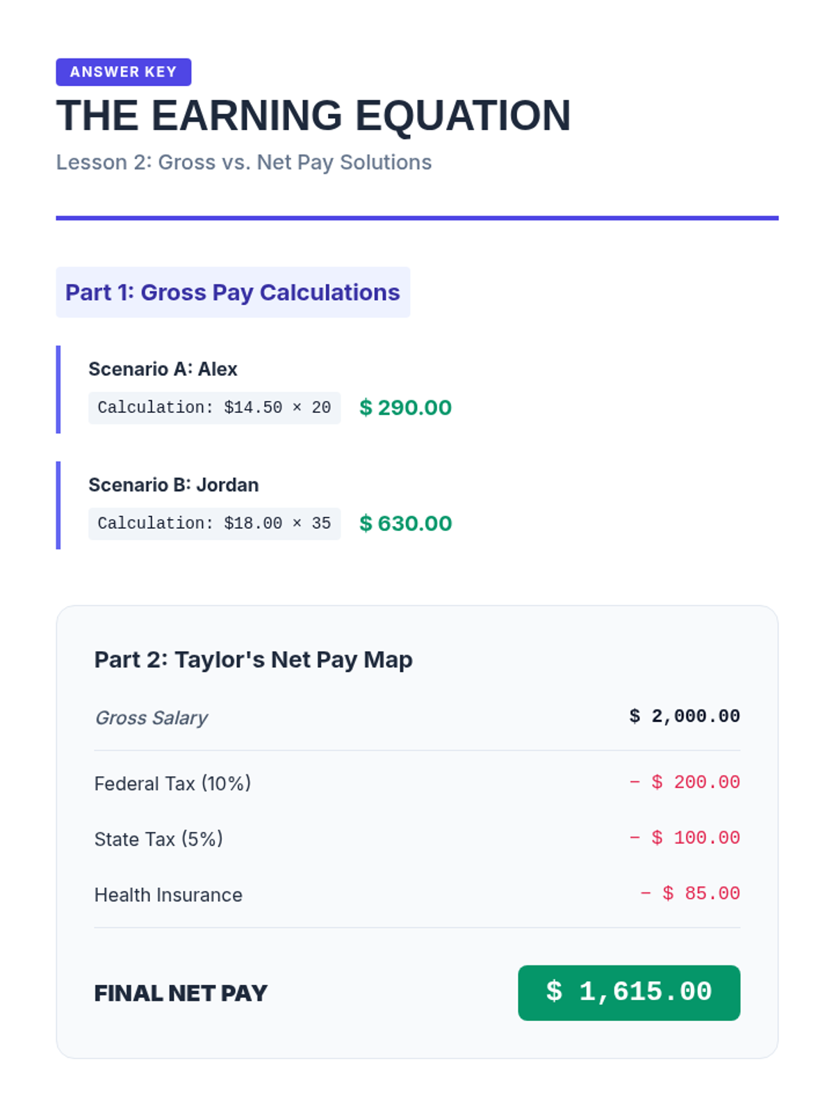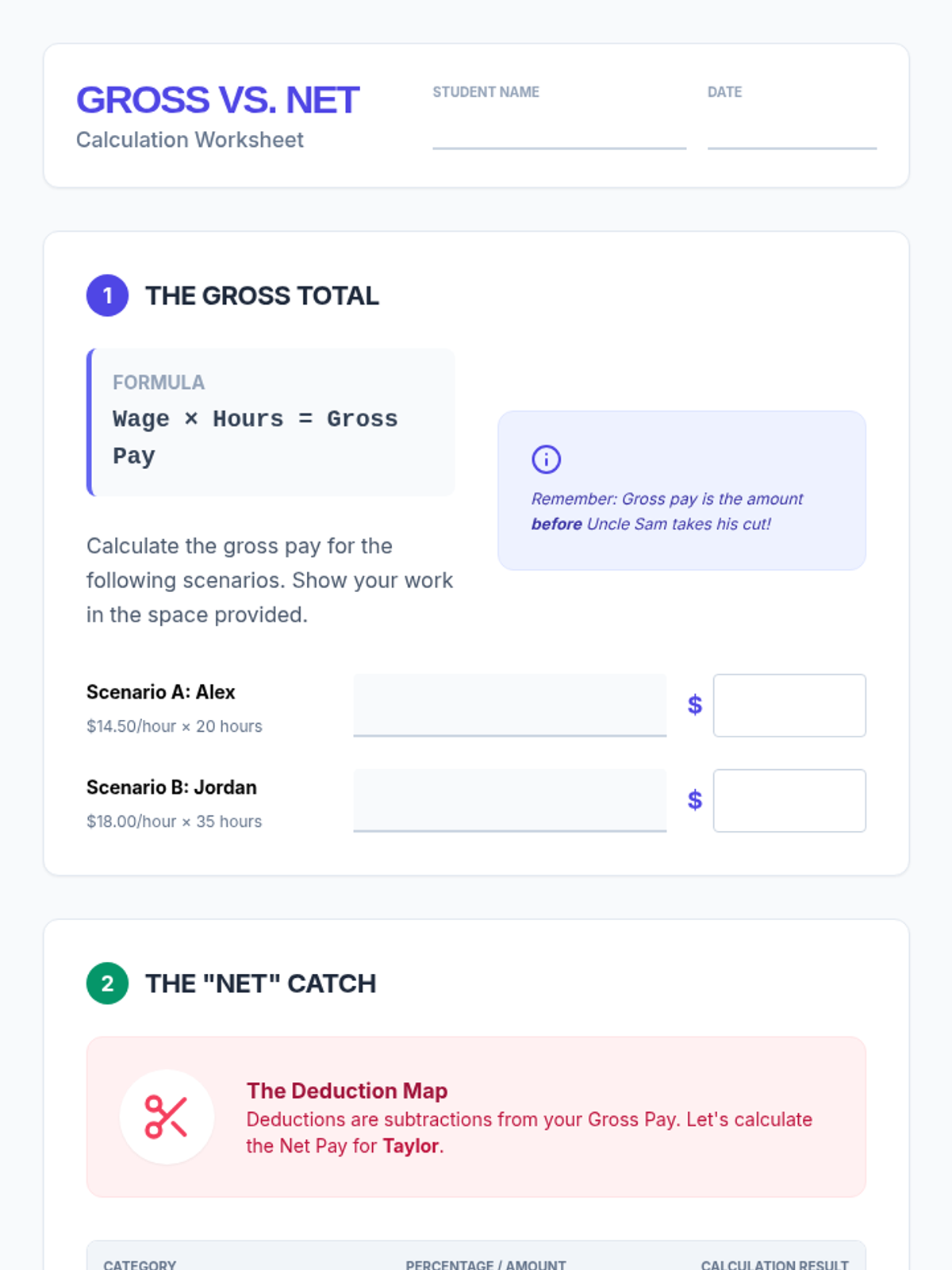 This workshop-style sequence focuses on the practical math and documentation associated with earning an income. Students simulate the onboarding process of a new job, learning to complete a W-4 form, deciphering the difference between gross and net pay, and calculating specific withholdings to understand their final take-home pay.