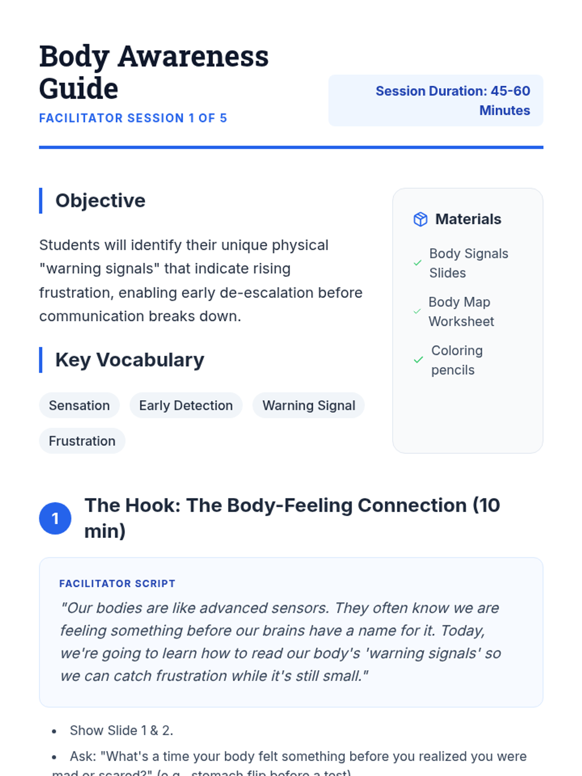 A 5-session curriculum for 6th-grade students focused on identifying emotional triggers, physical sensations of frustration, and practical strategies for de-escalation and respectful communication.