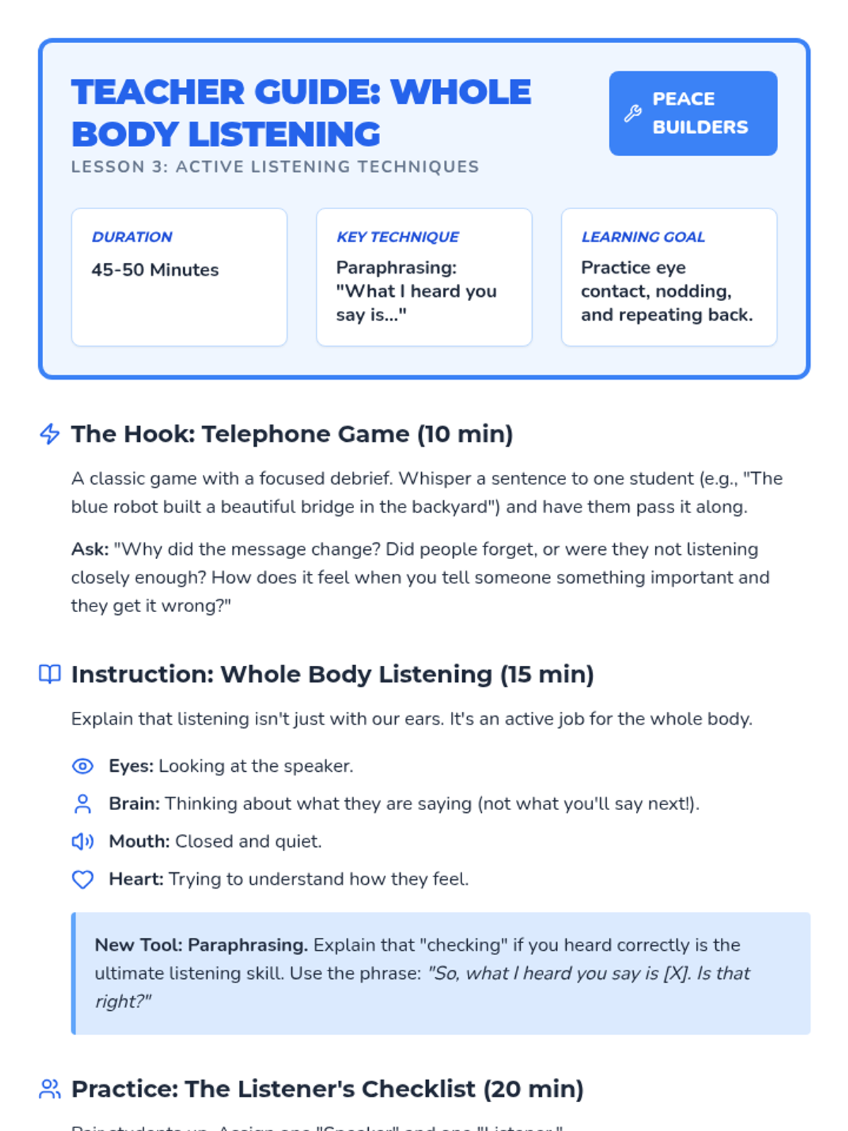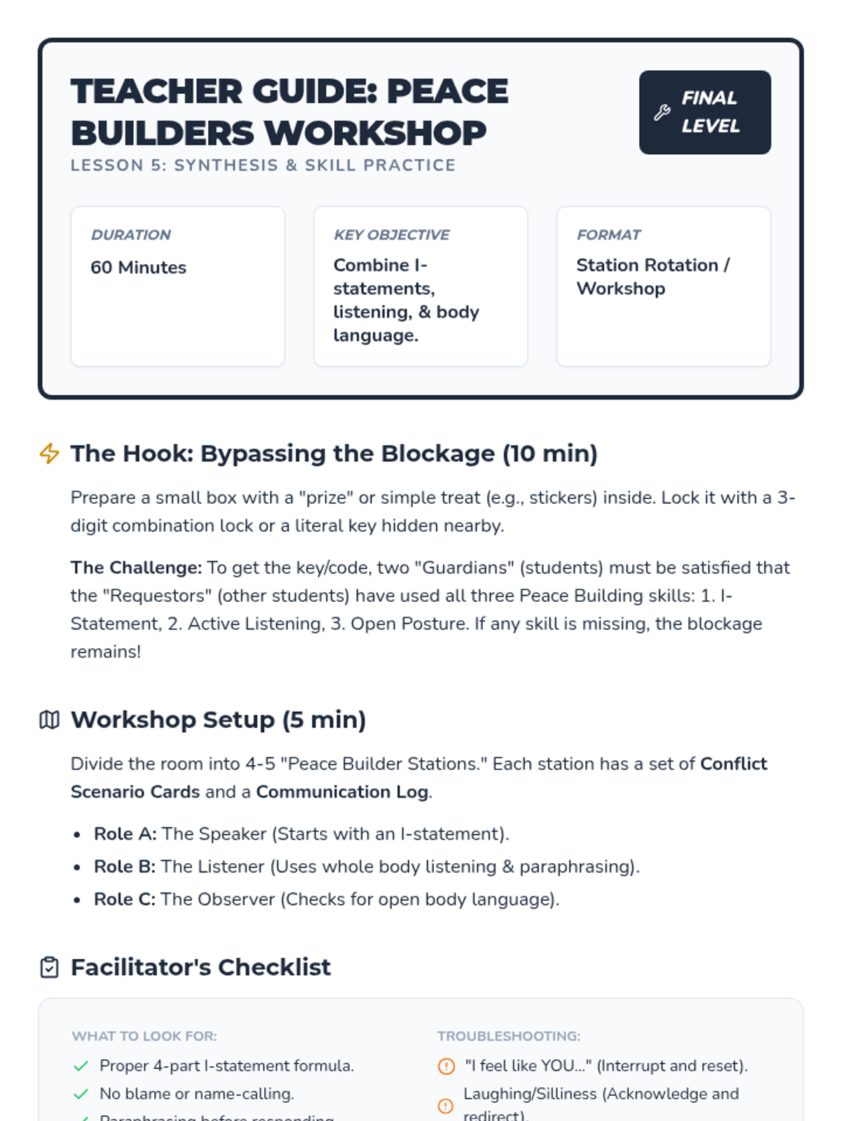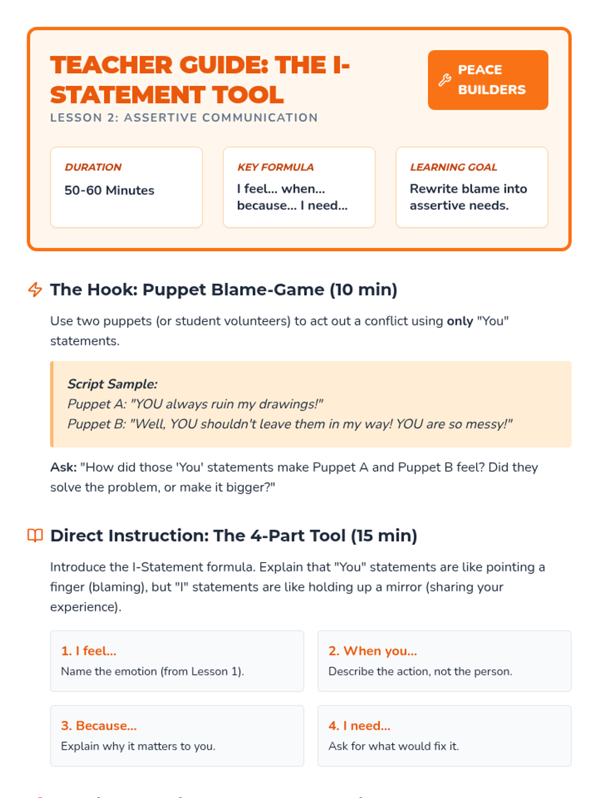 A comprehensive 5-lesson sequence for 3rd-grade students focused on building foundational communication skills for healthy conflict resolution, covering emotional awareness, 'I' statements, active listening, and body language.