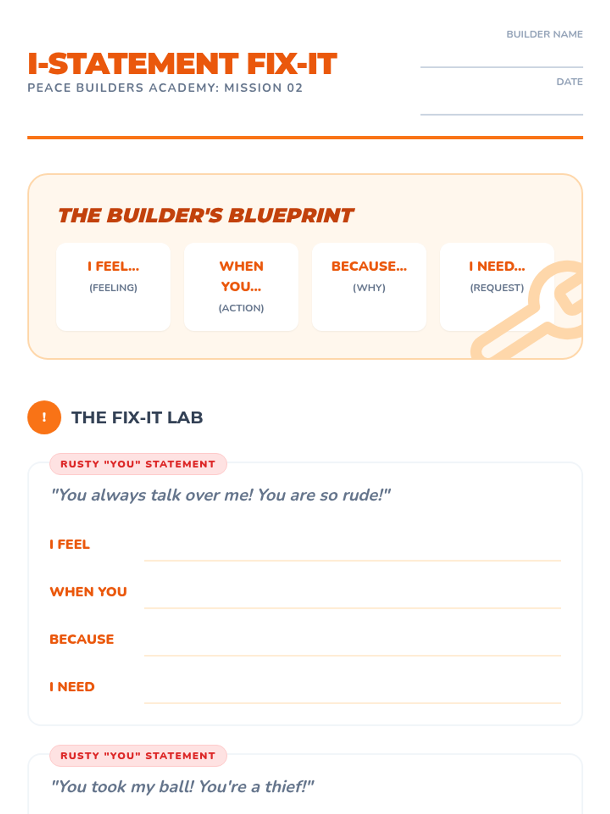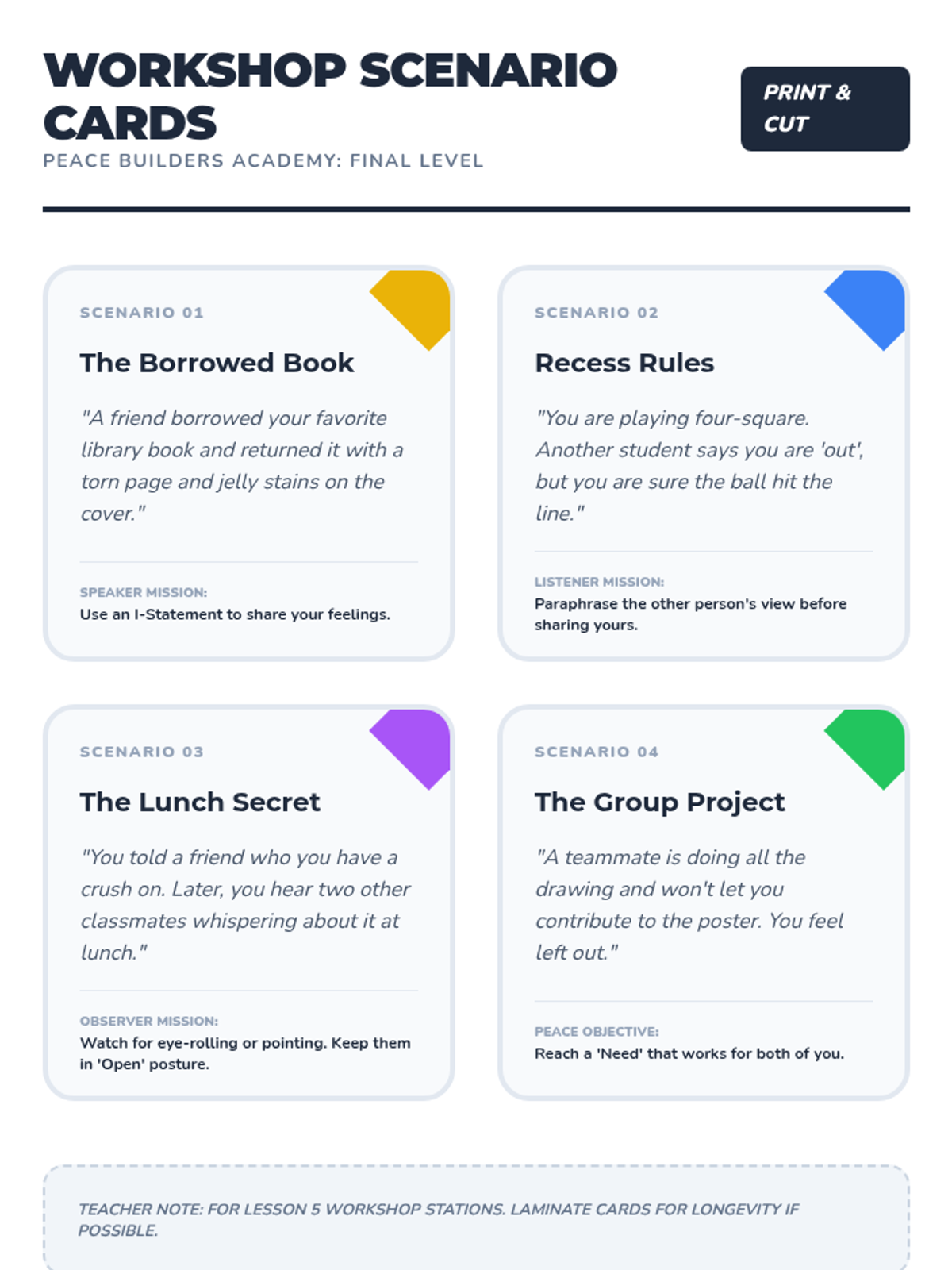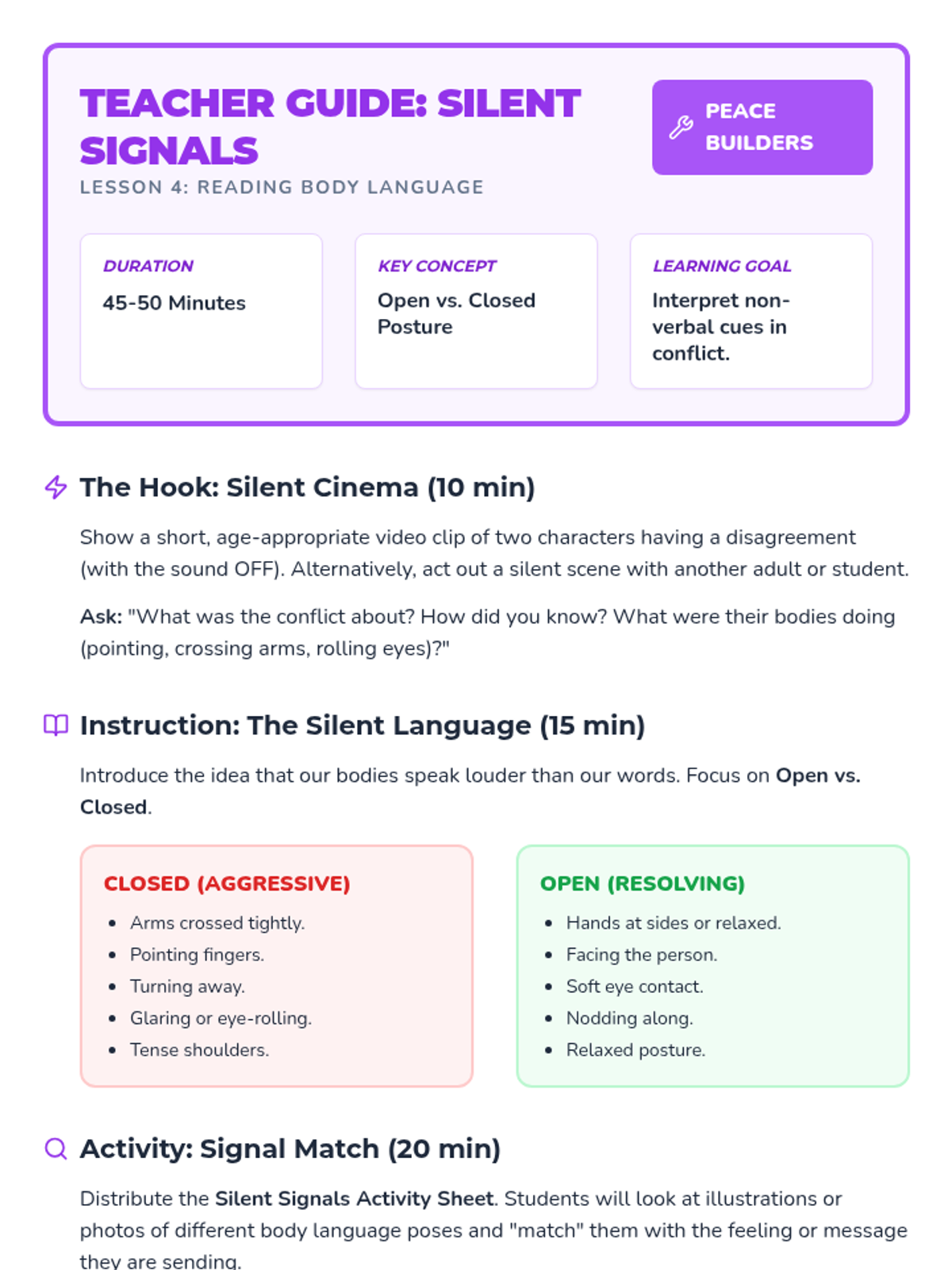 A comprehensive 5-lesson sequence for 3rd-grade students focused on building foundational communication skills for healthy conflict resolution, covering emotional awareness, 'I' statements, active listening, and body language.