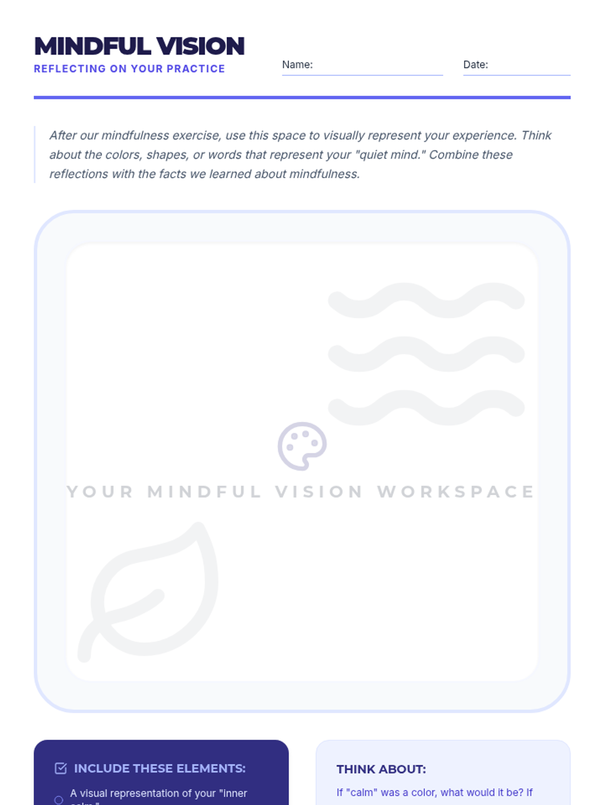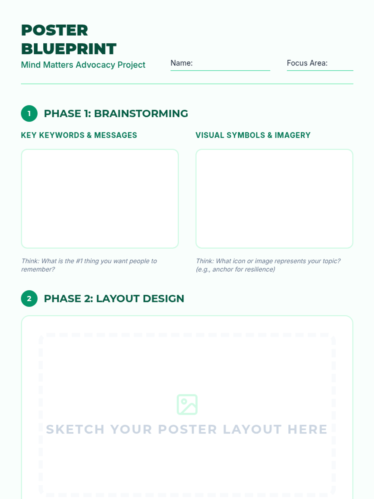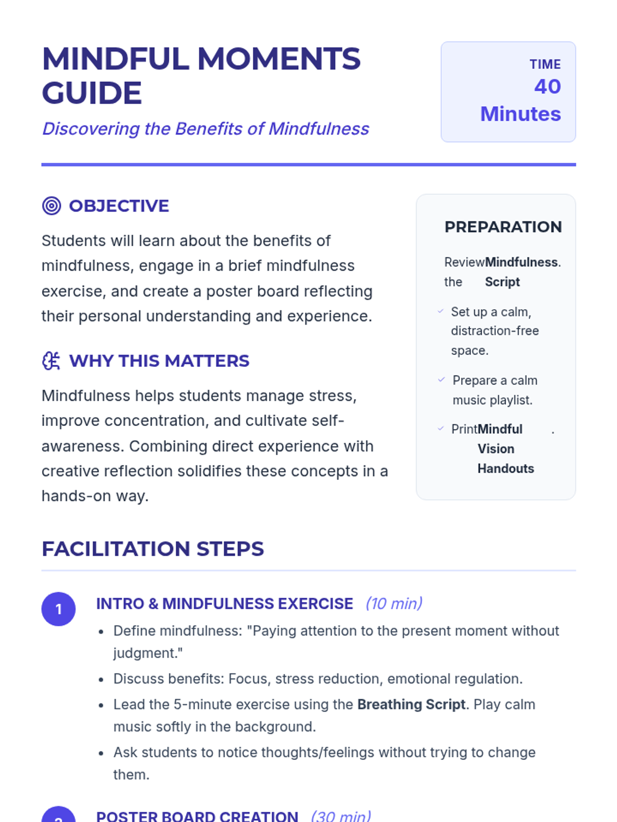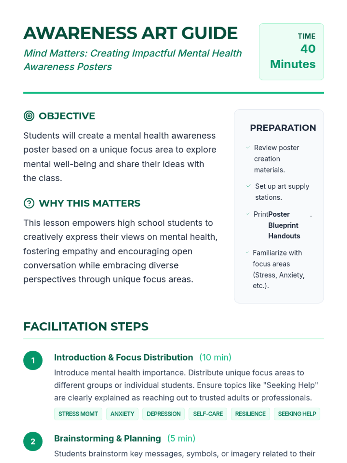 A two-part series for high school students focused on mental health awareness and the practical application of mindfulness. Students engage in creative advocacy through poster design and experiential learning through guided mindfulness exercises.