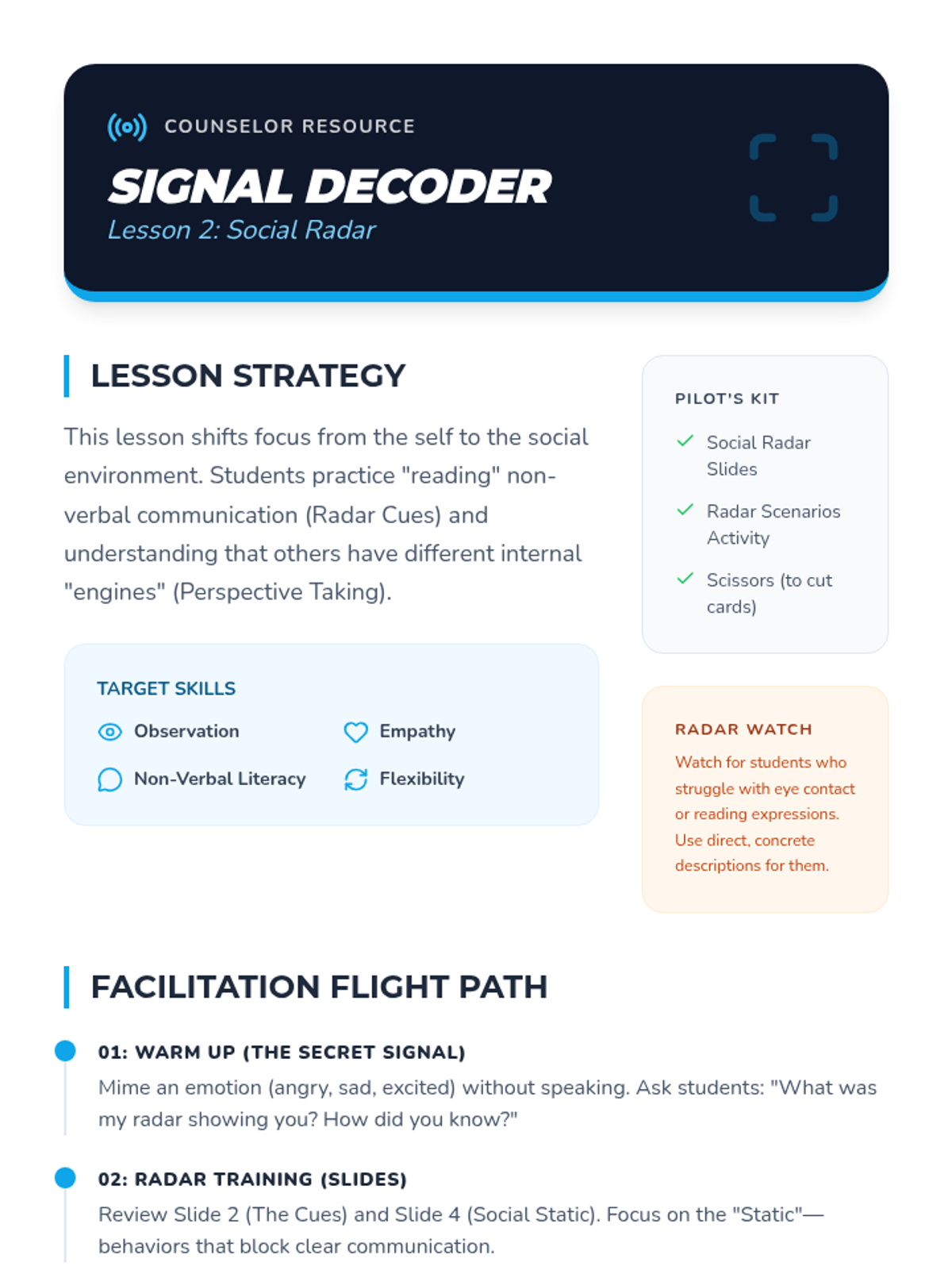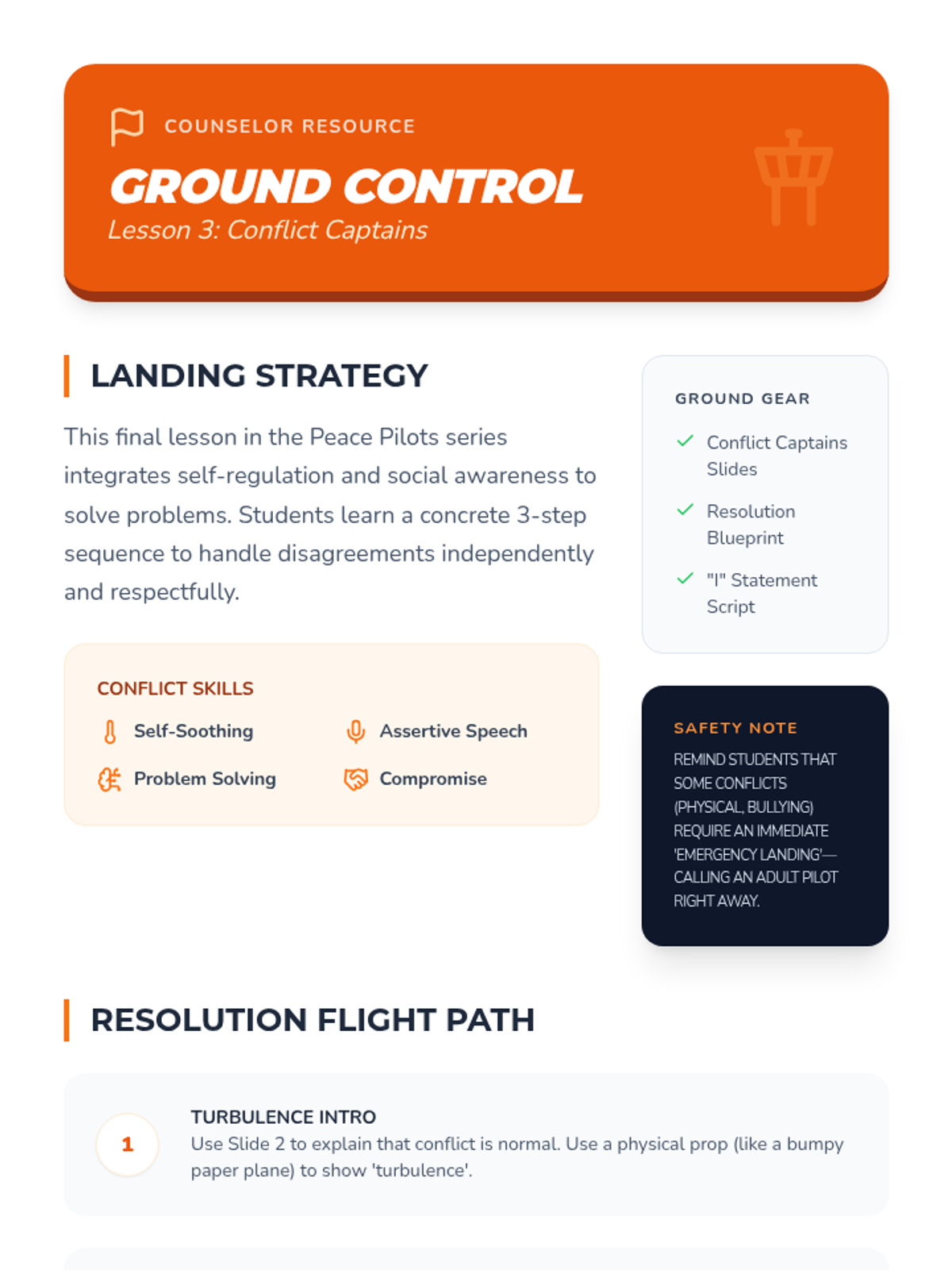 A comprehensive SEL program designed to help students navigate the skies of social interaction and emotional regulation. Students learn to monitor their internal 'engines,' read social 'radar,' and pilot their way through conflicts to a peaceful landing.