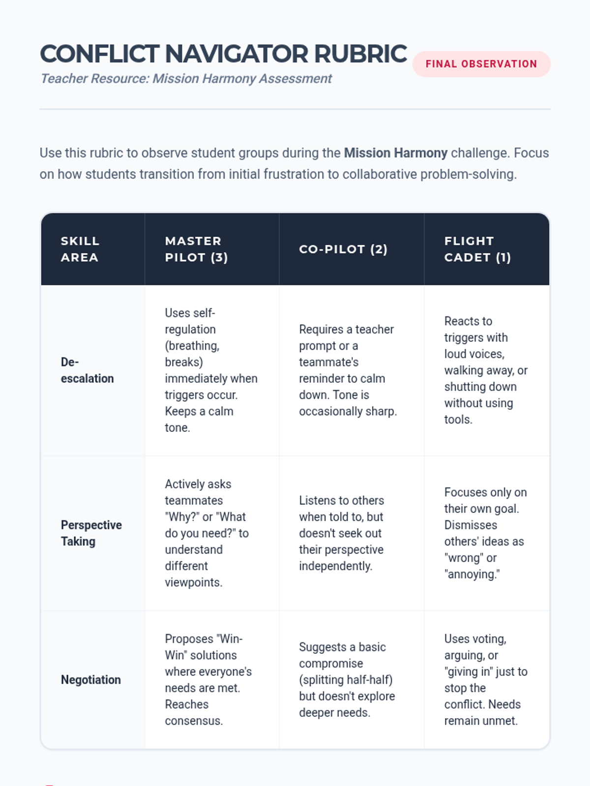 A comprehensive 5th-grade unit on navigating interpersonal conflict through perspective-taking, de-escalation, and negotiation. Students transition from identifying triggers to applying real-time collaborative solutions in complex group settings.