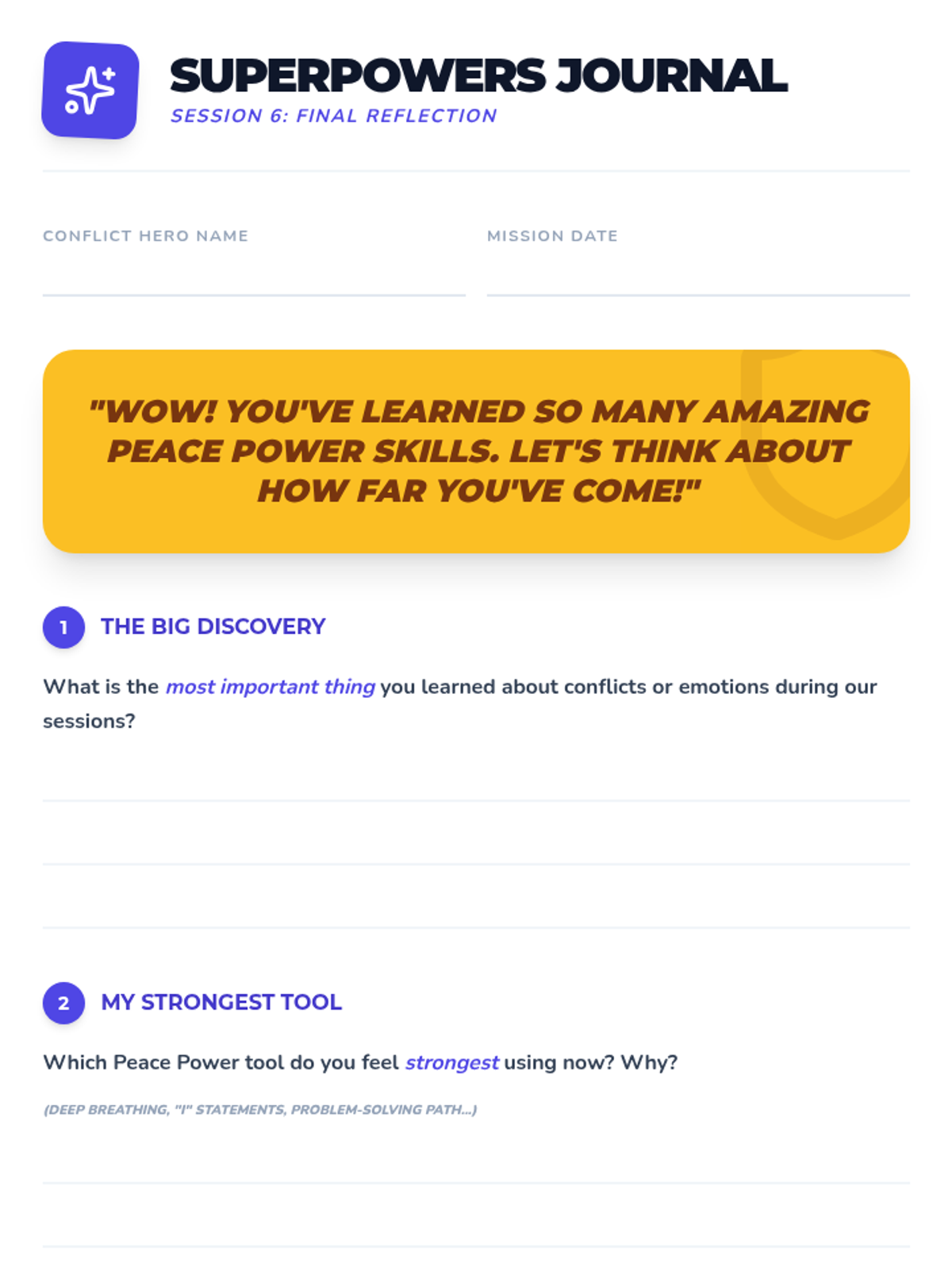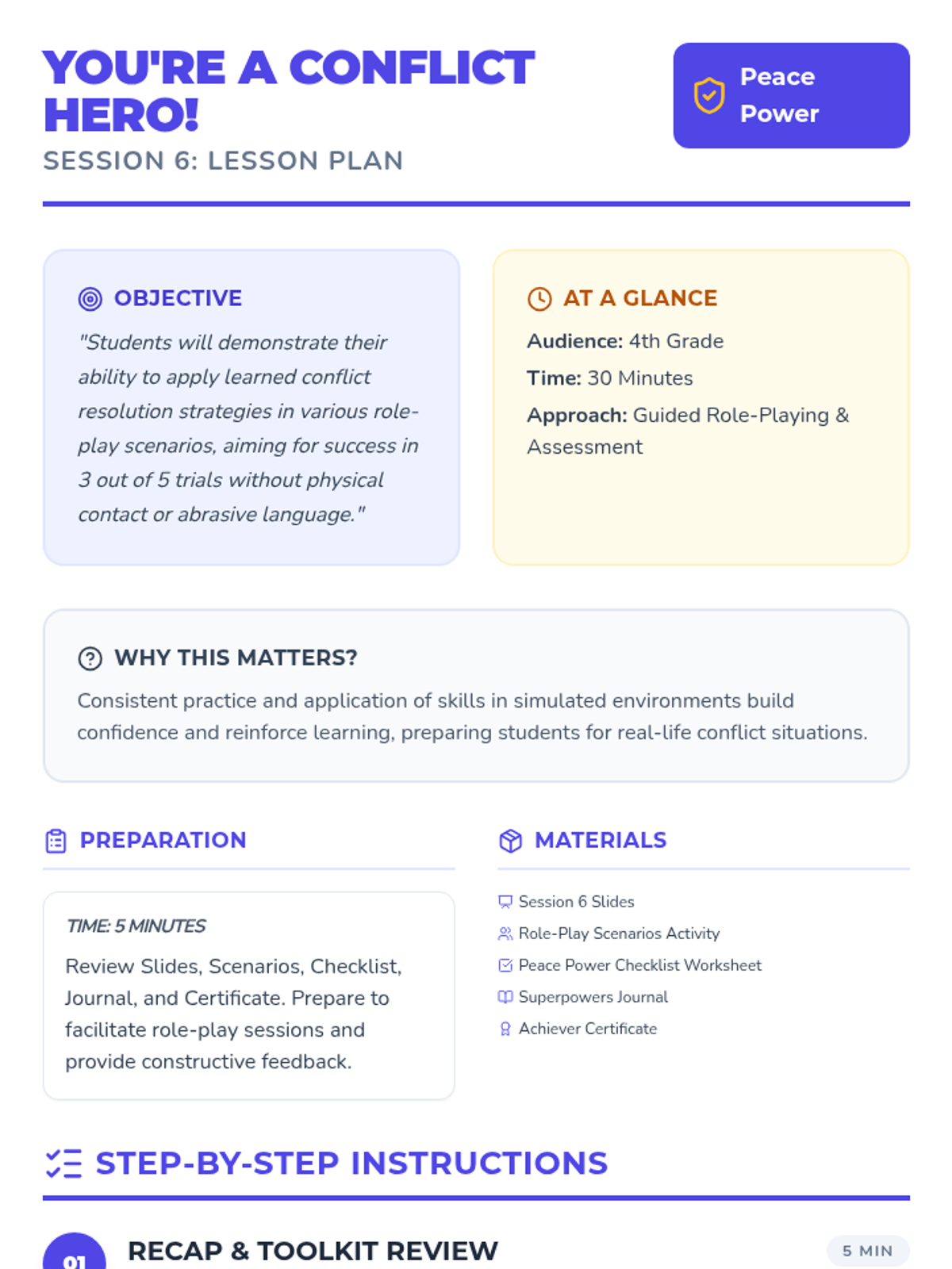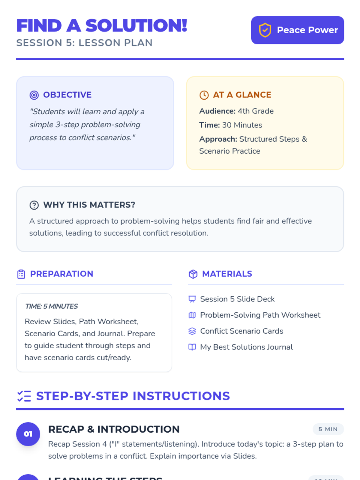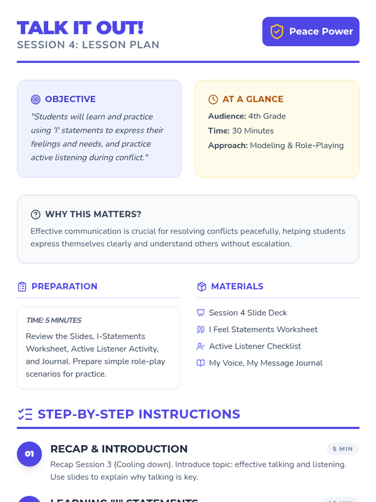 A 6-week individual counseling program for 4th-grade students to develop conflict resolution skills, moving from understanding conflict to demonstrating peaceful solutions in real-world scenarios.